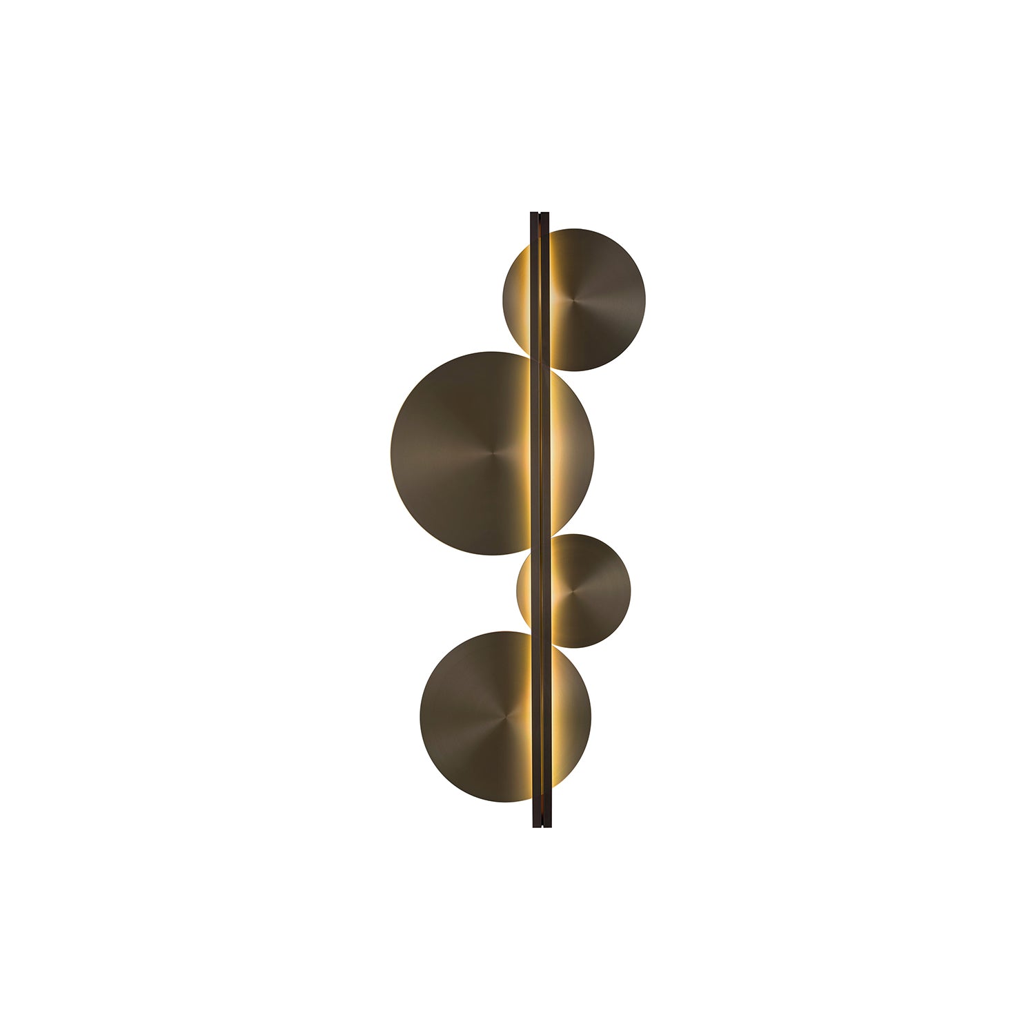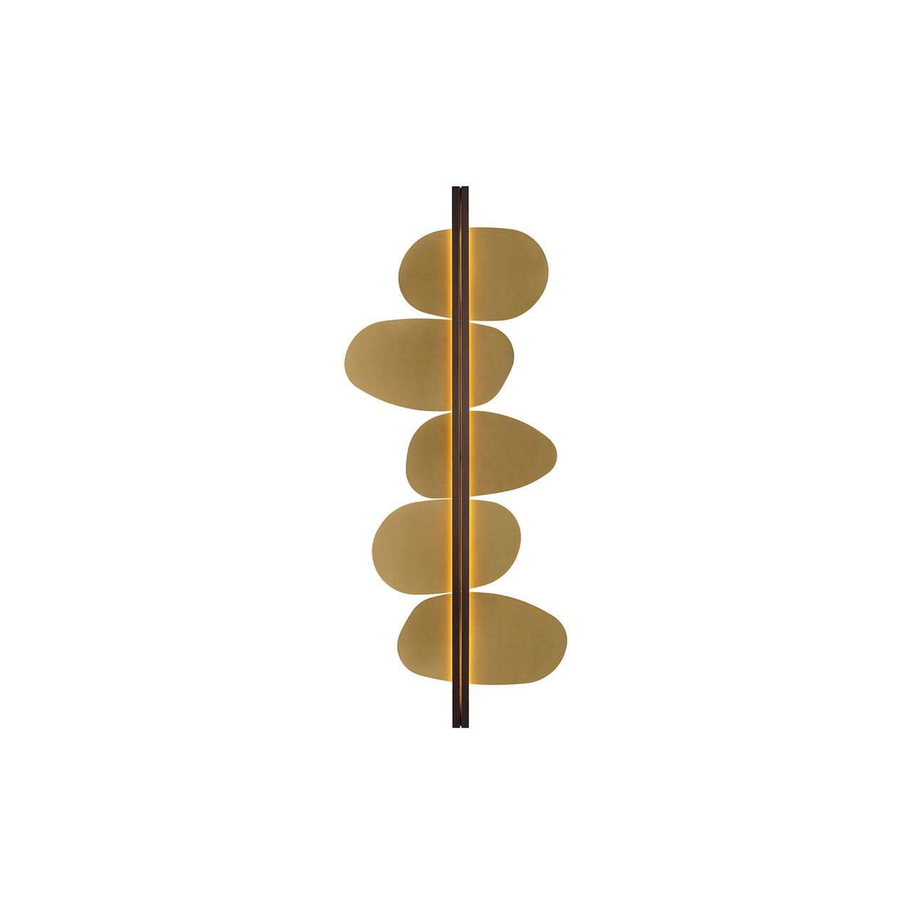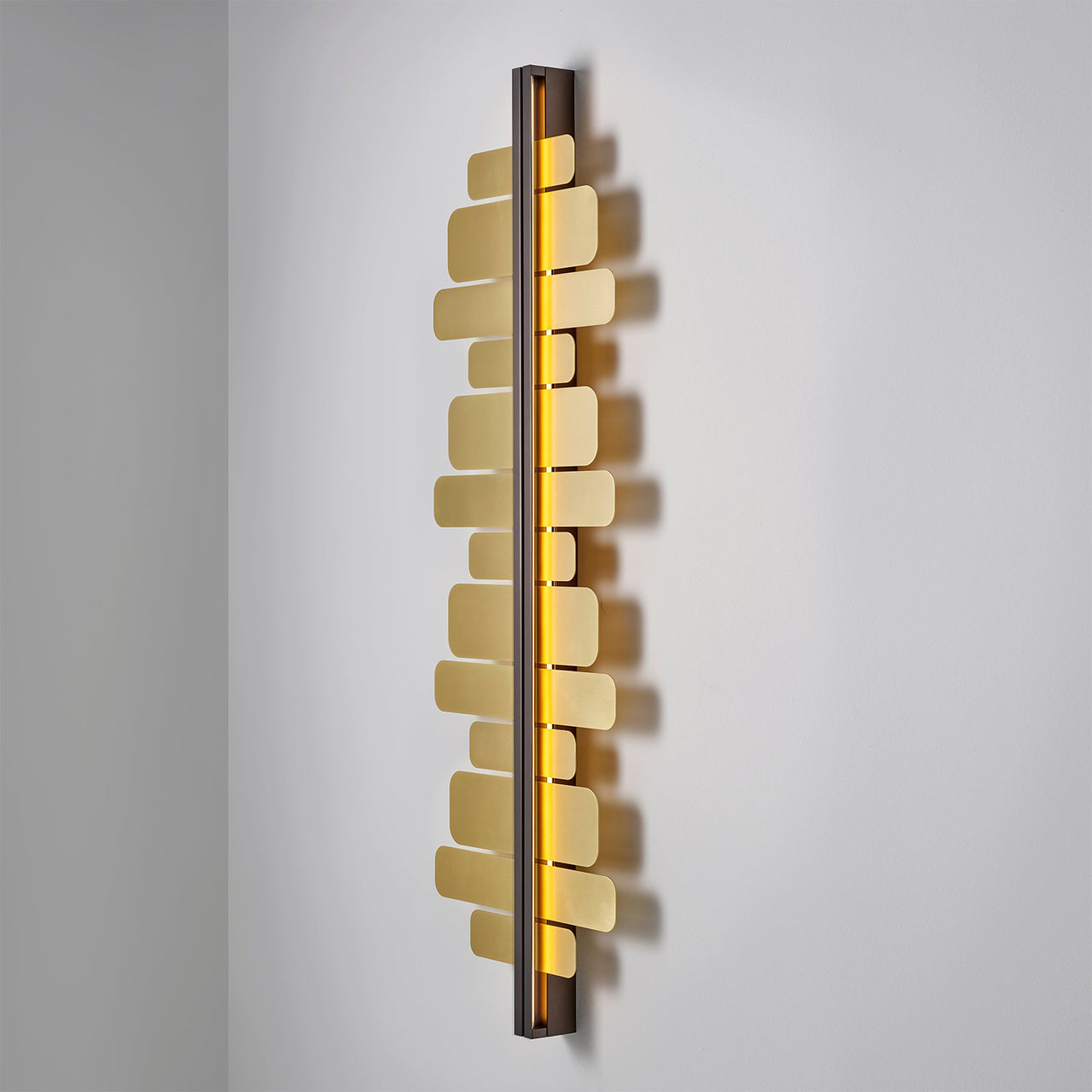 A fabulous focal point in any setting, Strate takes form as a grouping of abstracted shapes linked by a luminous line. CVL’s Émilie Cathelineau tips between wall light and authentic sculpture with multiple stylistic variations of the piece, each to be oriented either vertically or horizontally. Warmly diffused illumination from the integrated LED is reflected in the solid-brass structure handcrafted in France with varied satin finishes of brass, graphite, nickel and copper.