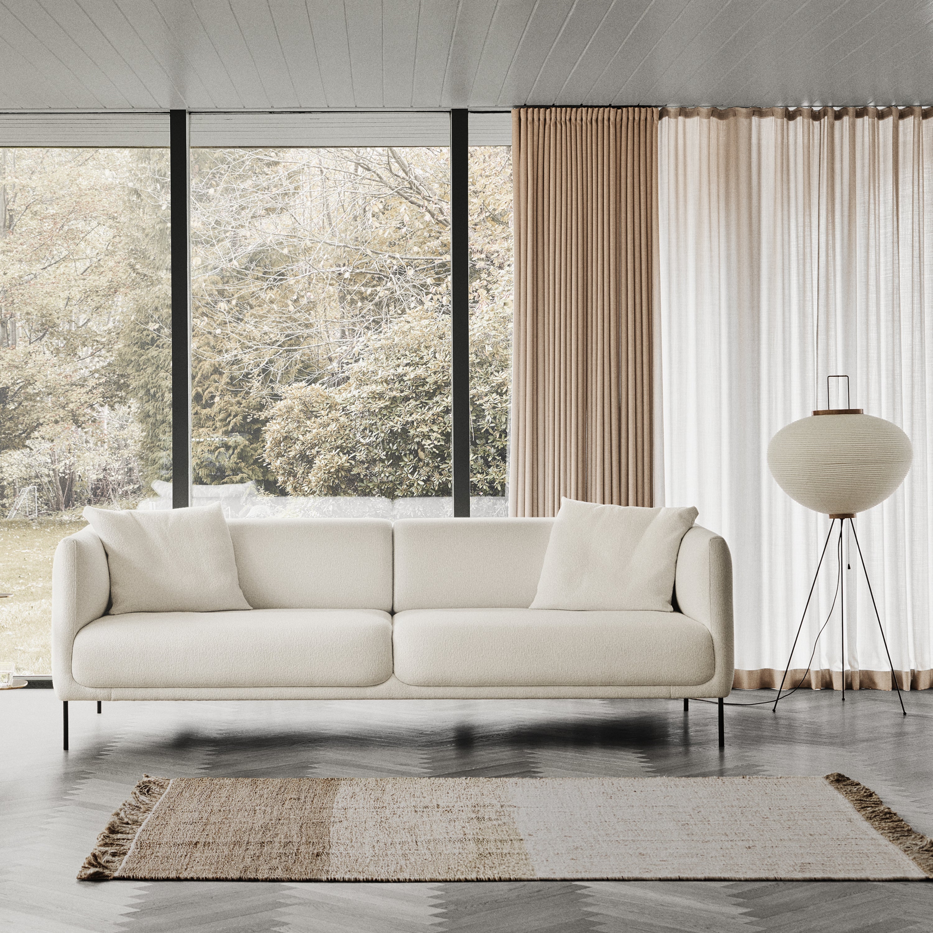 With Konami 2-1/2 Seater, much like its sister seating, the sleek lines and subtle armrest curves — named for the Japanese words “ko” and “nami,” meaning “little wave” — lend a sculptural presence from any angle. English designer Damian Williamson essays a streamlined expanse, free of loose cushions or extraneous detail with precisely tailored upholstery in a curated selection of fabrics and realized by Fredericia’s master craftsmen. Structured with a wooden frame supported by a steel base and slim legs in either brushed stainless steel or black powder coat and plumped with cold-cured foam, the sofa ensures comfortable seating, conversing or reclining for hours on end.