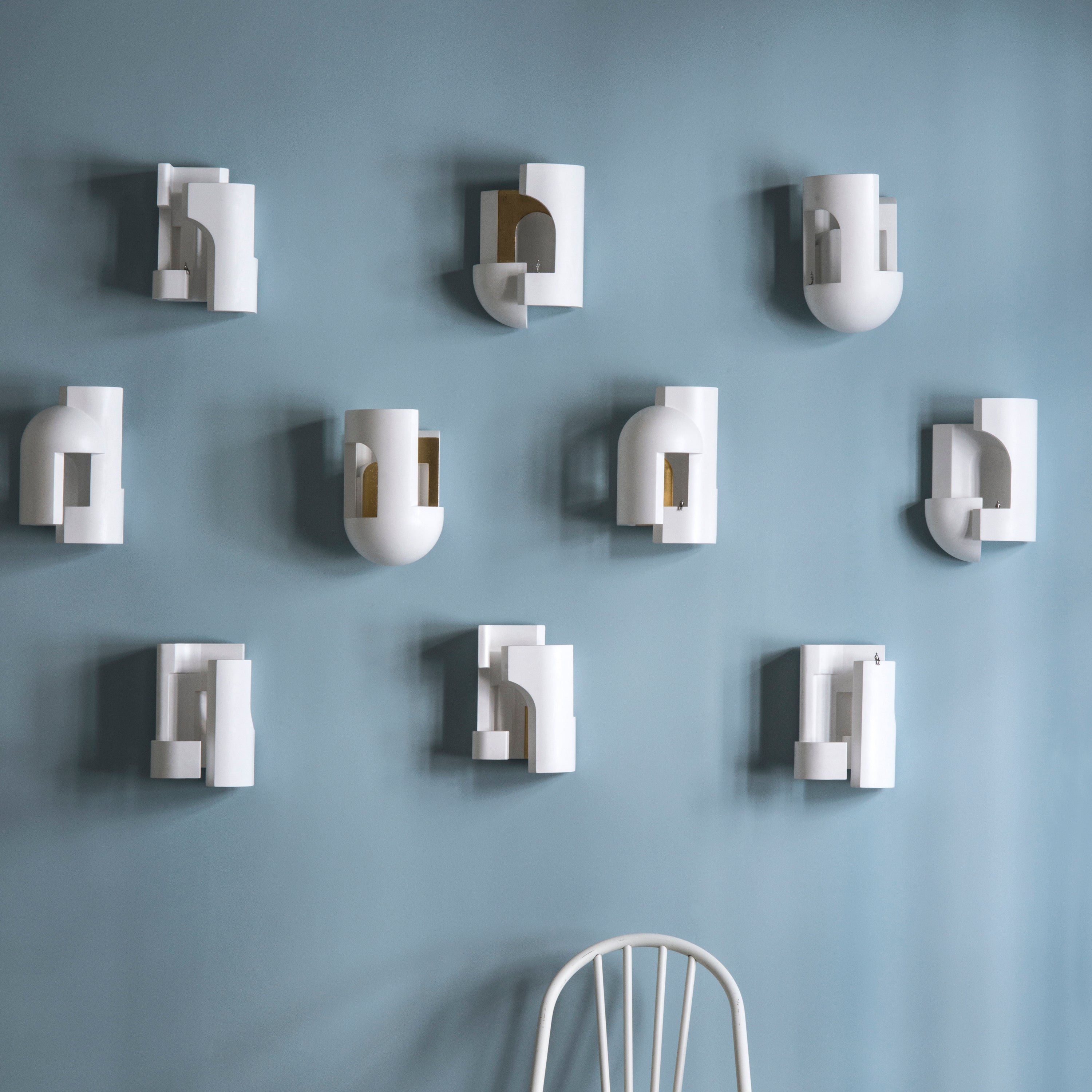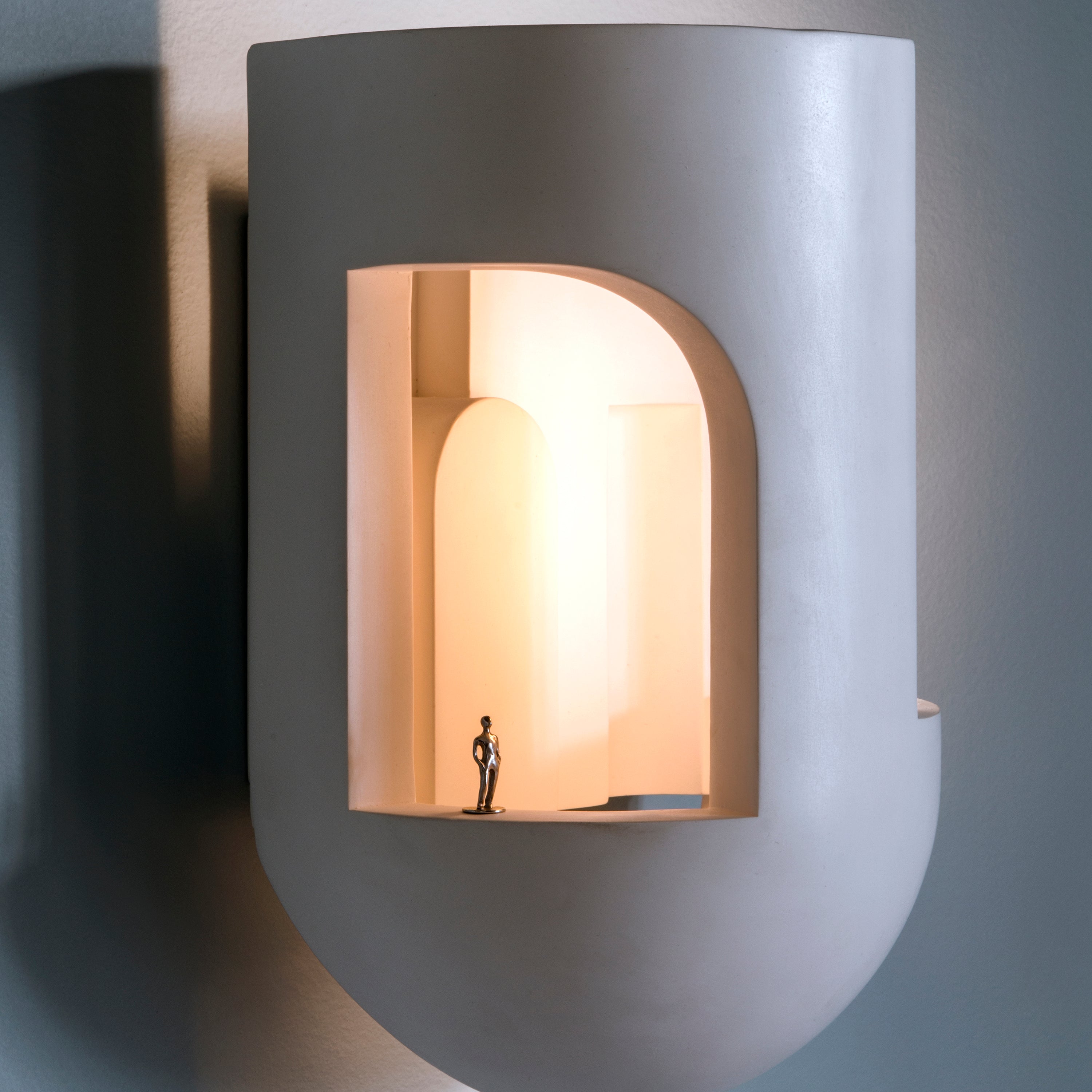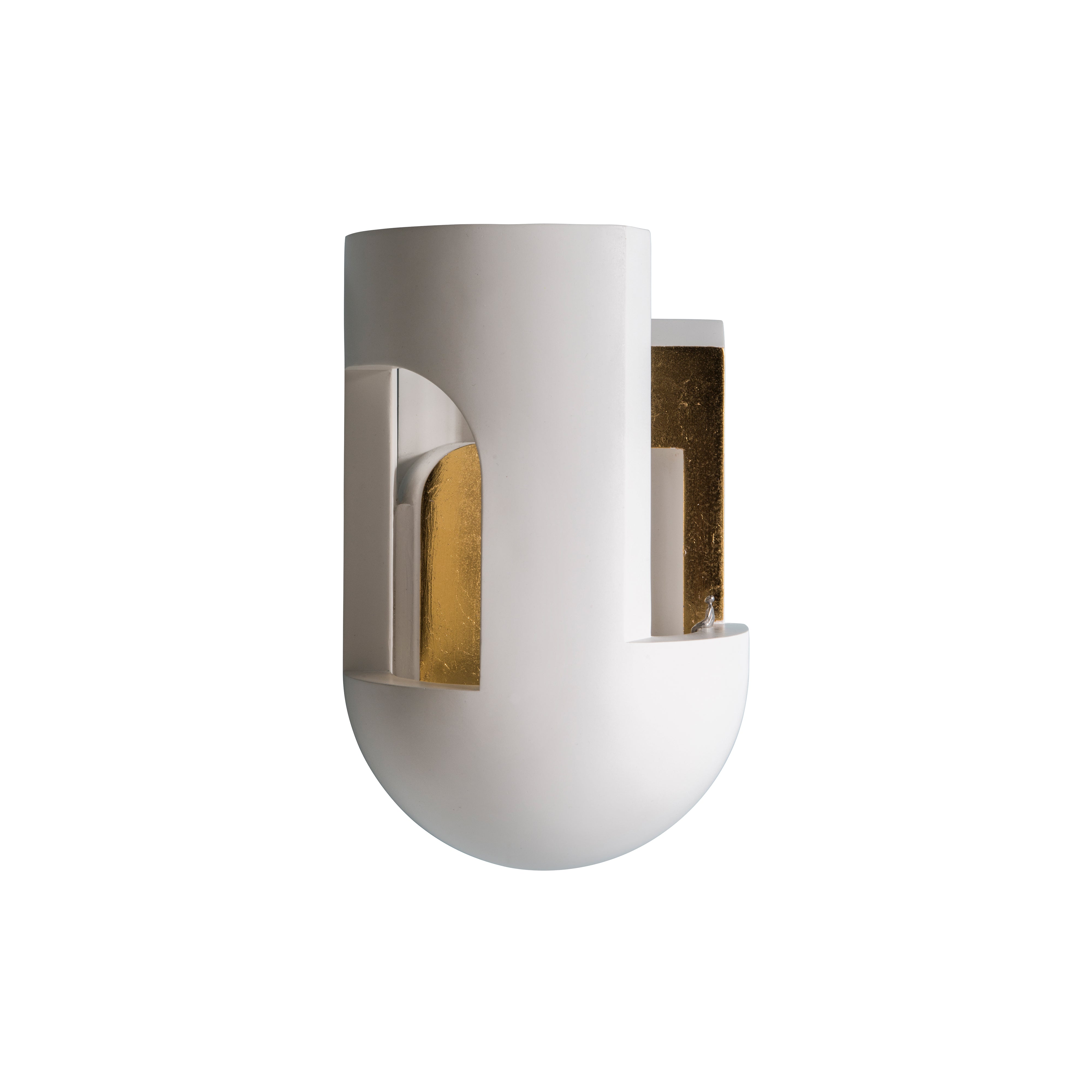 Soul Story 3, like its sister wall lights, was born of a chance meeting between French-Lebanese designer Charles Kalpakian and DCW Èditions’ Frédéric Winkler at a design fair. In white plaster, with or without gold leaf decoration, the designer plays on the image of a dusky night suddenly being pierced with a surreal ray of light in the varied constructions lit by an integrated LED. Kalpakian even includes a doppelgänger of himself in the small metal figure standing watch, inviting further contemplation of the configuration while also acting as a type of signature.