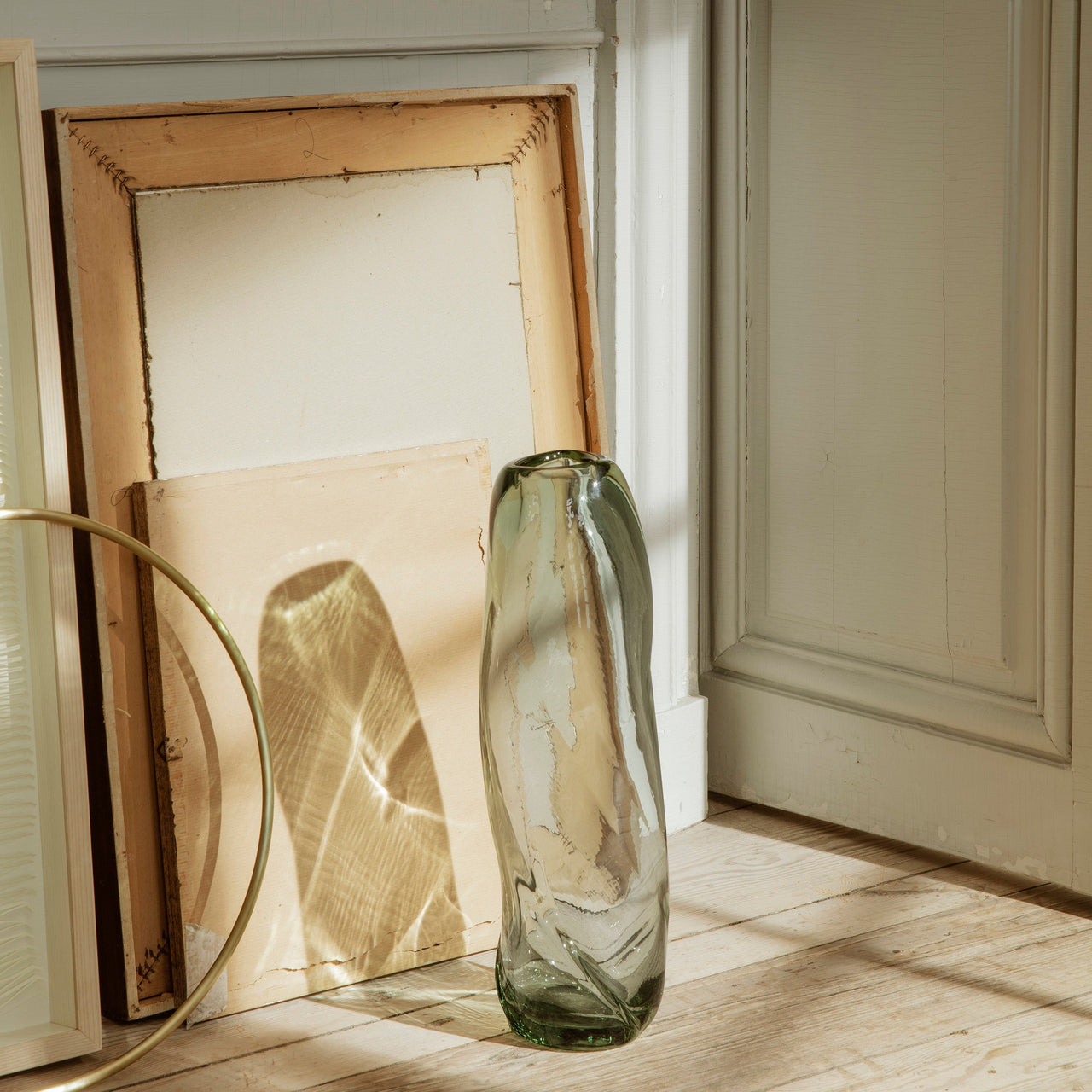 Mouth-blown and impressively oversized, Ferm Living's colored vase brings to mind a whirl of cascading liquid. With its translucent hues reminiscent of a forest glade, Water Swirl creates a sense of motion and effervescence even though it is crafted from solid, massive glass. Fill the vase with flowers or branches or style it solo and enjoy how the sun filters through the twists and turns of the intriguingly meandering form.