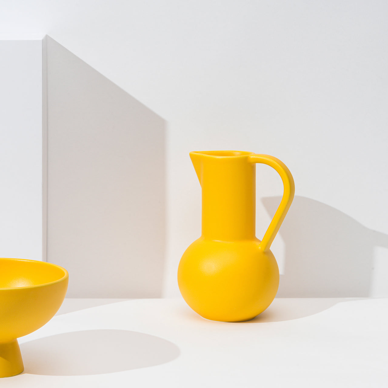 Compact in scale yet striking in presence, the Strøm Miniature Jug brings together clean geometry and artisanal detail. Introduced in 2016 and handmade in Portugal from glazed earthenware, each jug carries subtle variations that reveal the touch of the maker. The pared-back silhouette recalls early 20th-century cubist influences, while bold matte finishes add depth and character. While often displayed as a decorative object, the jug is equally suited to casual use on the table.