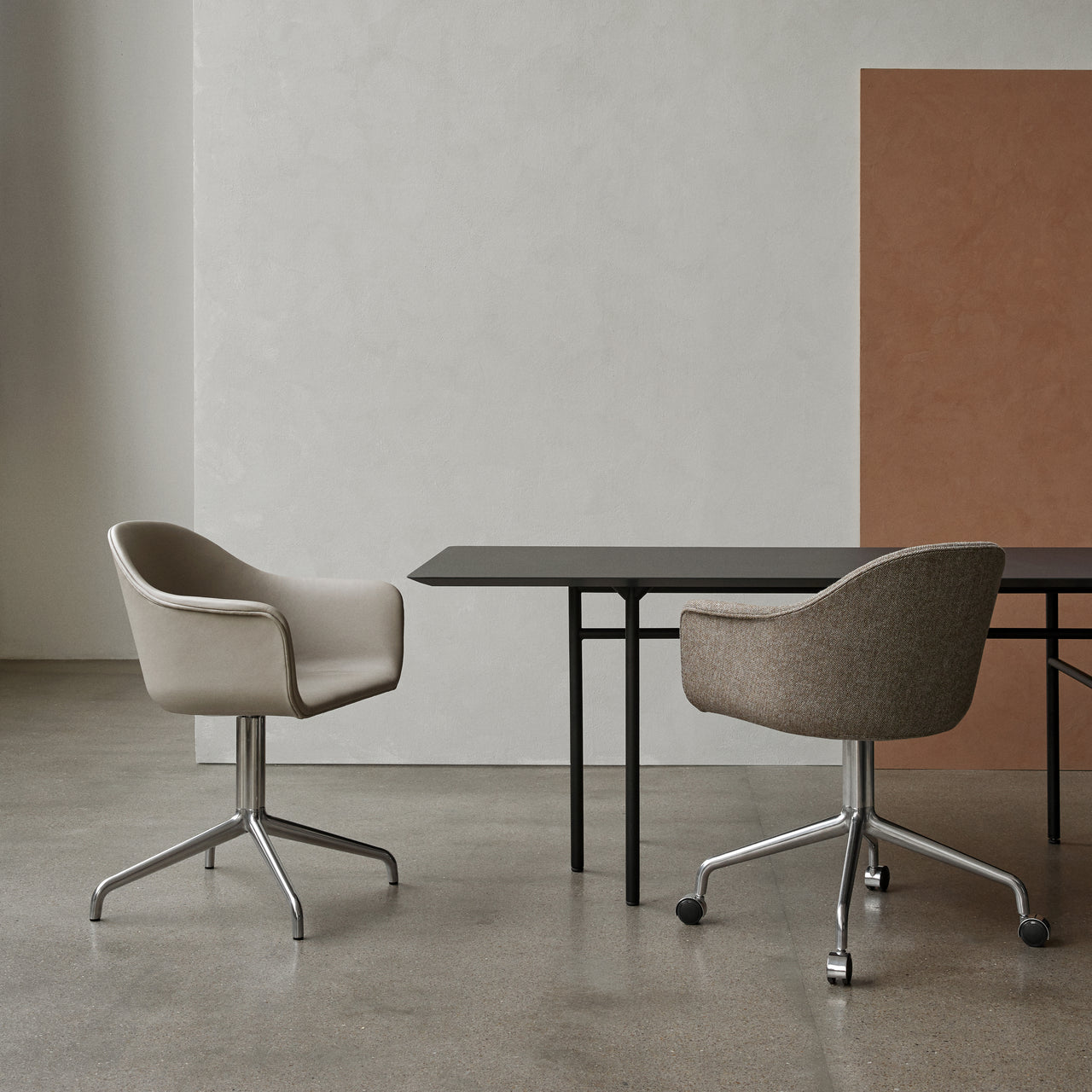 The Harbour collection evolves with a fully upholstered dining armchair in both ready stocked and custom upholstery materials that complement its defining slim lines. Supreme comfort is also part of the bargain, in Norm Architects' molded design with a backrest that bends outwards for maximum support along with multi-use utility from its 4-star swivel base with return.