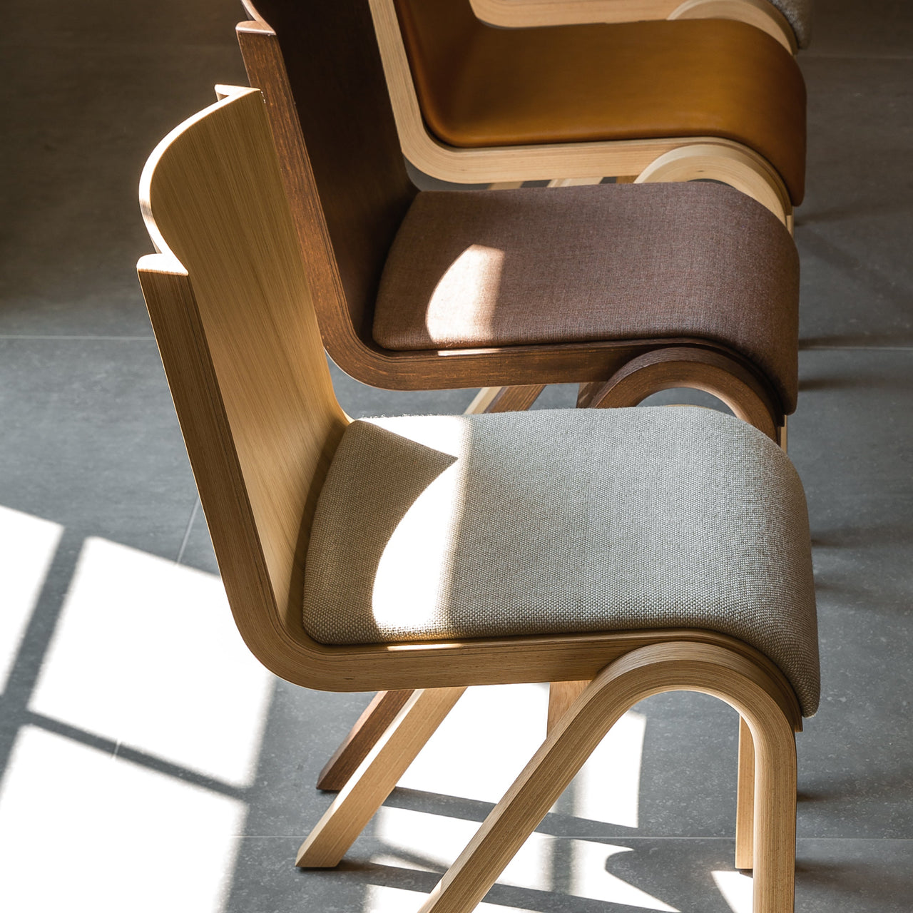 An upholstered seat stylishly tempers the sweeping wood curve of Audo's handsomely cantilevered Ready. Exploring the limits of form-pressing technique, Copenhagen designers Matias Møllenbach and Nick Rasmussen came together to conceive the seating in FSC-certified oak veneer. First intended for dining, it's also stackable up to 10 chairs high, making it a versatile contract player.