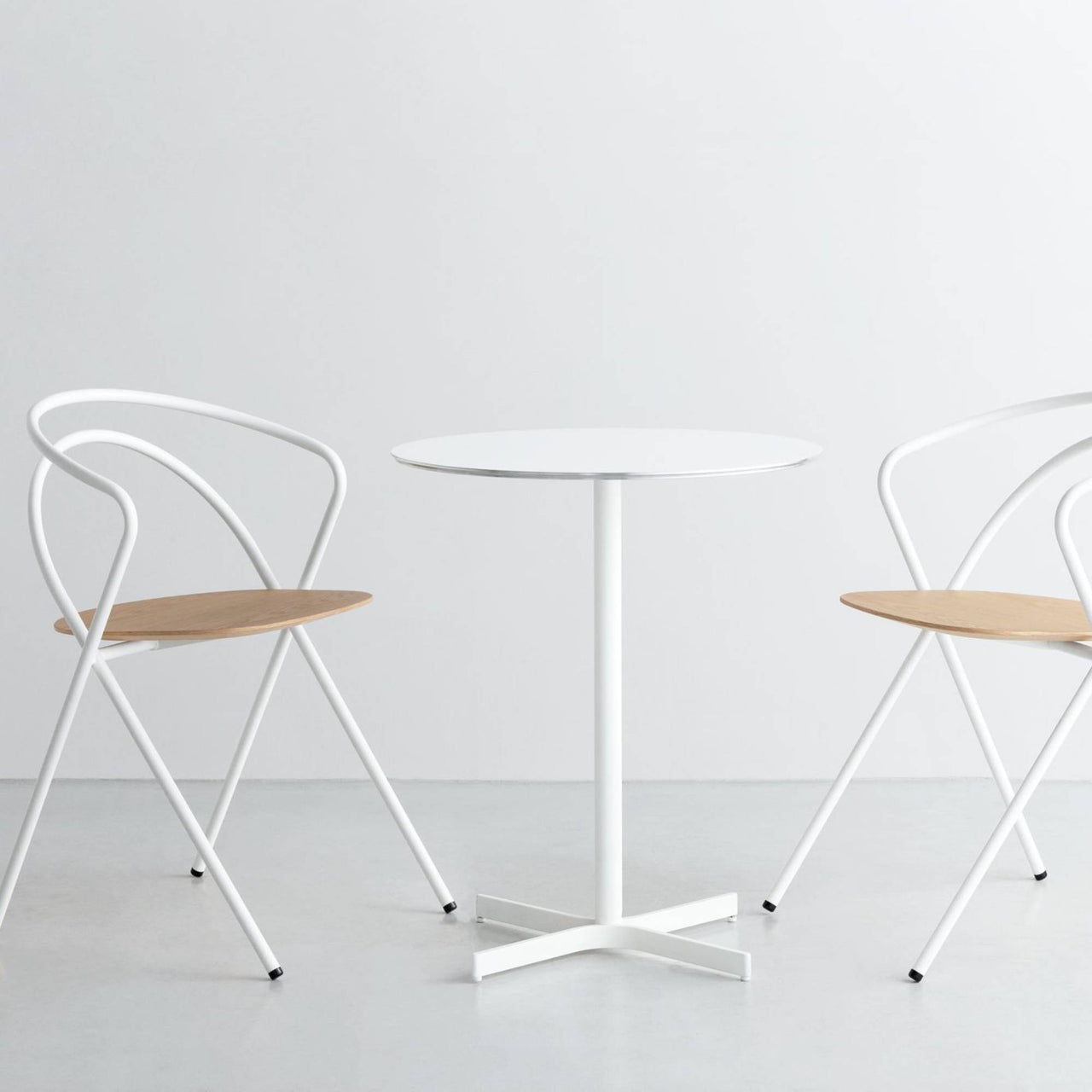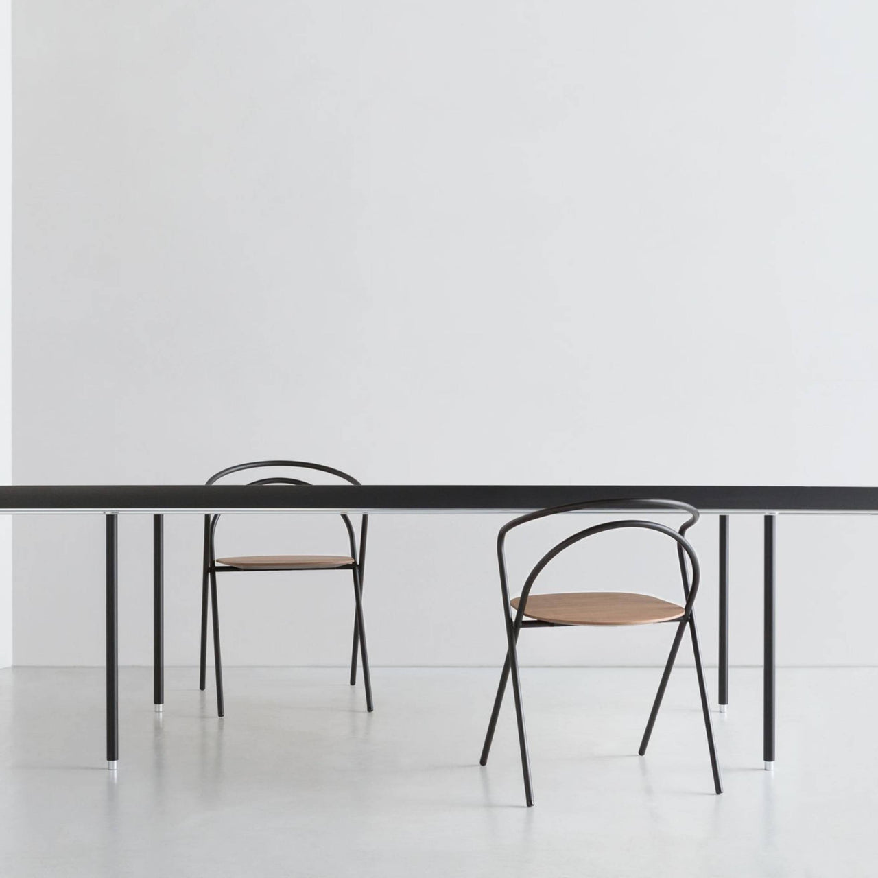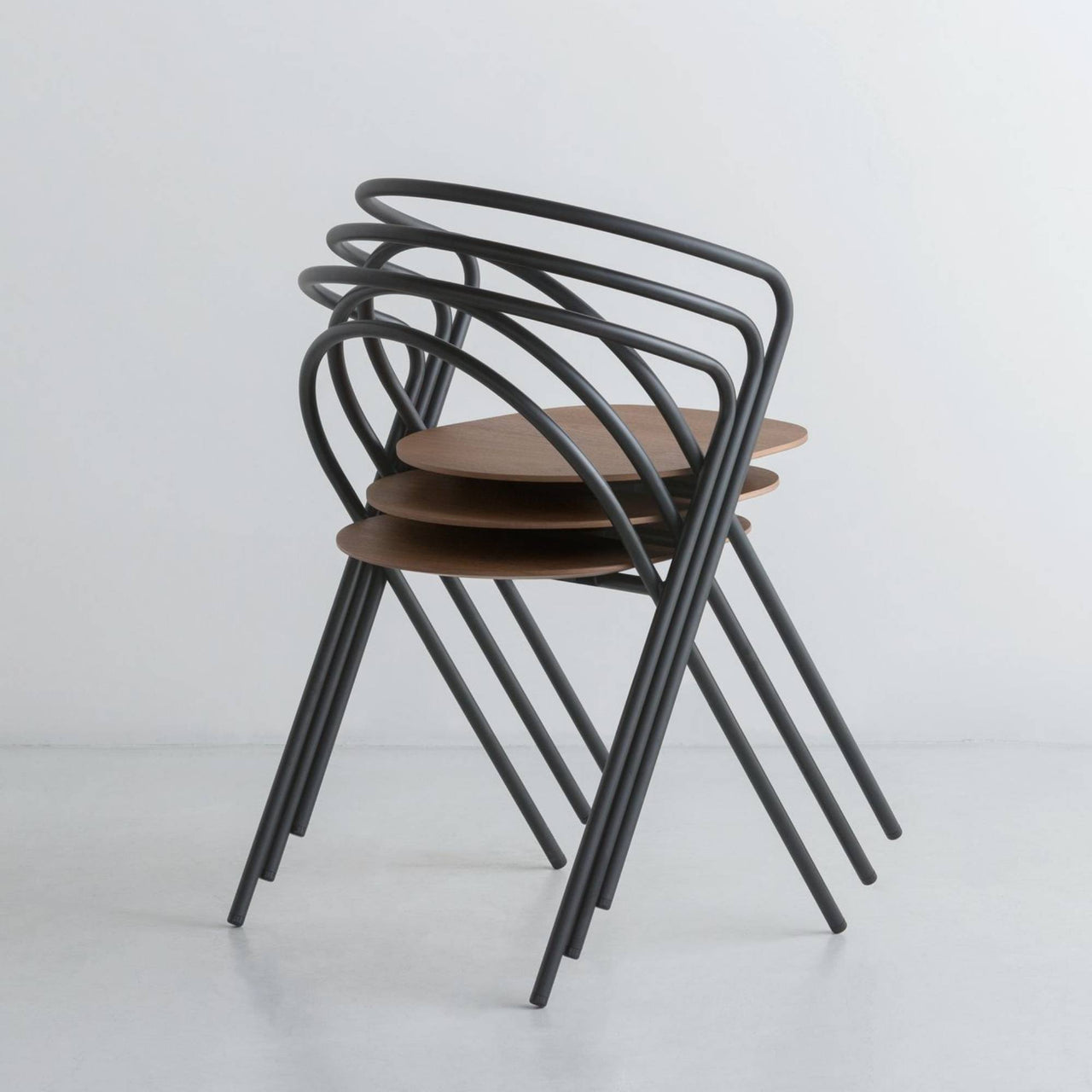 Sleek and stackable, Minima transcends the usual seating of that genre with a fully developed shape in a smooth continuum of 2 lengths of thin steel pipe. Combining fluently curved and straight lines, Spanish design studio MUT assures seating with a unique presence that also melds with a variety of spaces and architectural styles. A powder-coated frame in white, black or ink blue and seat choices in oak or walnut provide varied options for the chair, which can be stored when not needed, stacked up to 5 high.