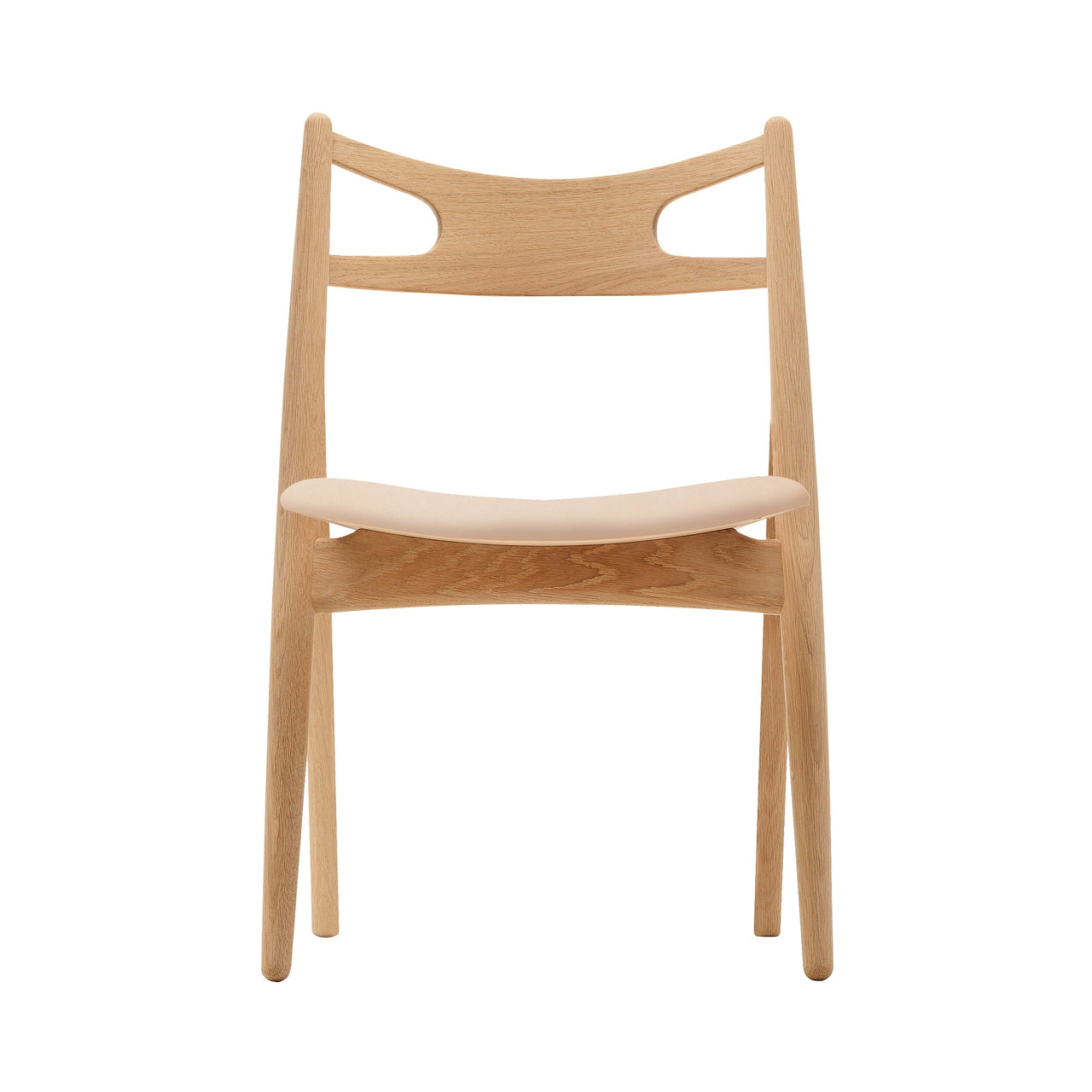 Named for sawhorses used by carpenters that inspired him, Hans J. Wegner designed CH29P in 1952 in solid oak and added upholstered comfort to seal the bargain. With its clean, simple lines, Sawbuck’s seat is significantly wider at the front and, along with its very curved back, lends sitting ease in varied positions.