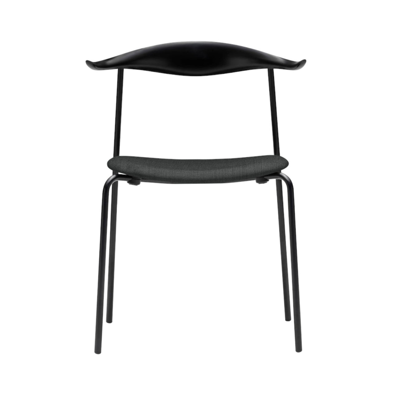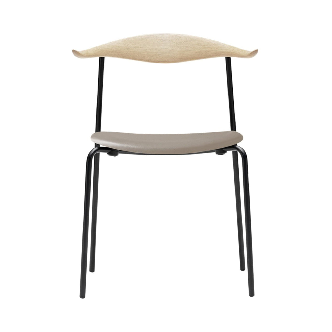 Varied beech finishes and stain hues offered for Hans J. Wegner’s stackable dining chair pair with an upholstered seat in leather or a fine fabric and a black powder-coated steel frame. The steam-bent backrest’s upturned ends make a comfortable resting place for the forearms in this 1955 design introduced by Carl Hansen & Søn for the 2014 Wegner centennial.