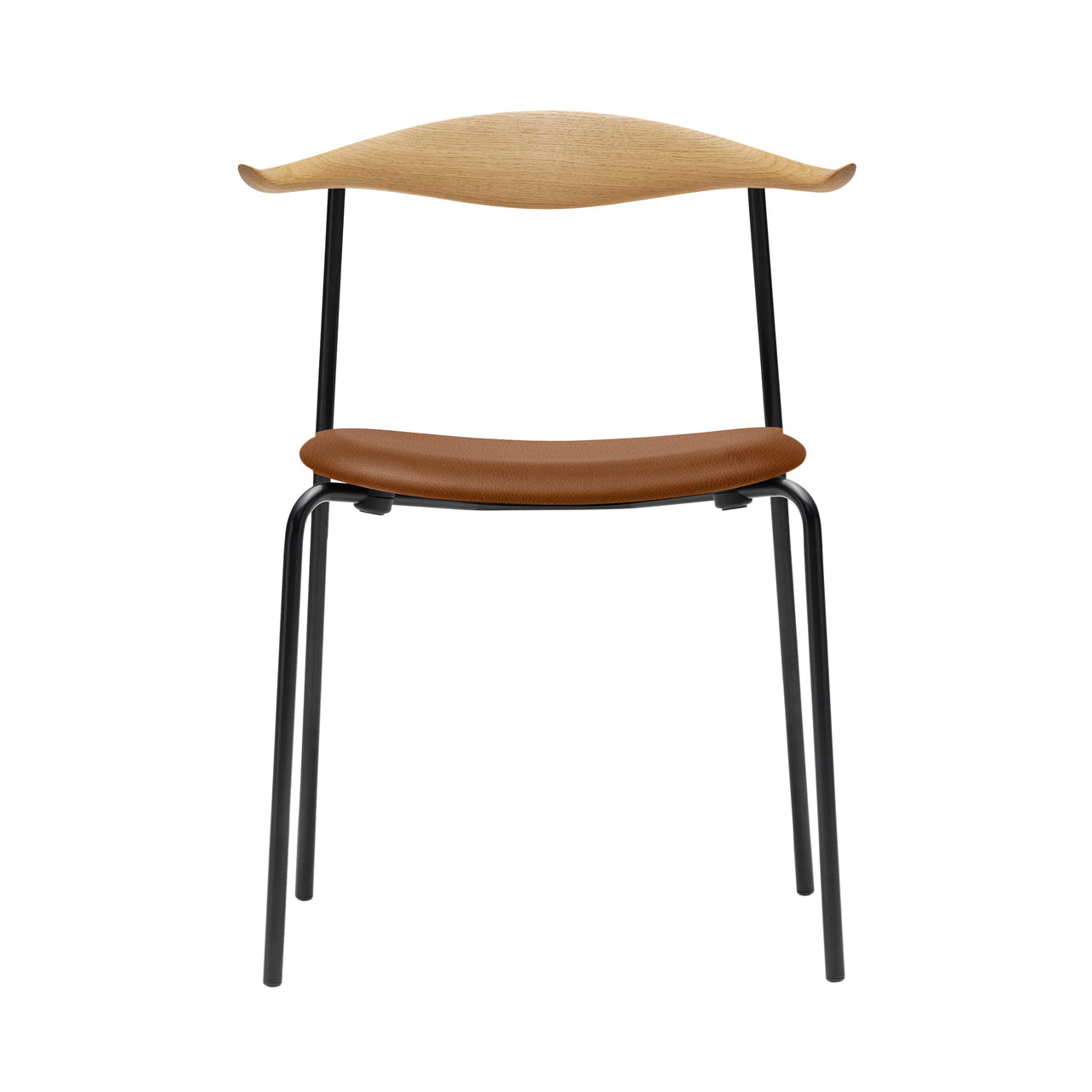 A Hans J. Wegner design from 1958 that heretofore existed only as a prototype, CH88P lends itself to a number of options, including a version with the signature elements in black steel and oak. Characteristically, the upper structure features a steam-bent wooden backrest for back support, with slight curvatures at the ends that provide a natural resting place for the arms. Along with the chair's numerous oak finishes, the oval-shaped seat is available upholstered in a textile or leather.