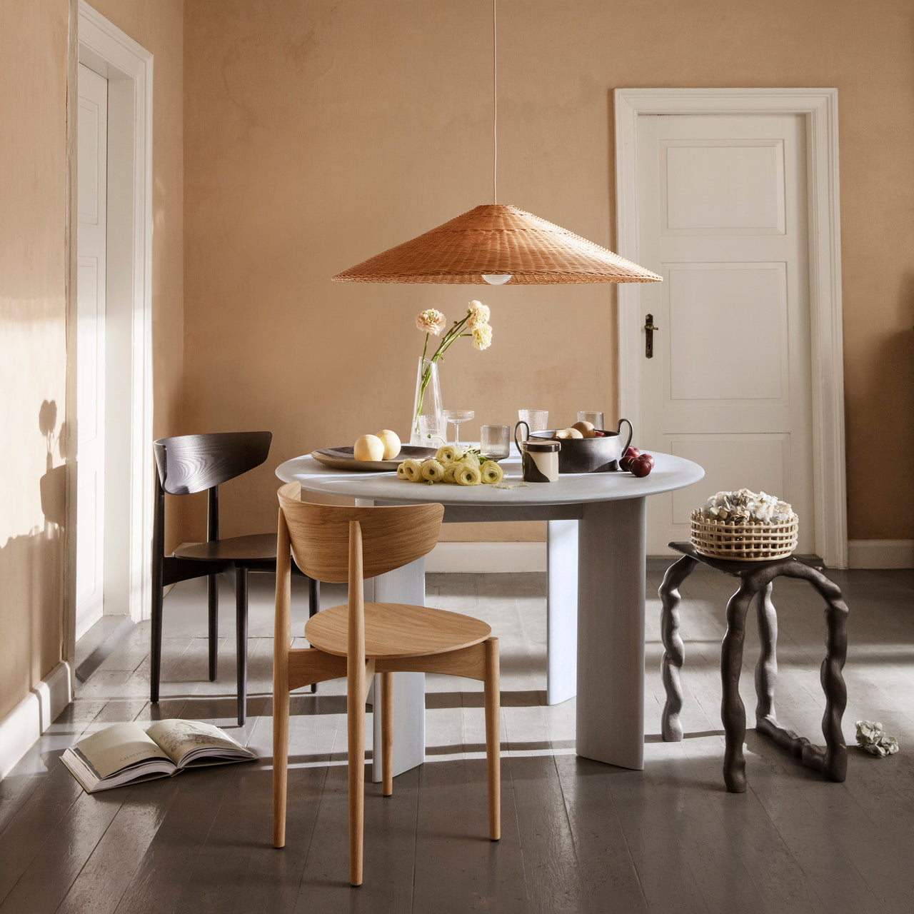 The Herman Dining Chair blends modern design with practical functionality. Constructed entirely from FSC™-certified wood, it features a solid natural oak frame complemented by a seat and backrest in natural oak veneer. The broad, curved backrest provides ample support and doubles as an armrest. Designed in collaboration with Herman Studio, the chair is stackable for convenient storage and is available in various finishes, including natural oak, black, and red-brown.