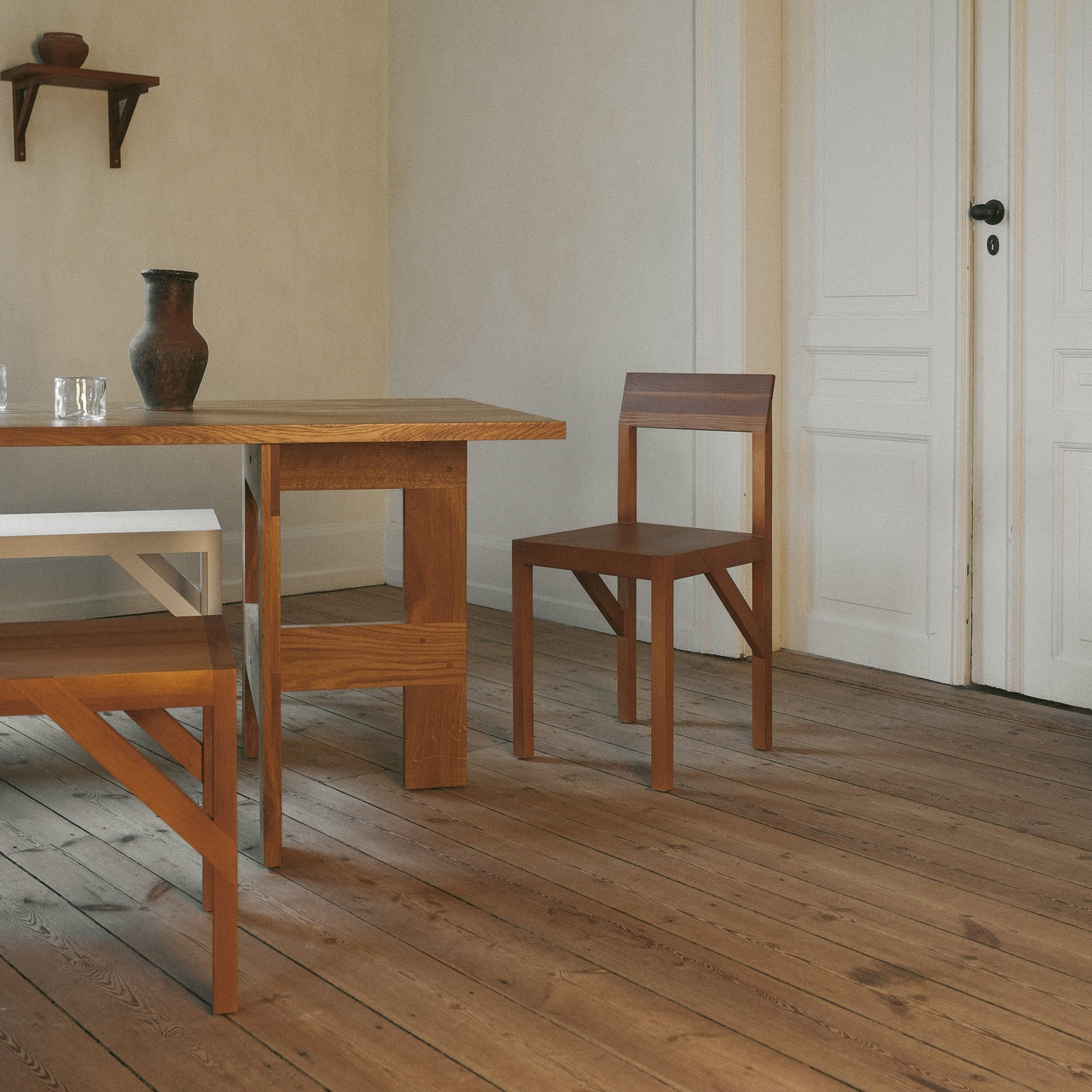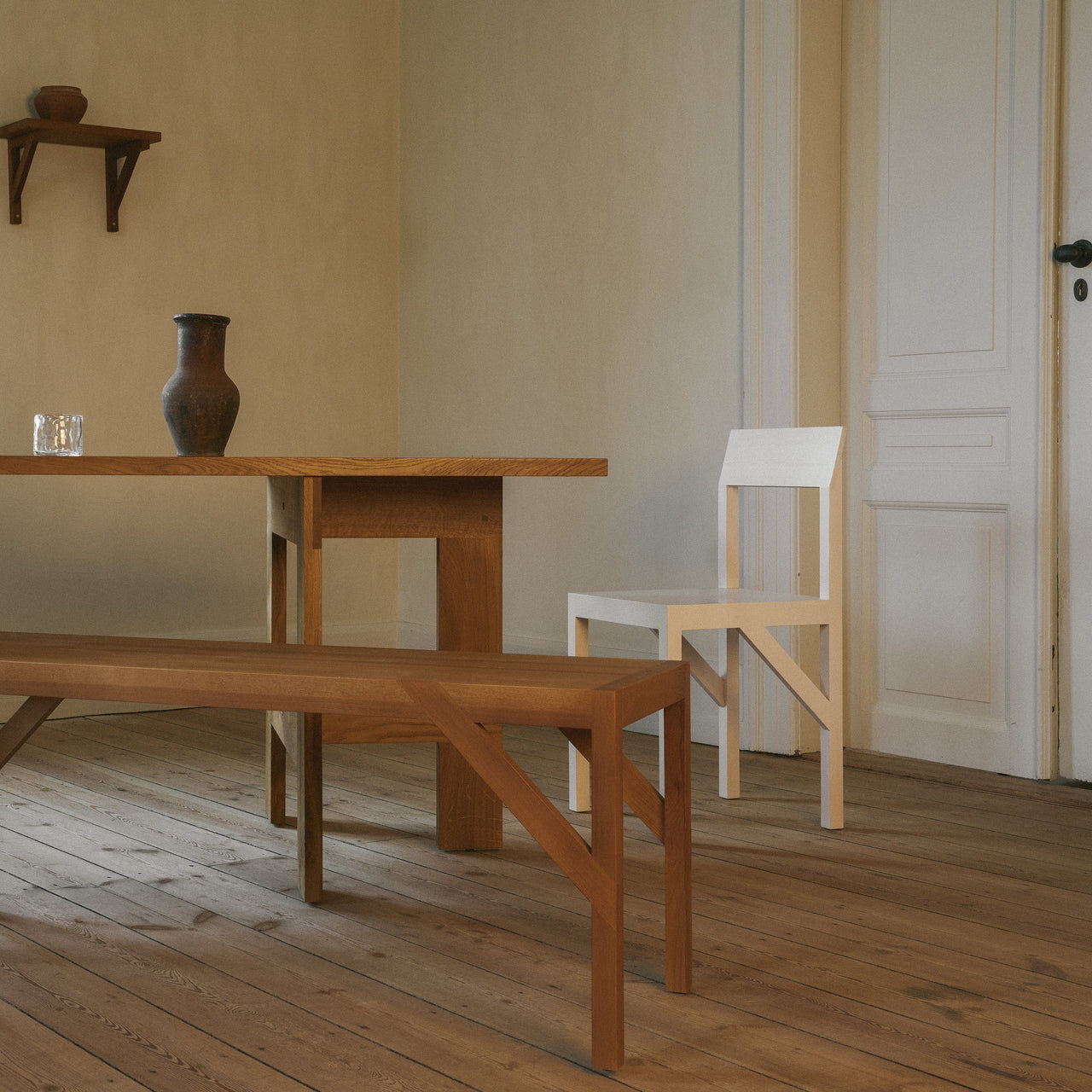 Faultlessly crafted, Bracket makes a design feature out of the functional horizontal element that ties the chair’s legs to the seat, providing stability and a visible nod to timeless construction. Frederik Gustav’s sturdy design is fabricated in solid oiled pine with a flat seat and a slightly angled backrest for hours of appreciable comfort.