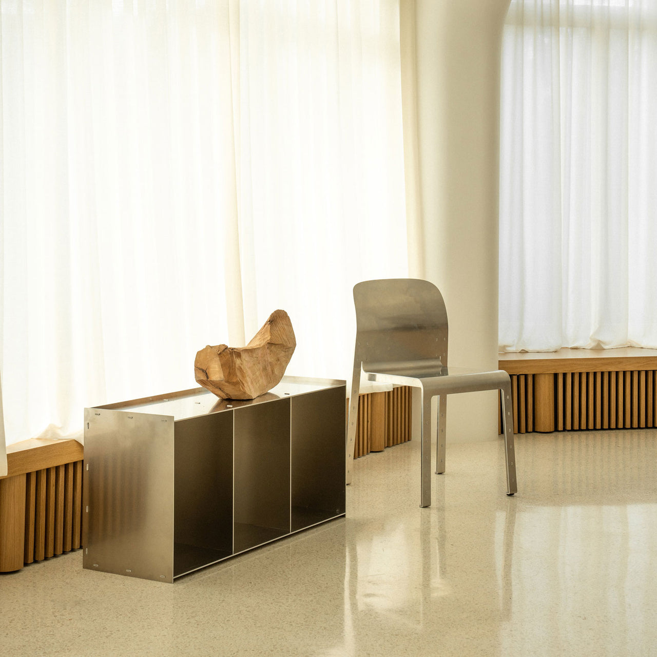 Finding an overlap of hand-craftsmanship and industrial production, Rivet Chair employs the namesake technique suitable for making perpendicular joints between separate, laser-cut raw metal sheets to striking effect. Manually hammered together in a cold-forming assembly process developed by designer Jonas Trampedach, each seating piece has a unique look with abrasions and natural irregularities on the surface that will develop an individual patina over time.