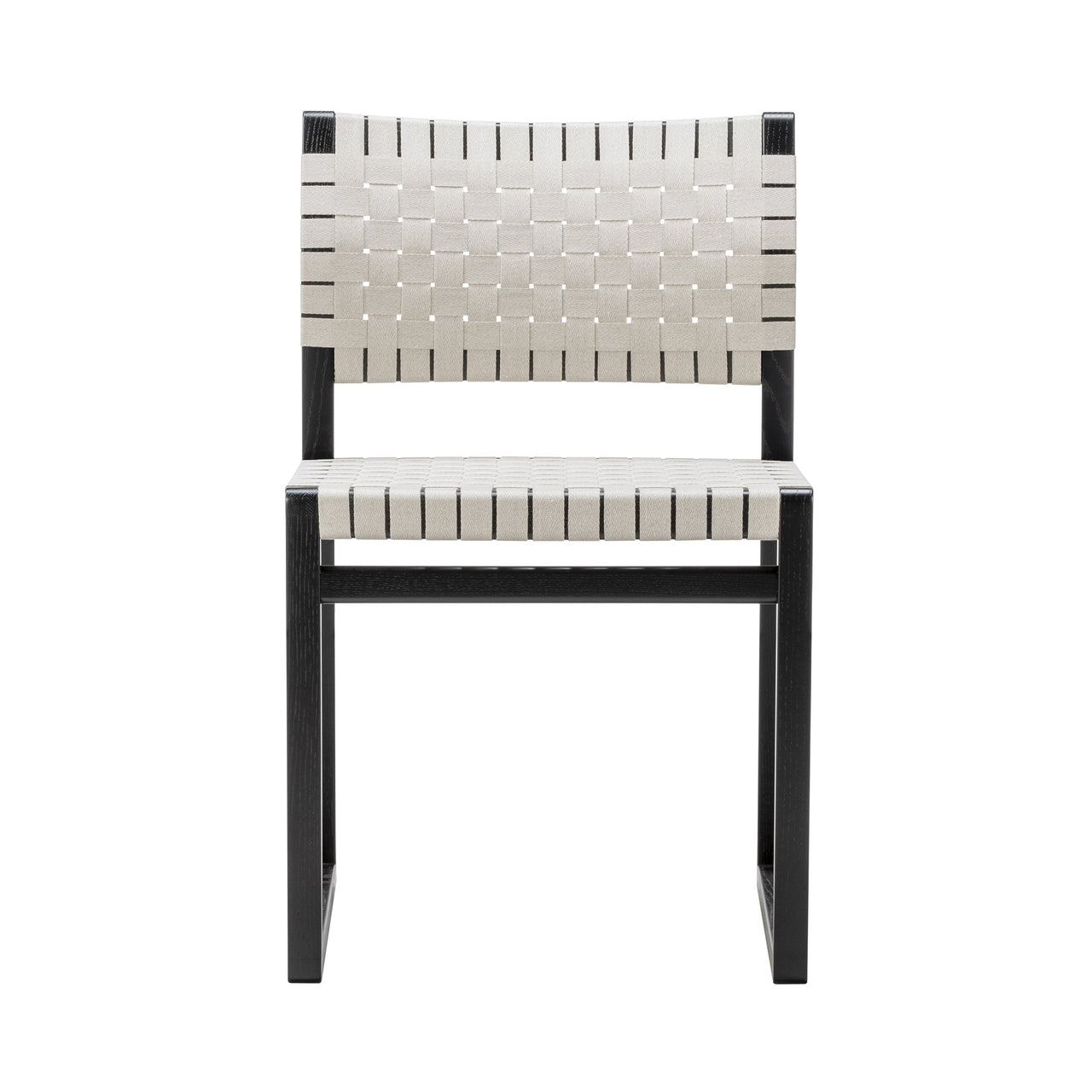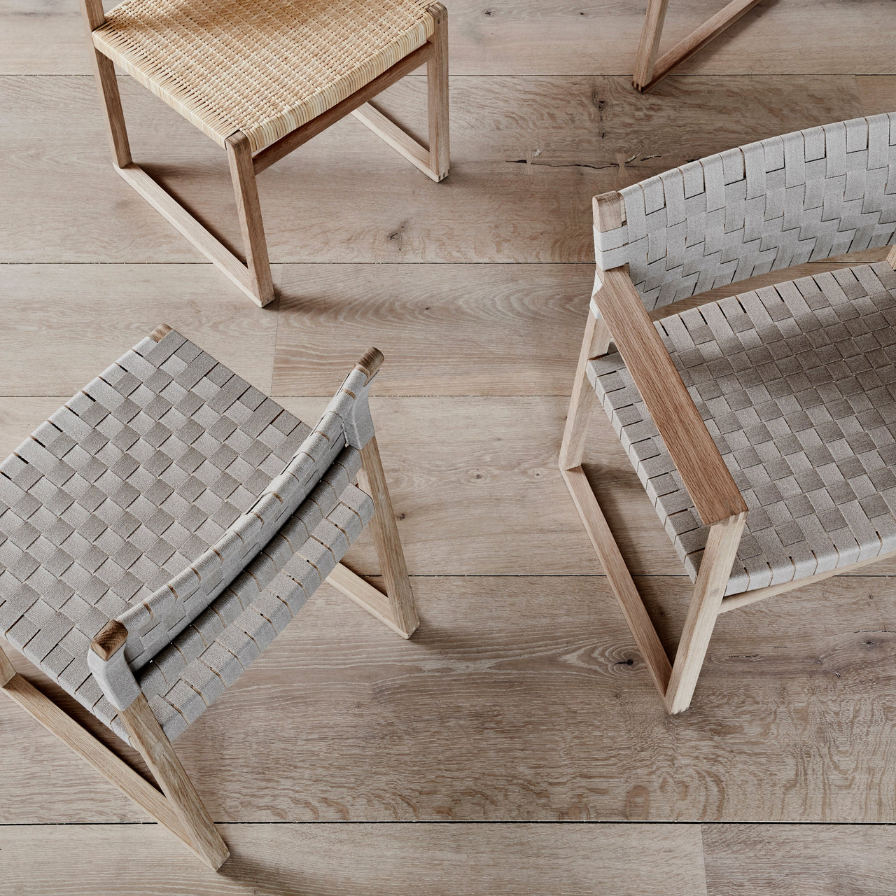 Linen webbing for the seat and back teamed with a solid-oak frame signal a clean-lined elegance in Børge Mogensen's slim and sturdy 1958 dining chair, available as the armless BM61 or armchair BM62. With the structure in solid oiled or lacquered oak and webbing in either natural or black, the seat comfortably angles precisely where optimal support for the back is needed while the lower section supports the small of the back. Finely crafted elements include exposed finger joints and runner legs that make it particularly suitable for use on carpets or with included gliders on floors.