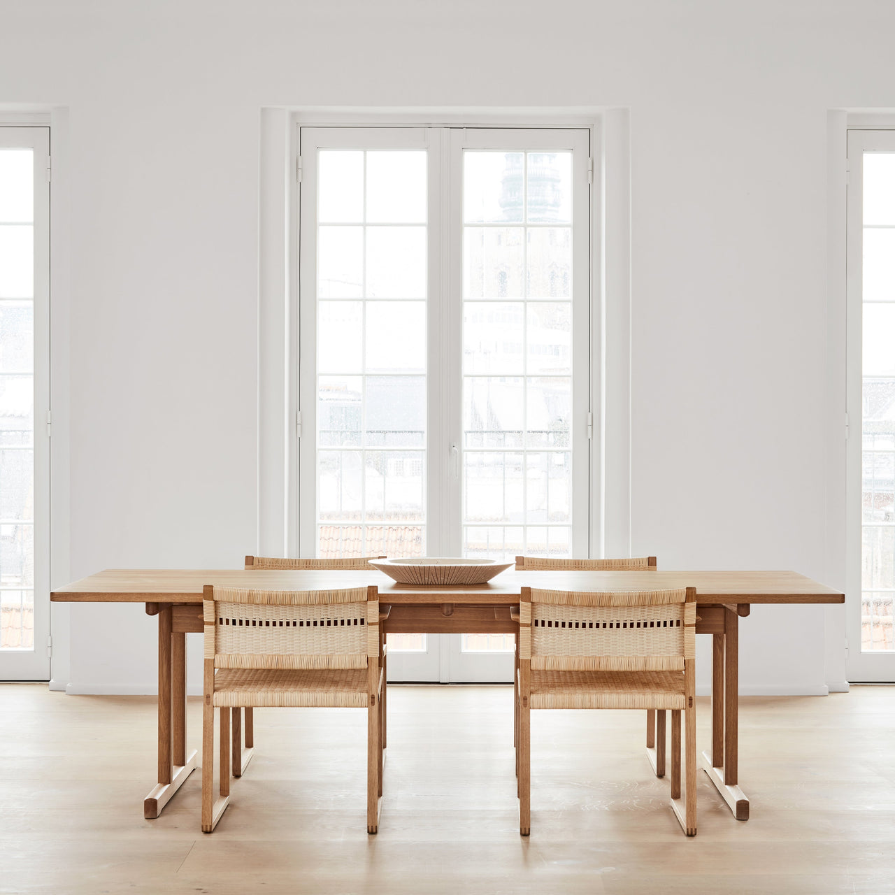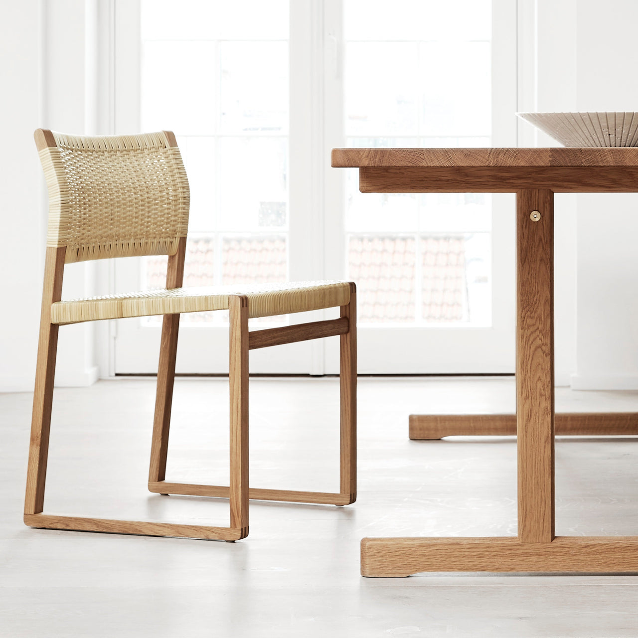 Derived from nature, a cane wicker seat adds a timeless appeal to Børge Mogensen's slim but robust 1958 dining chair in solid oiled or lacquered oak. Both the armless version BM61 and the armchair BM62 feature a seat that gently angles precisely where optimal support for the back is needed while the lower section supports the small of the back. Along with yielding outstanding comfort, the seating features finely crafted elements like exposed finger joints and runner legs that make it particularly suitable for use on carpets but it can also be fitted with included gliders on floors.