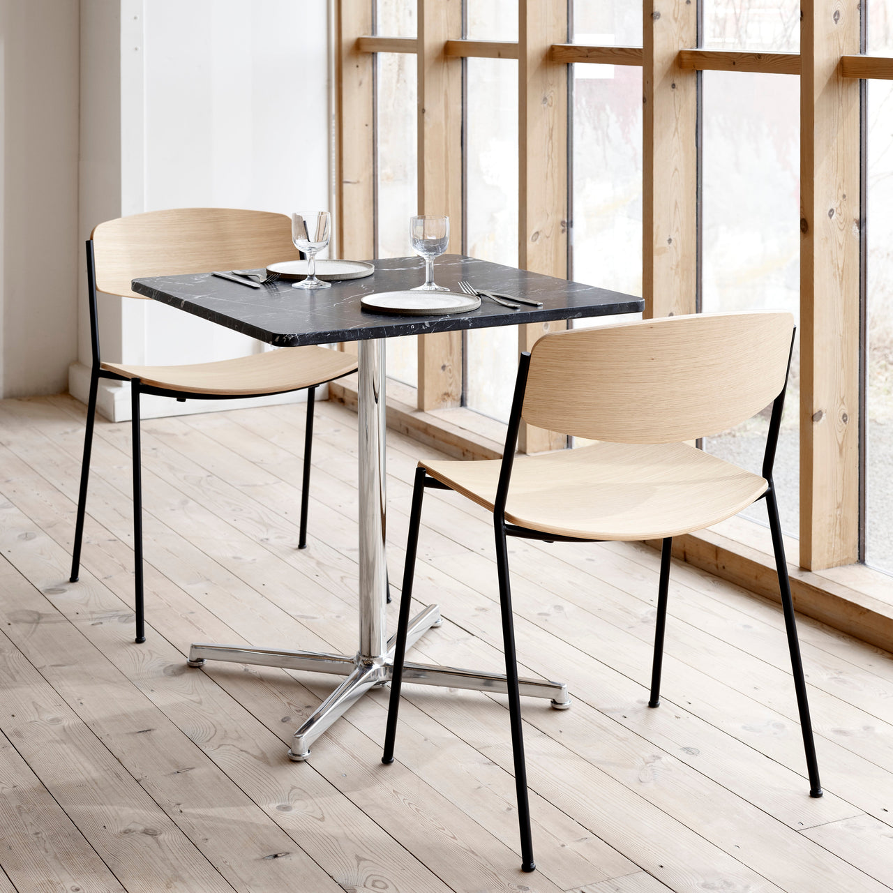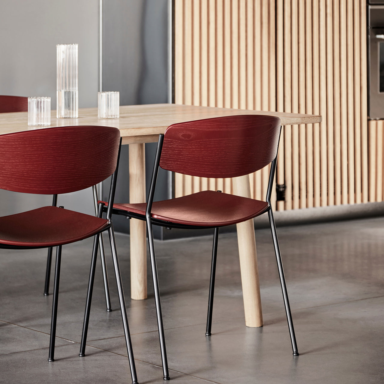 A gently curved plywood backrest introduces a sense of lightness, while the steel frame ensures durability. Crafted from FSC-certified beech core with ash, oak, or walnut veneer, the chair features a powder-coated or chromed tubular steel frame. Stackable for efficient storage, it accommodates up to 12 on the floor and 20 on a trolley. Reintroduced by Fredericia in 2021, the chair reflects a focus on sustainability and circular design principles.