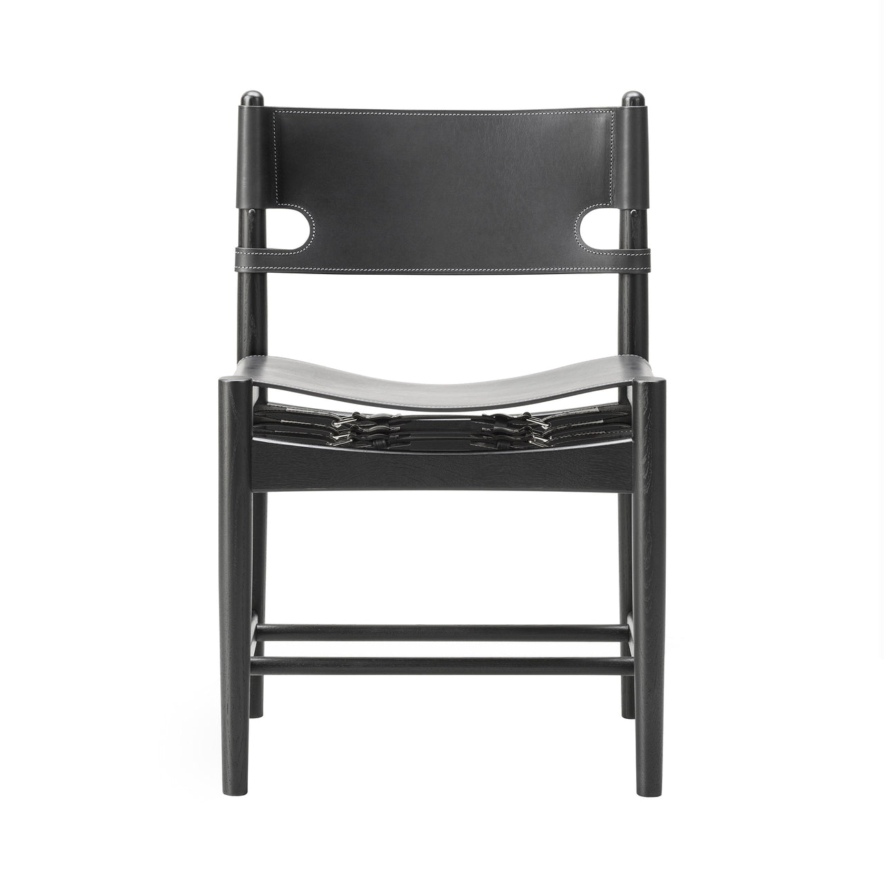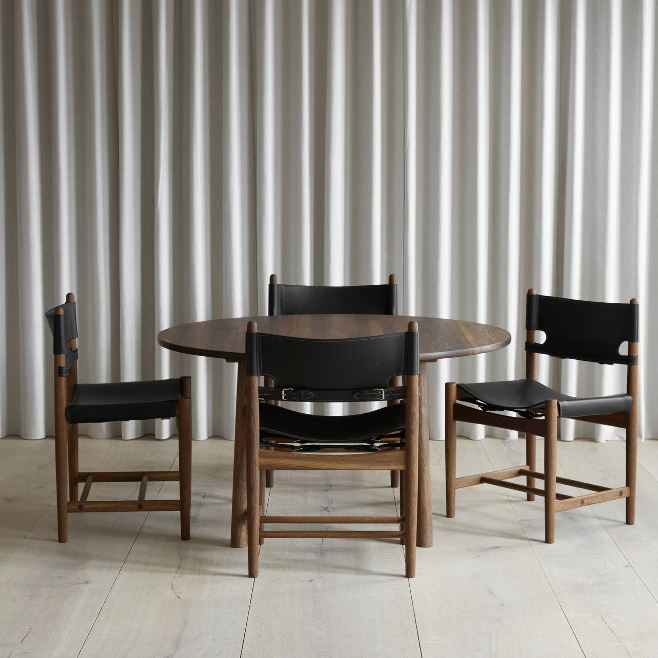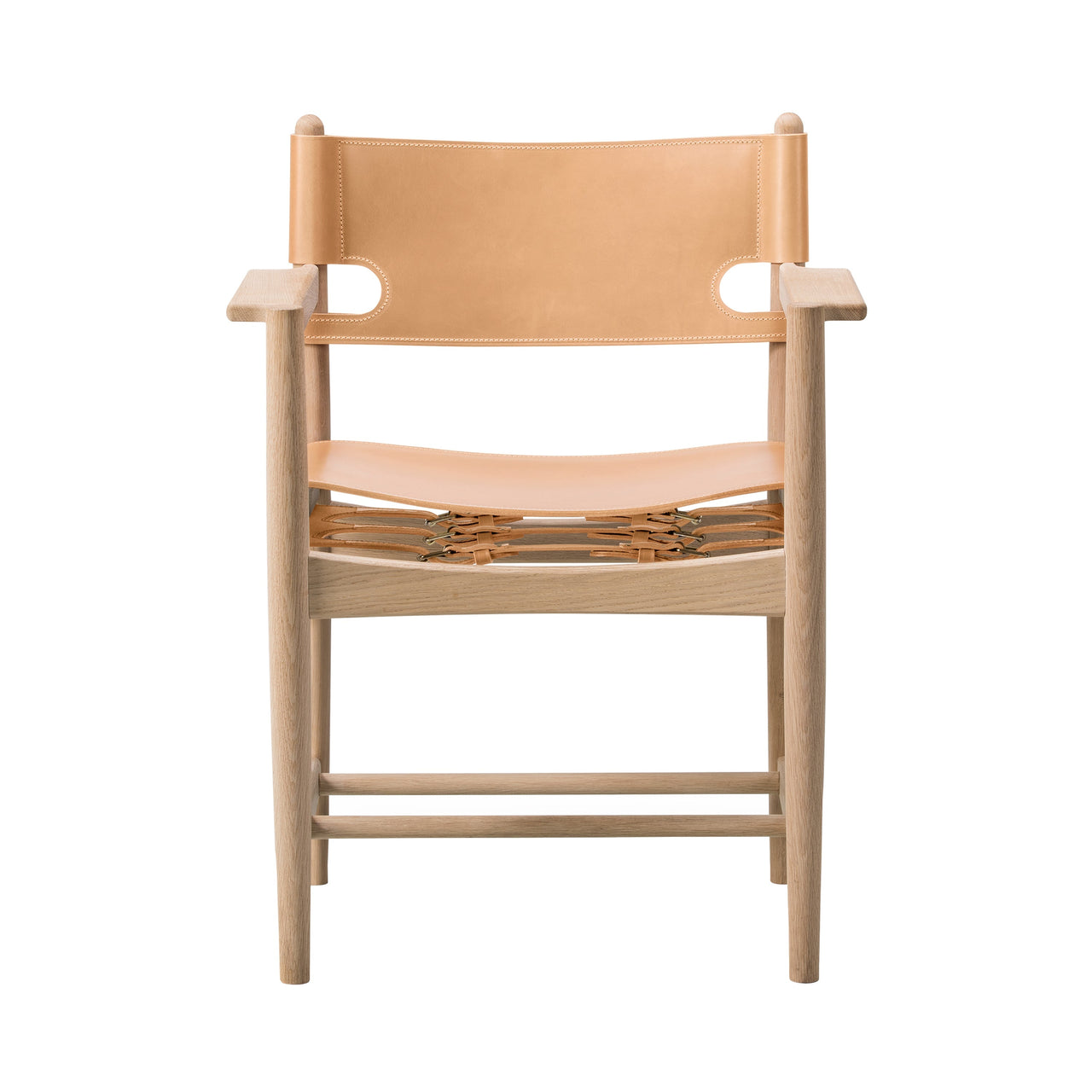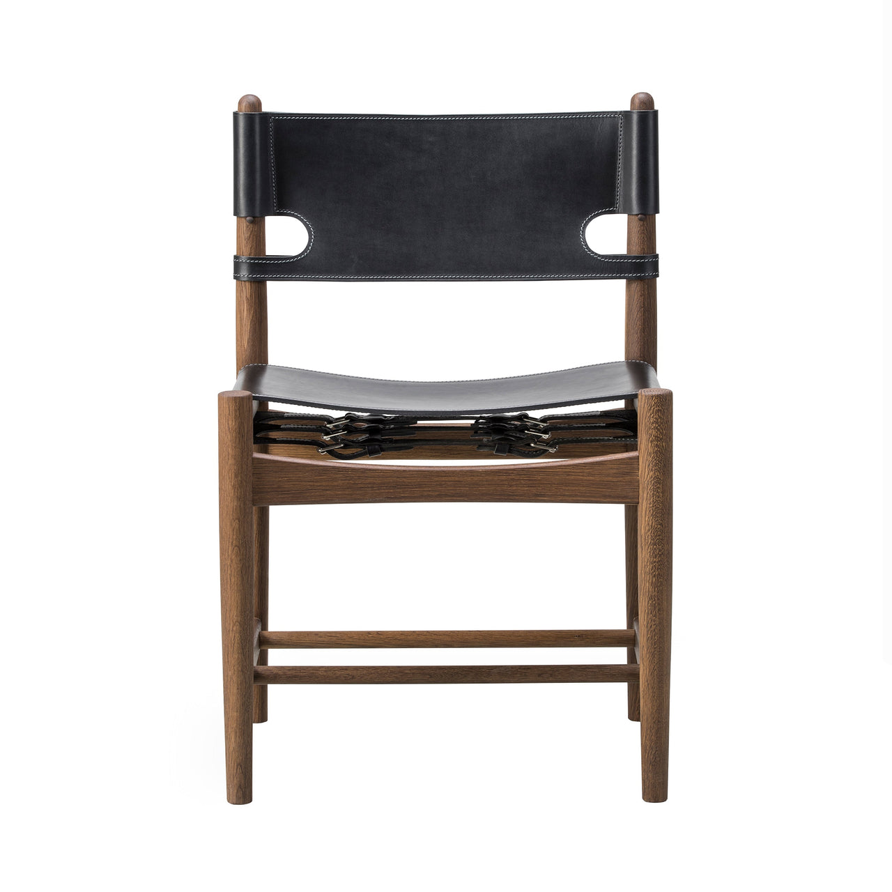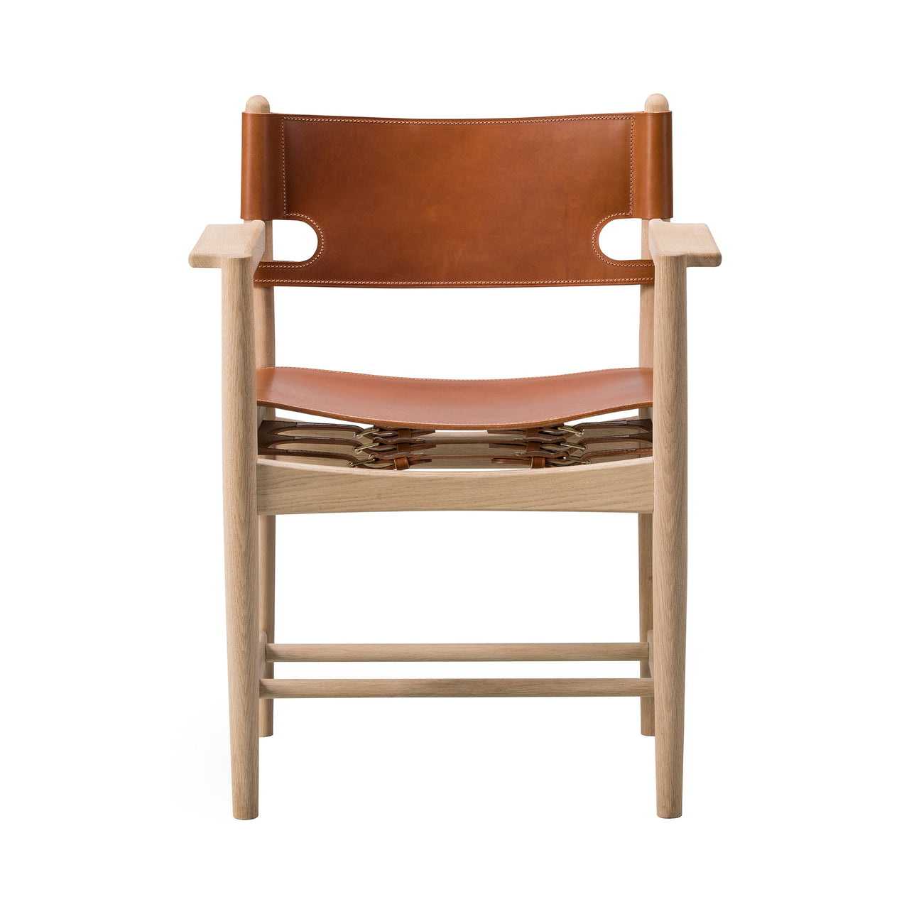 Somewhat ironically, Børge Mogensen's dining chair with its Danish accent on comfortable functionality, durability and forthright style was suggested by a tradition from another culture. The Spanish Chair nods to that country's customary way of making furniture with its sturdy saddle leather seat and solid oak construction. Mogensen's enduring 1964 design comes in both side and armchair versions in a range of finishes that underscore his penchant for the tranquility of simple lines and natural materials.