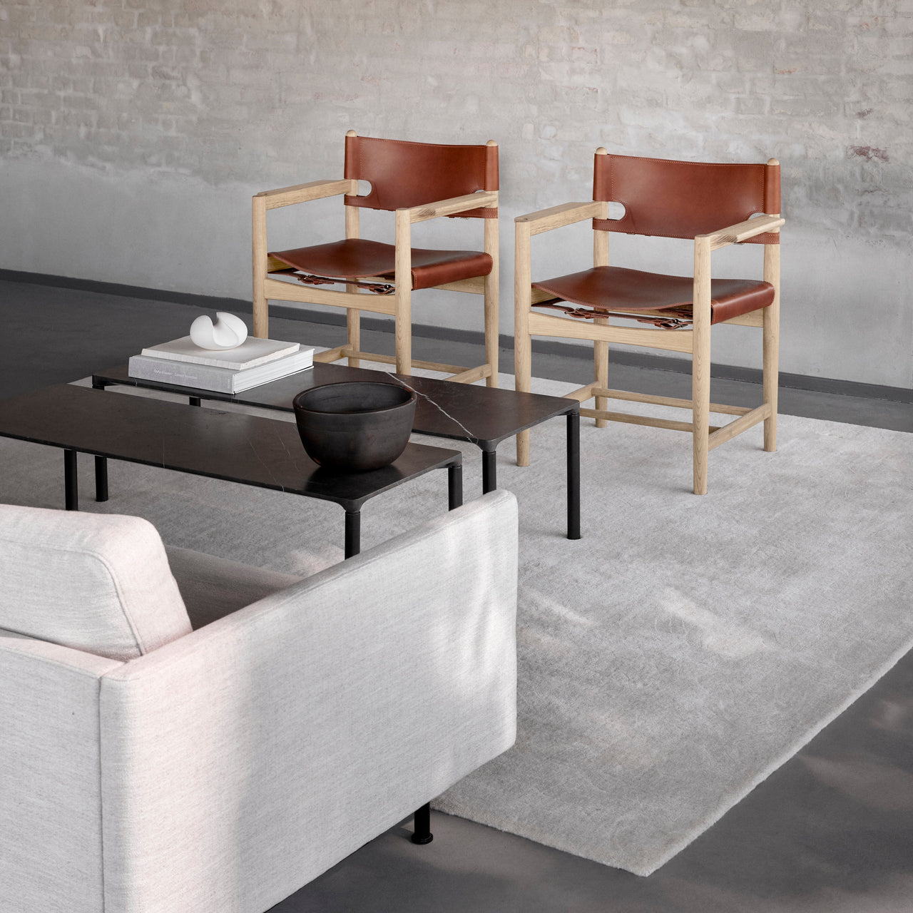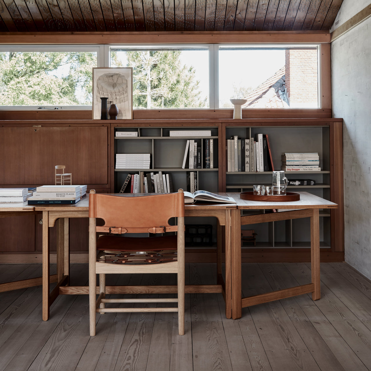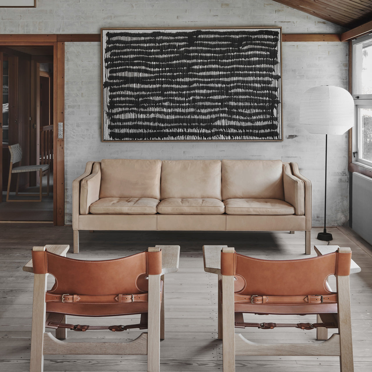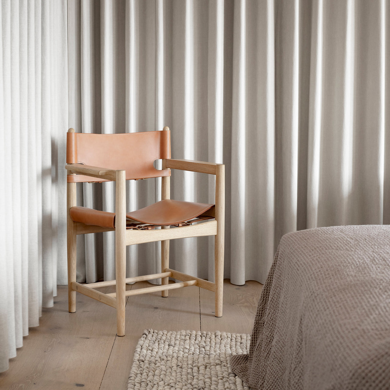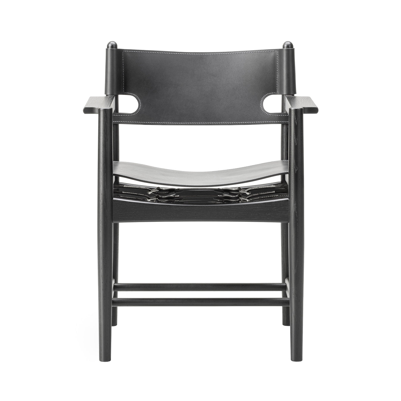 Somewhat ironically, Børge Mogensen's dining chair with its Danish accent on comfortable functionality, durability and forthright style was suggested by a tradition from another culture. The Spanish Chair nods to that country's customary way of making furniture with its sturdy saddle leather seat and solid oak construction. Mogensen's enduring 1964 design comes in both side and armchair versions in a range of finishes that underscore his penchant for the tranquility of simple lines and natural materials.