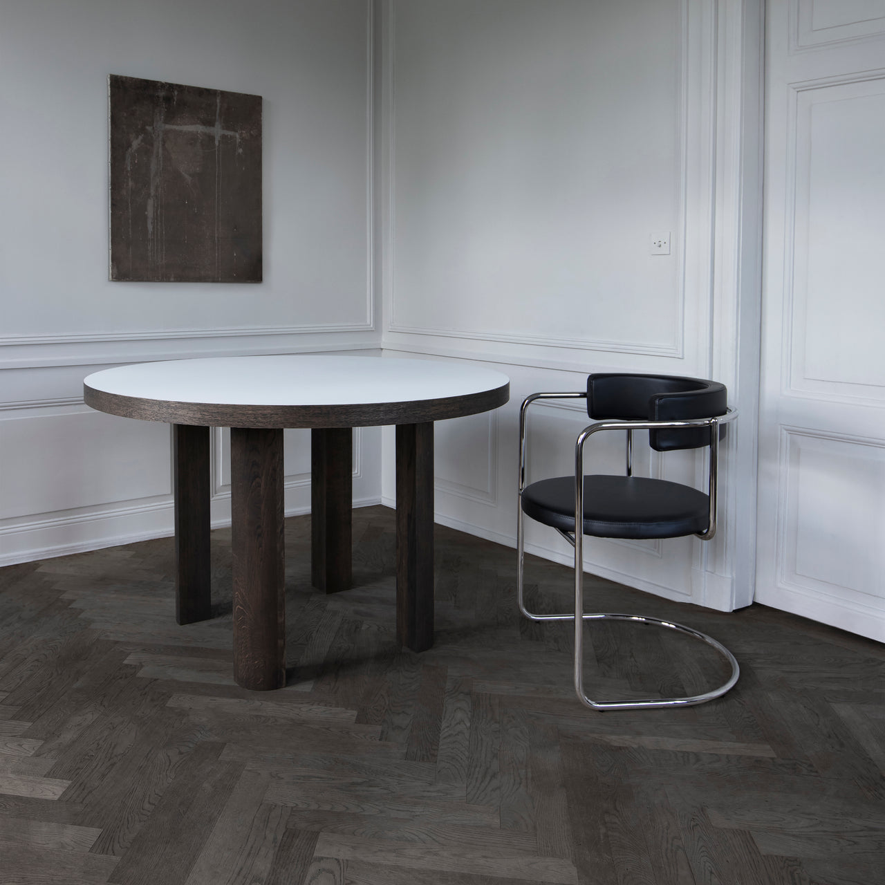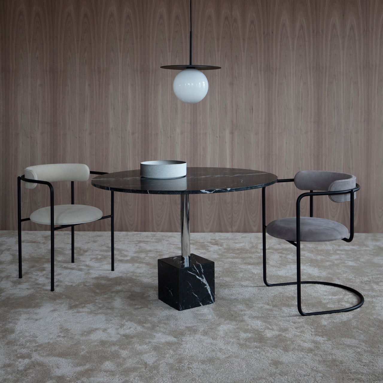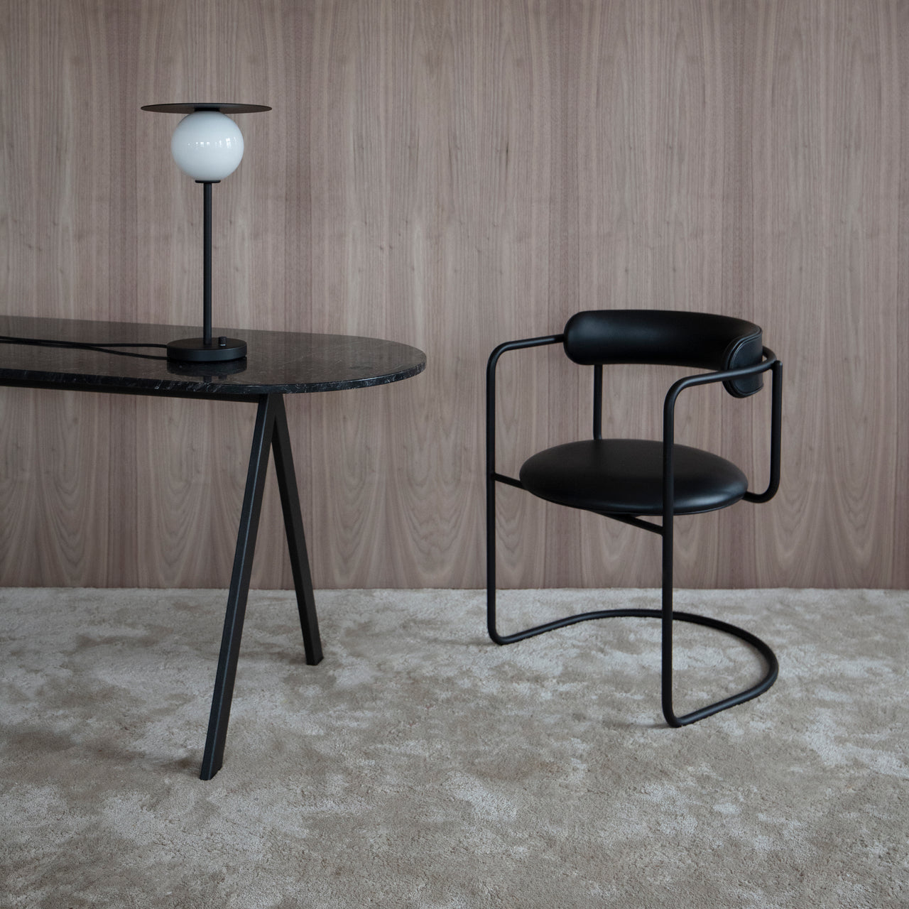 Leaning into a Midcentury vibe, Ida Linea Hilderbrand’s FF Chair offers a version with a space-saving cantilevered base in the series' signature tubular metal with the further option of a cubic or rounded seat. Custom upholstery from a selection of fine fabric or leathers complements the steel frame in gleaming chrome or black powder-coat finish.