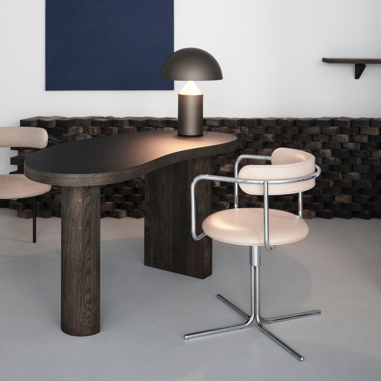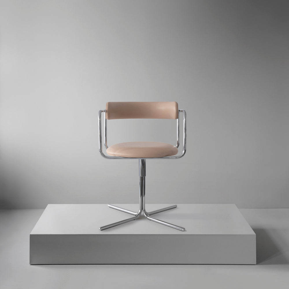 Ida Linea Hildebrand’s Bauhaus-inspired FF collection gets a desk chair with a swivel mechanism that allows smooth, silent movement via a specially-constructed undercarriage that matches the characteristic tubular steel frame. Organically-shaped padding offers a comfortable respite, with a wealth of fabric and leather upholstery options.