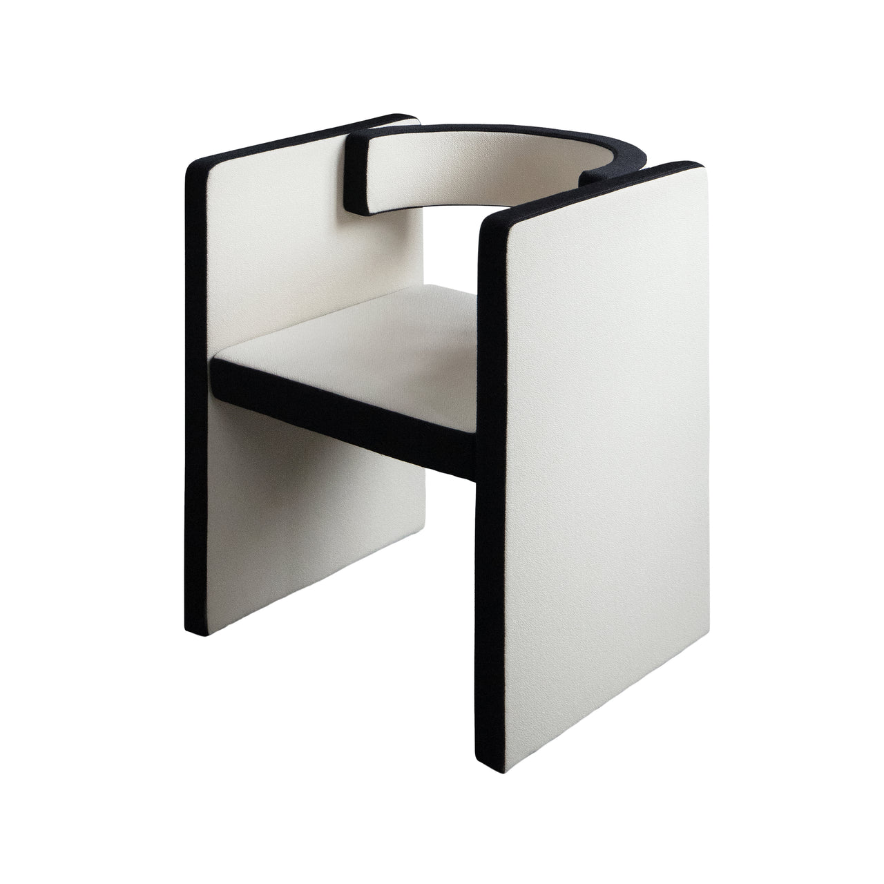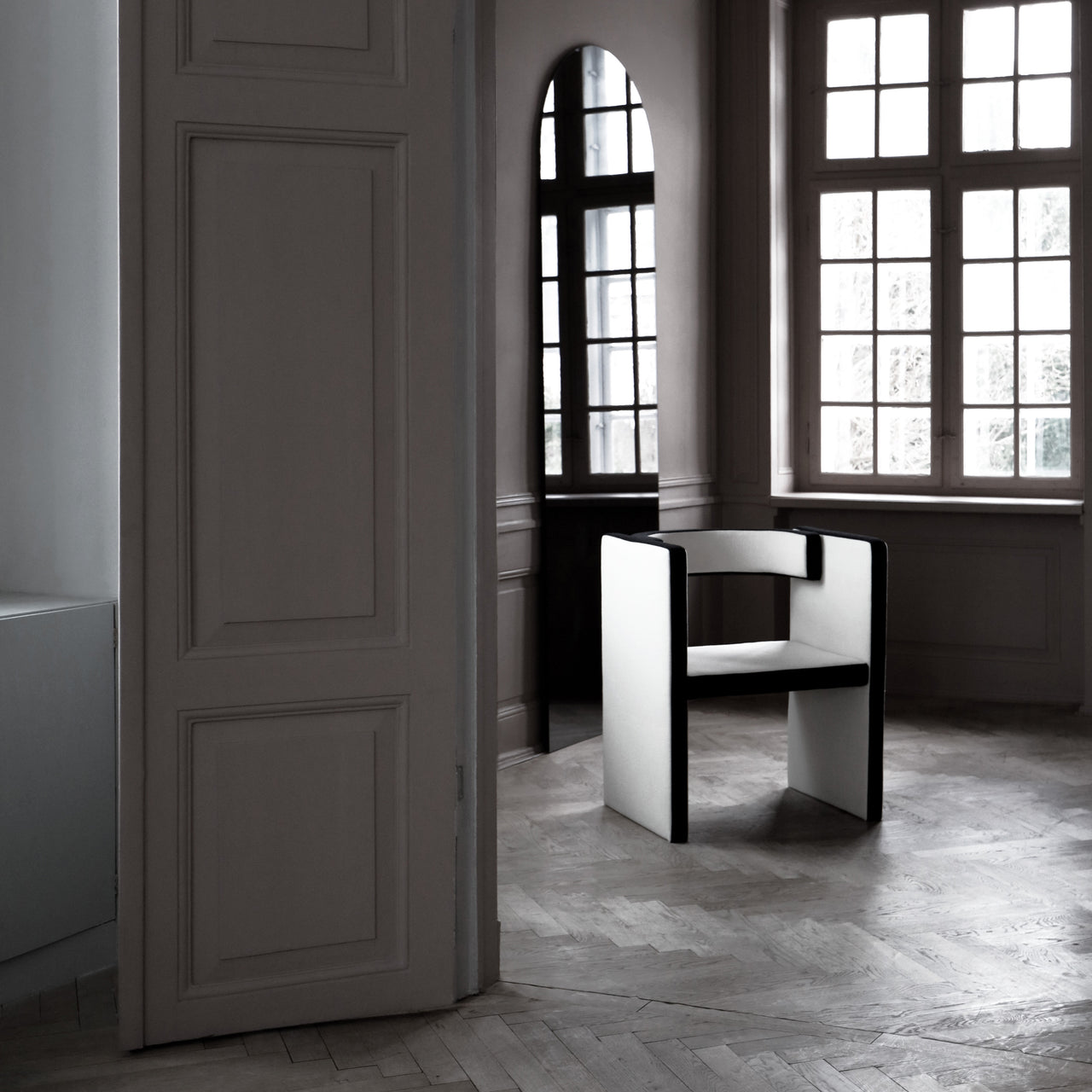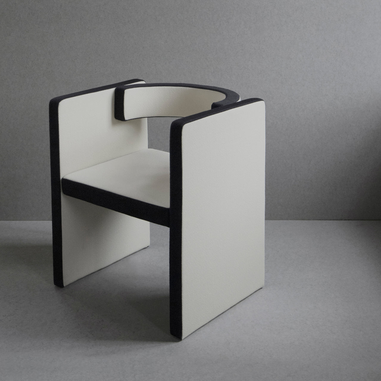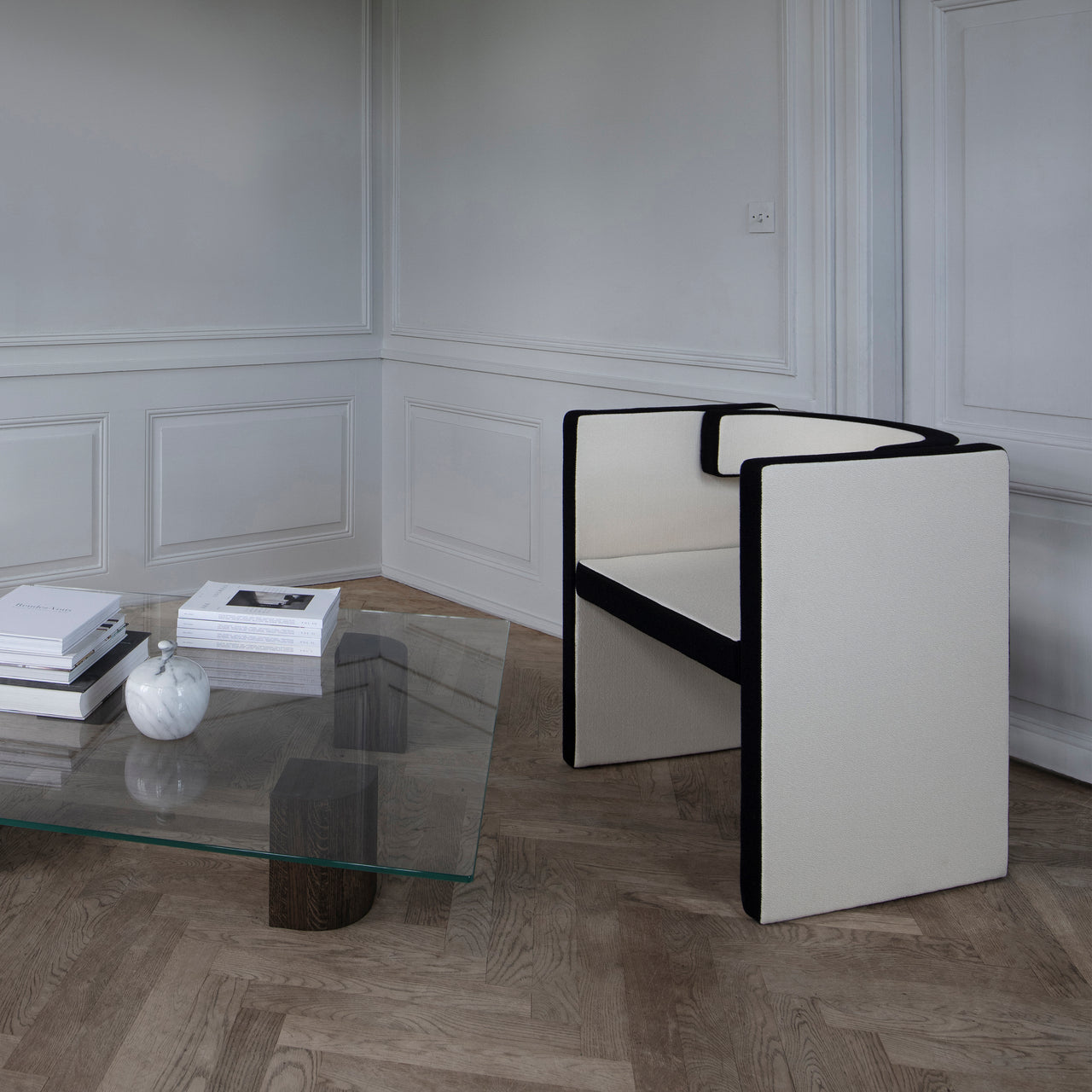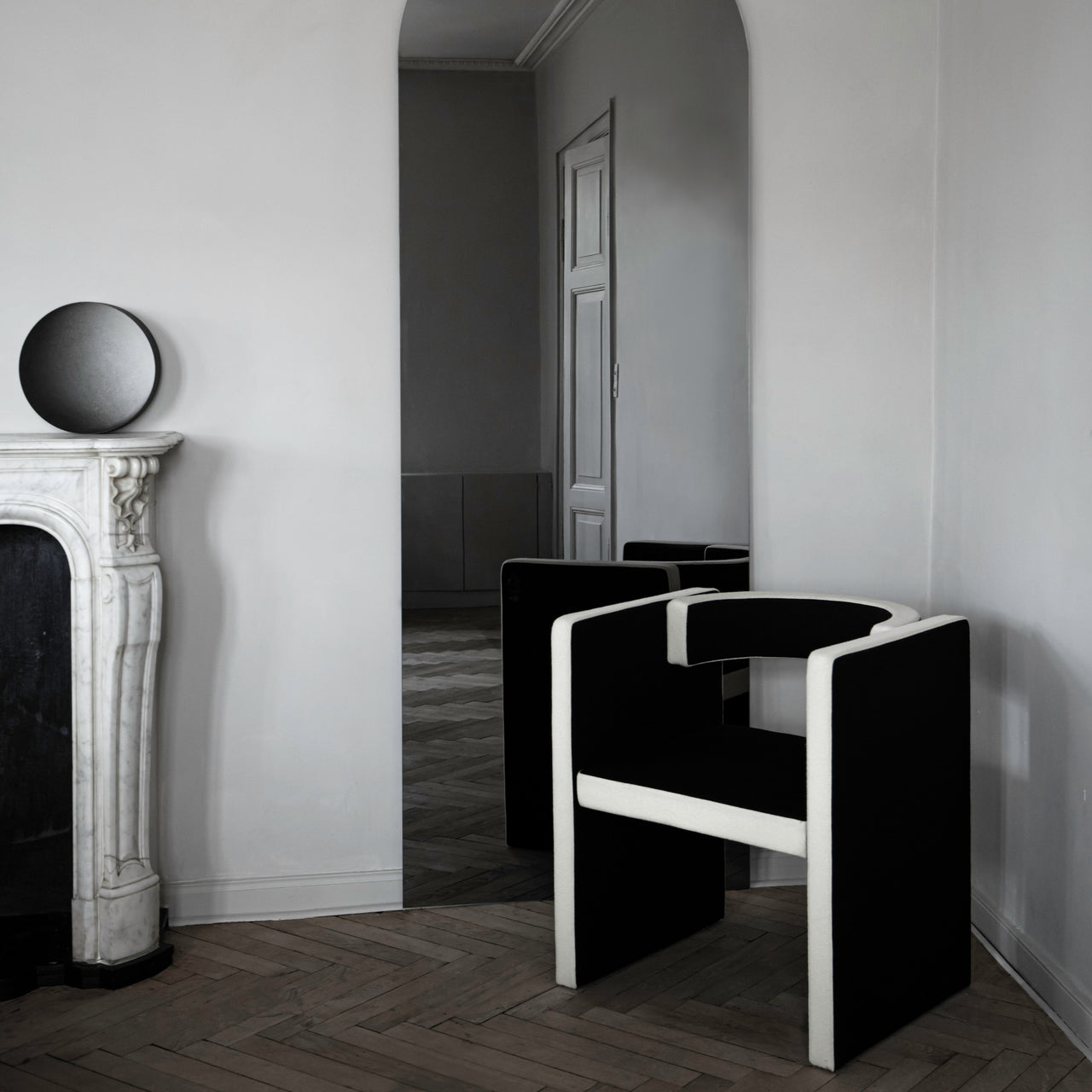 Friends & Founders shape a structured, stand-alone chair with the sharply defined allure of a certain Parisian designer’s “le smoking” tuxedo. Stark rectangular elements join the C-shaped back and roomy seat, clad in black on white boucle—or the reverse of that fashionably chic combo—for seating with a self-assured silhouette and eye-catching outline.