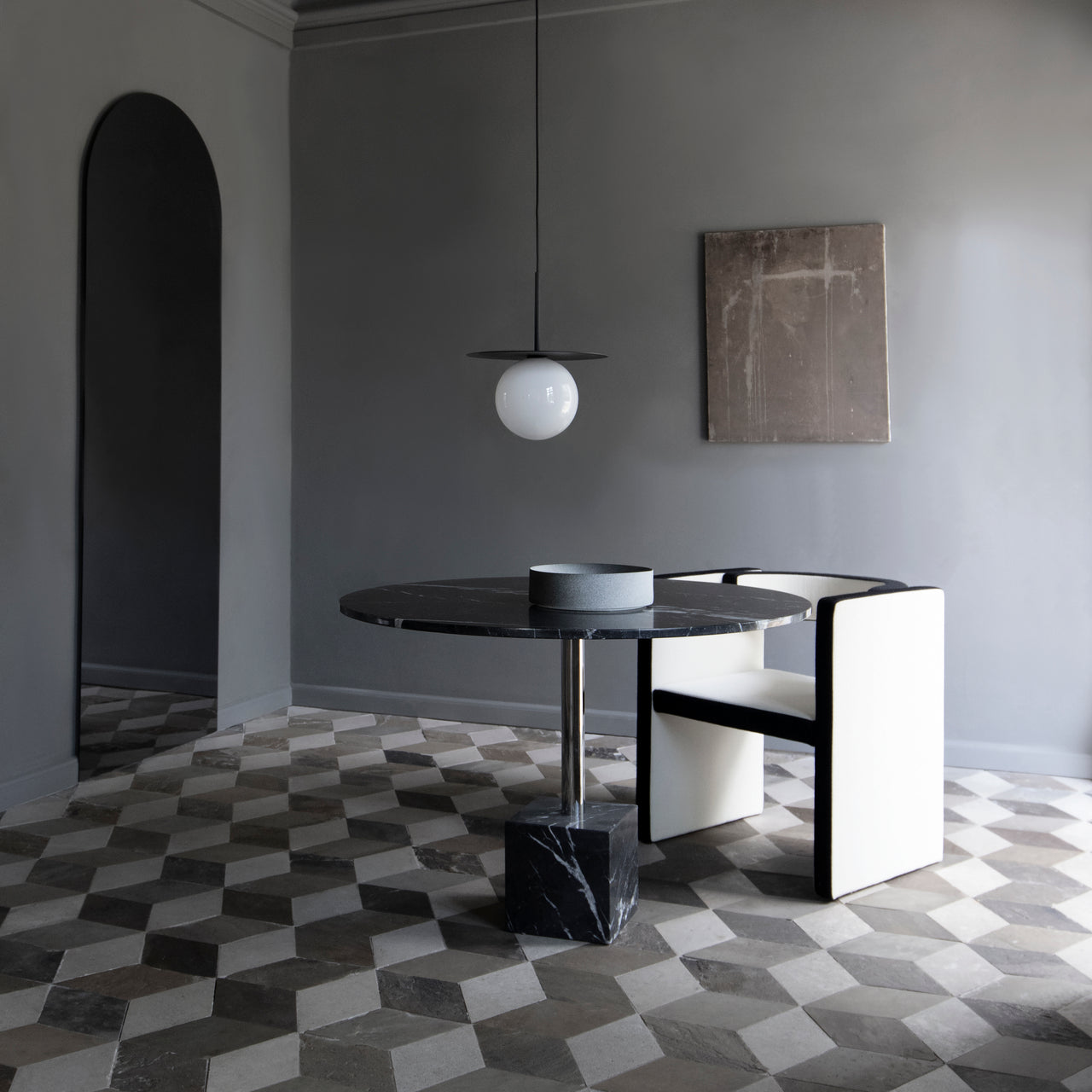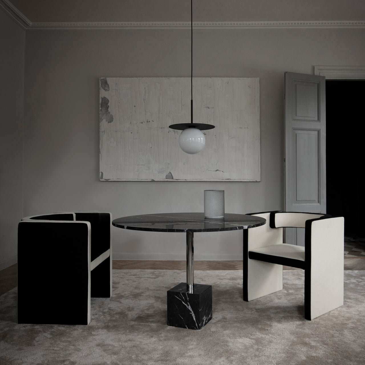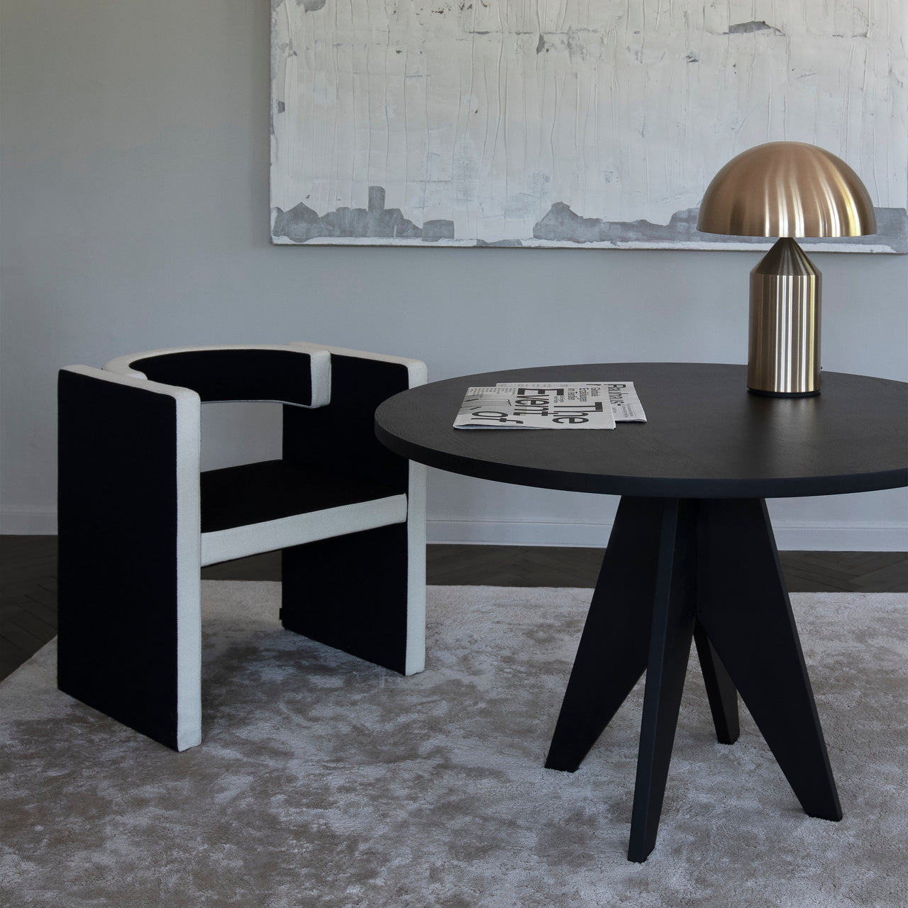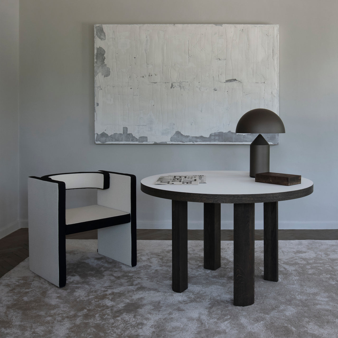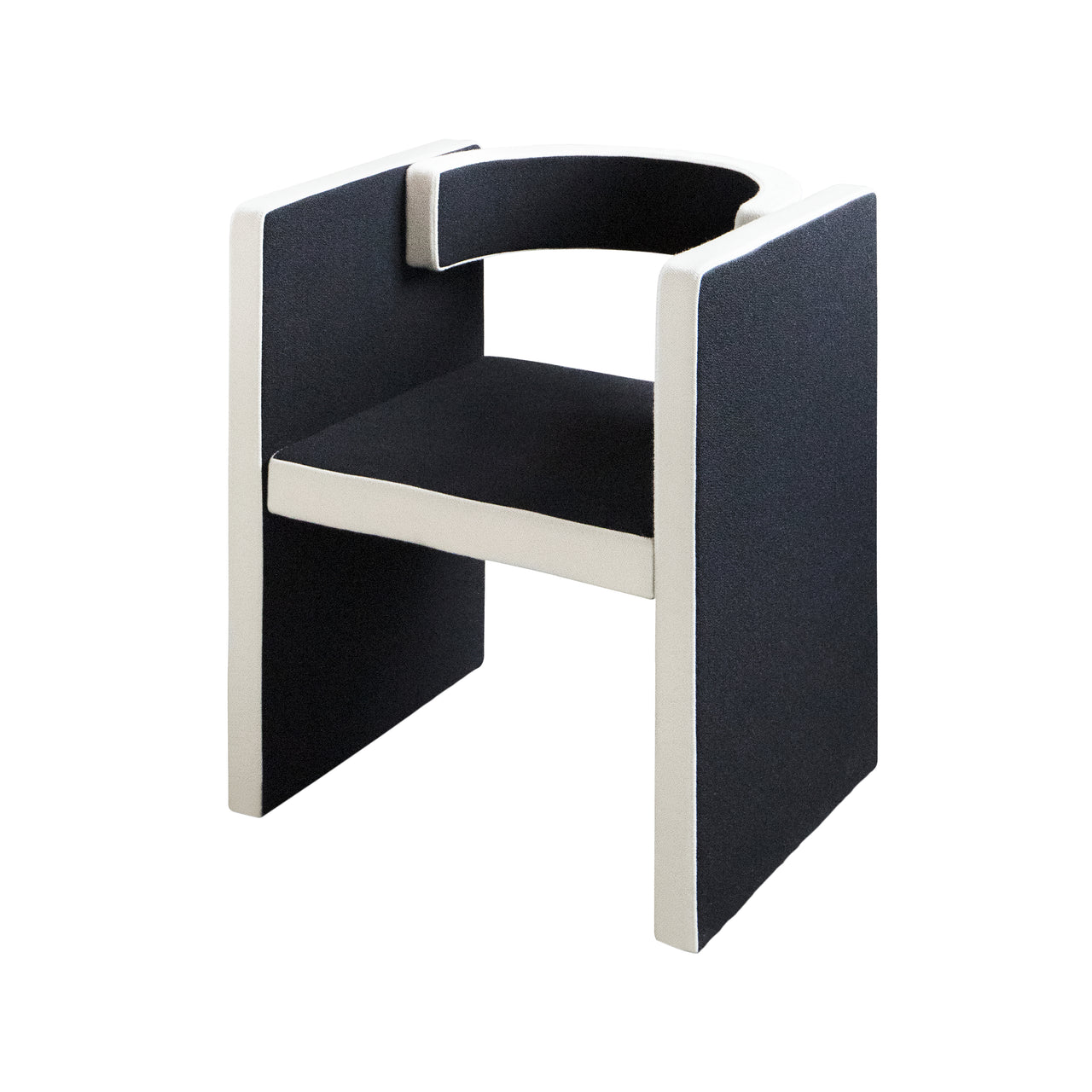 Friends & Founders shape a structured, stand-alone chair with the sharply defined allure of a certain Parisian designer’s “le smoking” tuxedo. Stark rectangular elements join the C-shaped back and roomy seat, clad in black on white boucle—or the reverse of that fashionably chic combo—for seating with a self-assured silhouette and eye-catching outline.