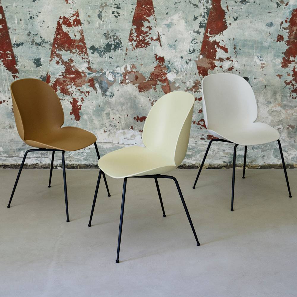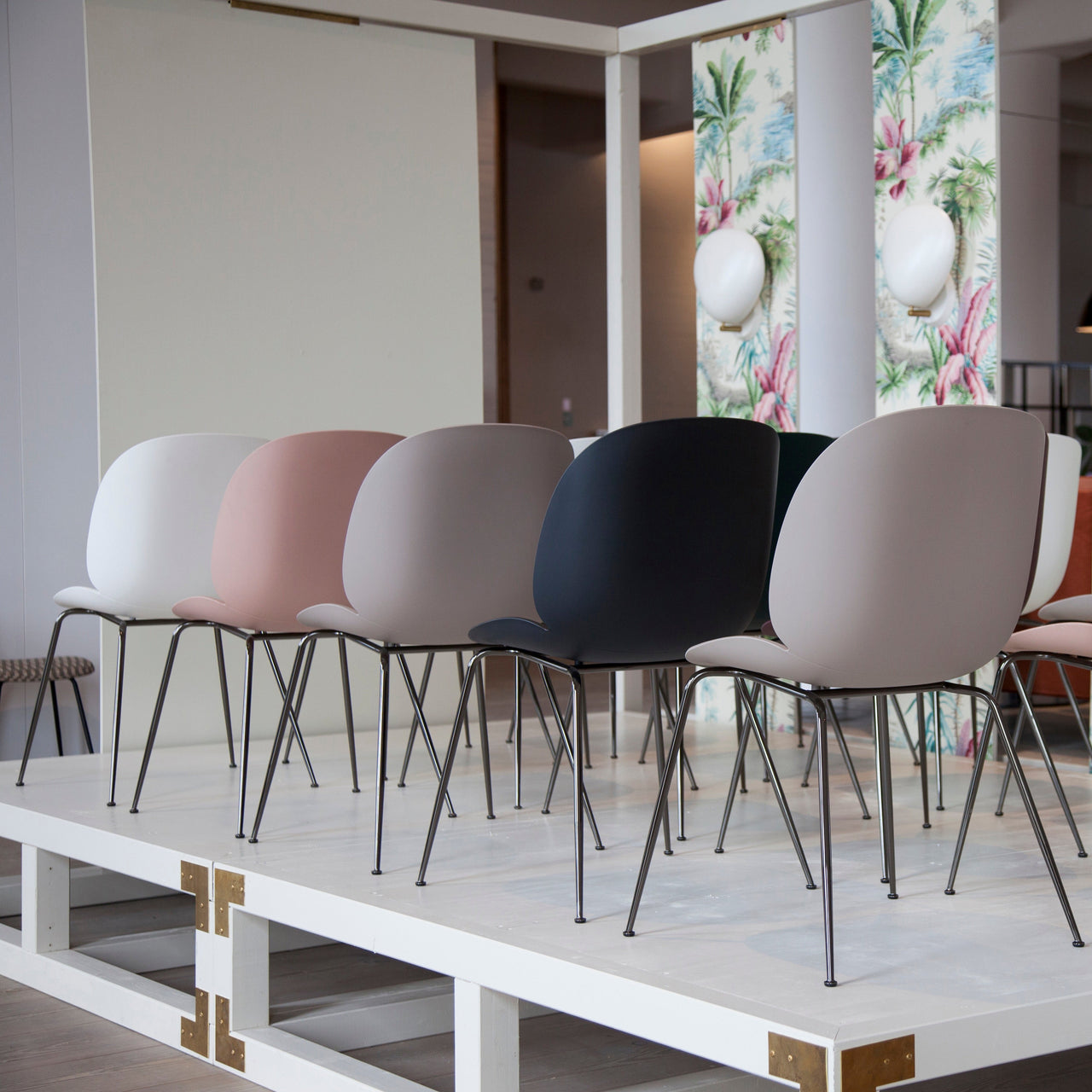 In its first-line version, design duo GamFratesi's take on that modernist classic—the molded shell chair—has a lighter expression and a versatility that suits both formal and informal spaces. Beetle Chair for dining is crafted with a polypropylene plastic shell with a curved silhouette inspired by its namesake in nature. The chair's subtle matte texture offers a soft tactility while its ergonomic contours make for outstanding sitting comfort at table or desk. In a wide spectrum of seat colors and a quartet of available finishes for the steel base, in matte black powder coat, chrome, blackened chrome or brass.