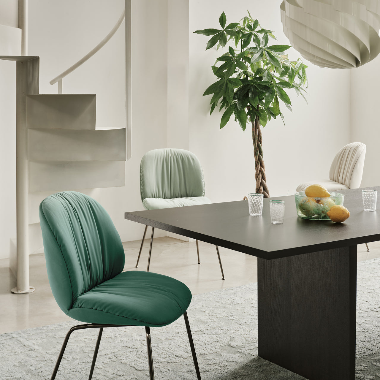The Gubi Beetle Soft Dining Chair's rounded, fully upholstered shell offers generous cushioning and support, while the sleek conical metal legs provide a refined contrast. Inspired by the structure of a beetle, the chair is designed to gently flex with the user, making it suitable for long periods of sitting. Available in a wide selection of fabrics and leathers, it can be customized to suit a variety of interiors, from homes to restaurants and offices.