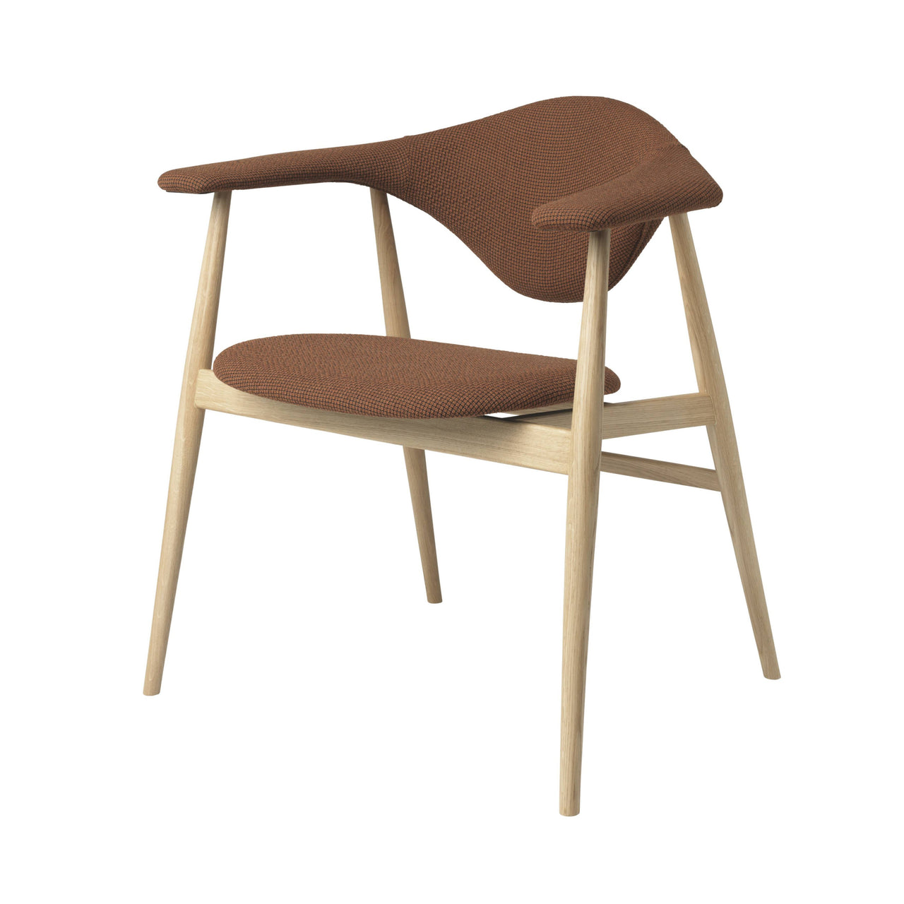 A genial wood base tilts the balance of this Masculo chair to the Scandinavian side of designer GamFratesi's amalgam of crisp Nordic style with a shot of Italian brio. Husband-wife duo Stine Gam and Enrico Fratesi play the signature idiosyncratic backrest against the clean lines of the solid wood frame for a highly versatile seating choice for dining or contract use. Wood finishes in black stained ash, natural oak, smoked oak and oiled American walnut to complement a wide variety of upholstery options in both premium textiles and rich leather.