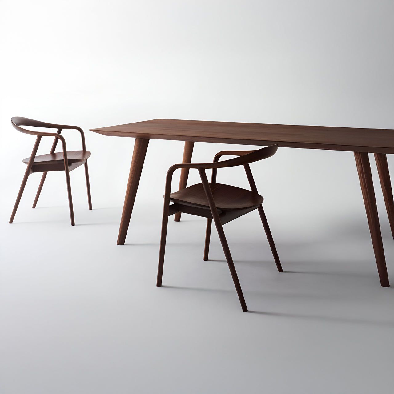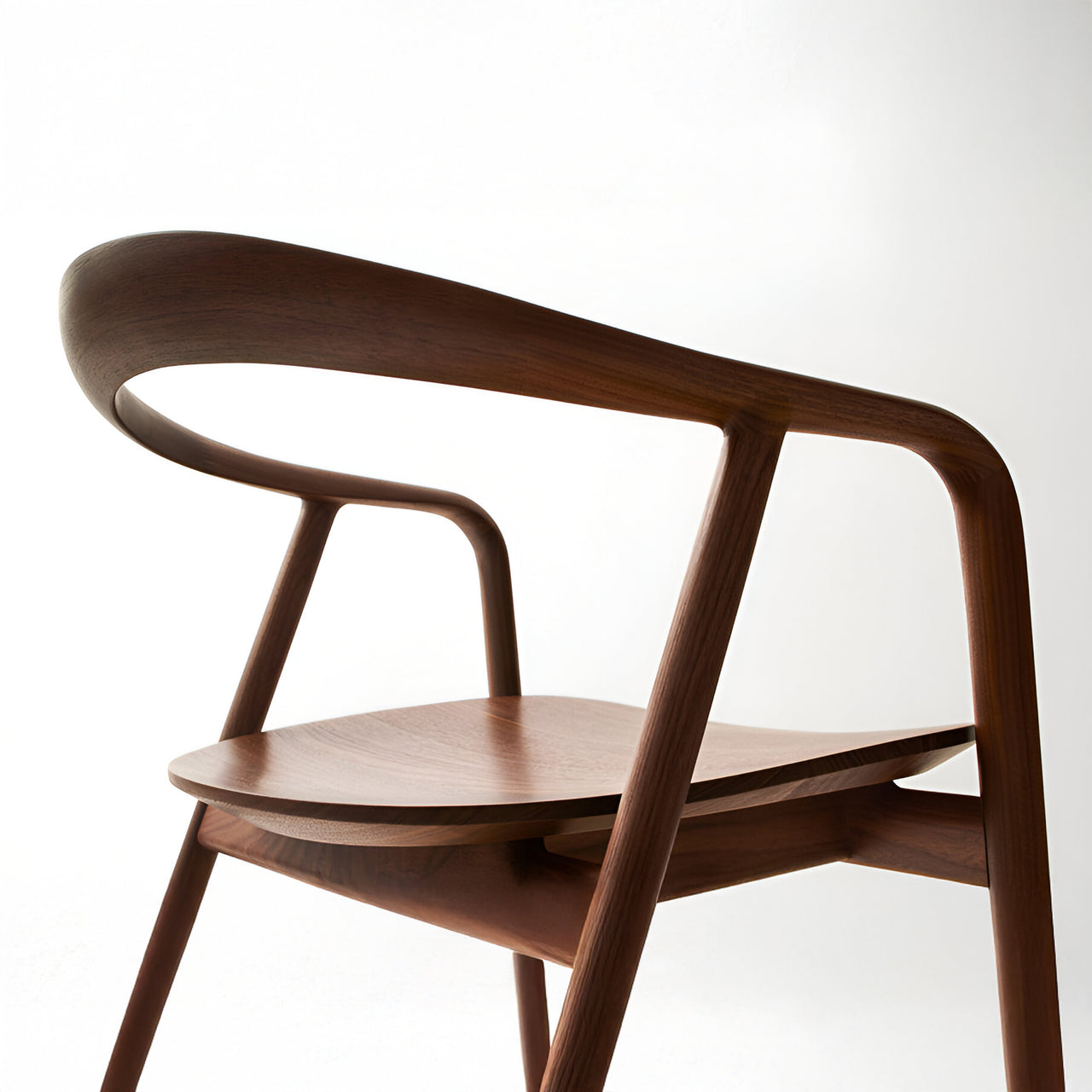 The Kumahida Armchair, designed by architect Kengo Kuma, combines softness and lightness in its structure. Made from solid walnut or white oak, the chair features a single bentwood piece that connects the front legs, arms, and back rail, creating a smooth, continuous shape. The seat is gently sculpted to fit the human body, with tapered edges that give it a weightless appearance. This design emphasizes the natural beauty of the wood.