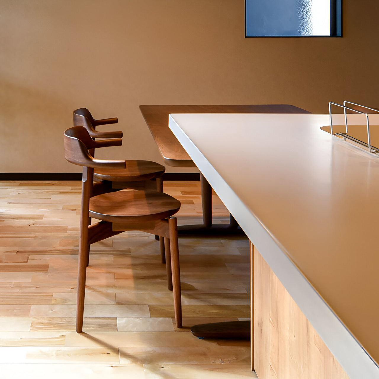 The Tsubura Semi Armchair features a seamless backrest and armrests crafted from a single piece of bentwood, highlighting the continuous wood grain. The three-dimensional curvature of the backrest and the contoured seat offer gentle support for added comfort. Built for durability, the chair has reinforced joints between the legs and seat frame. Available in oak or walnut.
