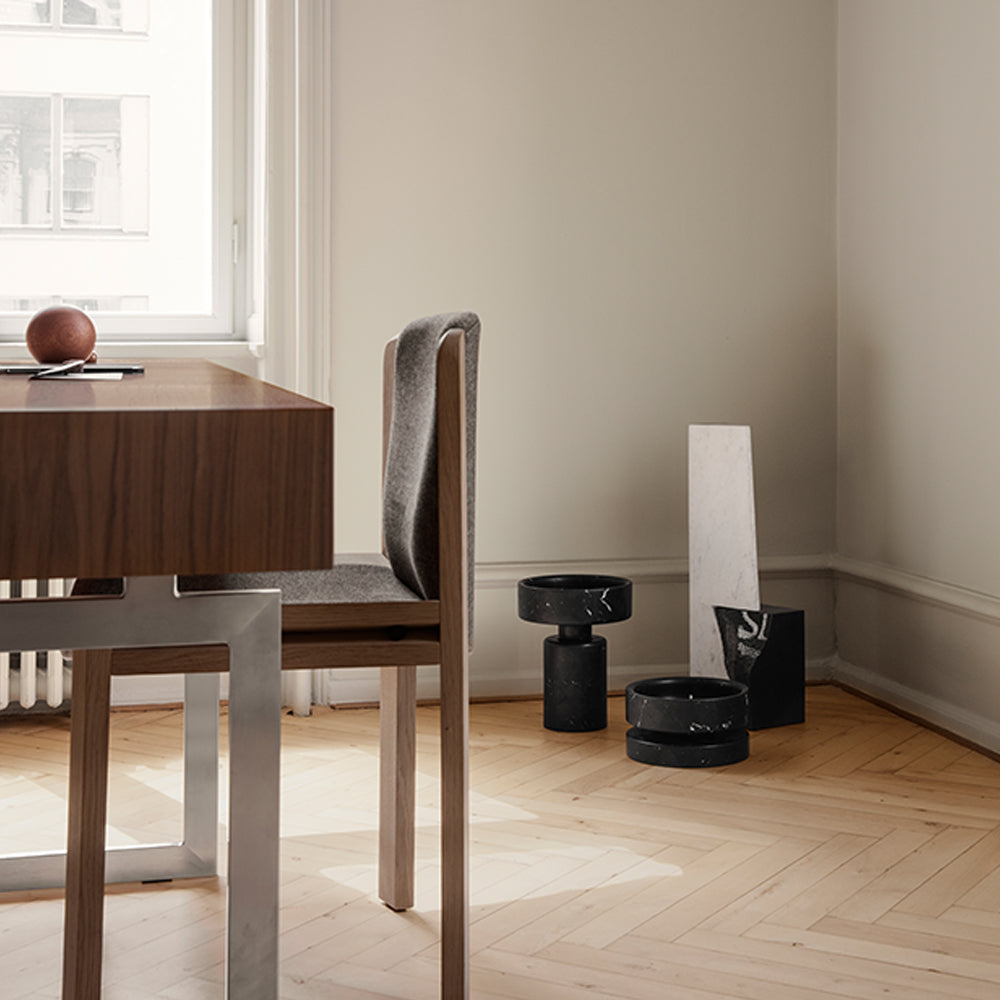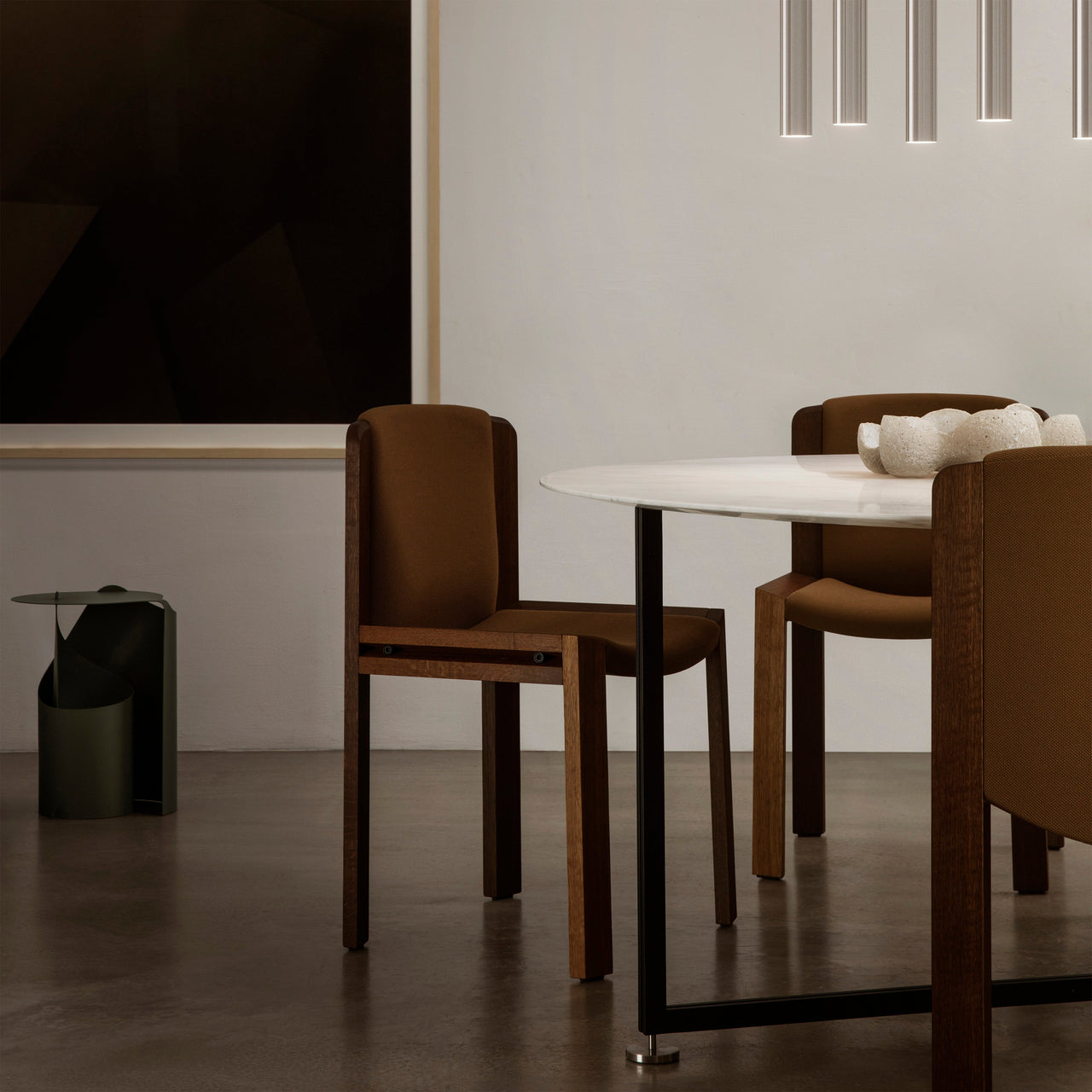 Milanese artist-turned-designer Joe Columbo melded a certain Italian sensuality with his characteristic functional sensibility in his Chair 300 from 1965. The defining, indulgent curve of the seat and backrest contrasts with a strikingly angled frame rendered in solid oak. Upholstered in fabric or leather, the now-revived seating from Copenhagen’s Karakter beckons comfortably, with a choice of frame in several select wood finishes.