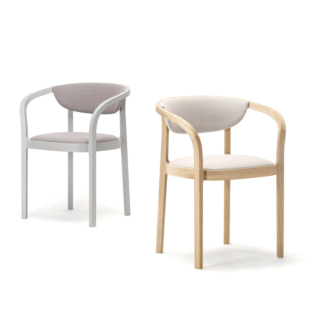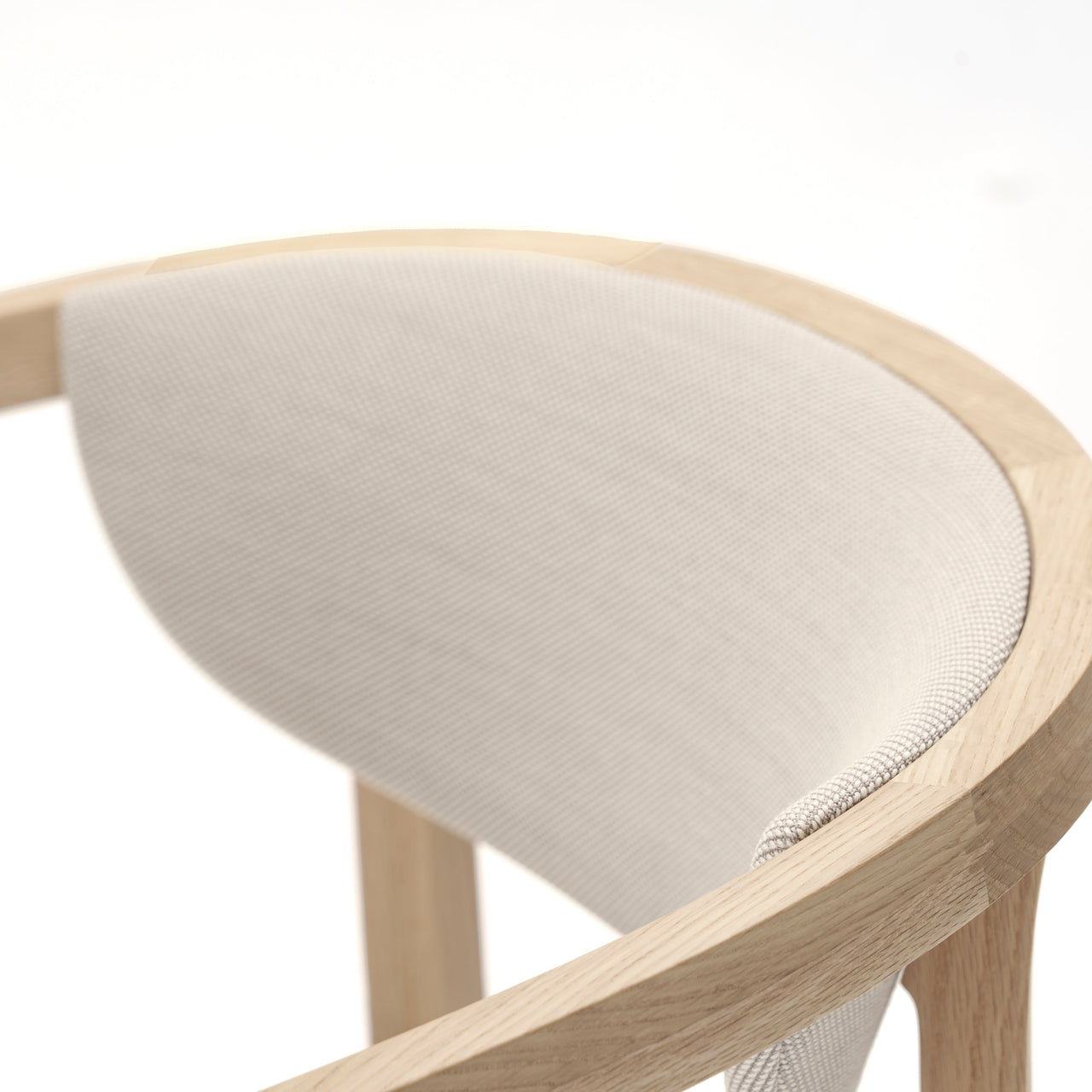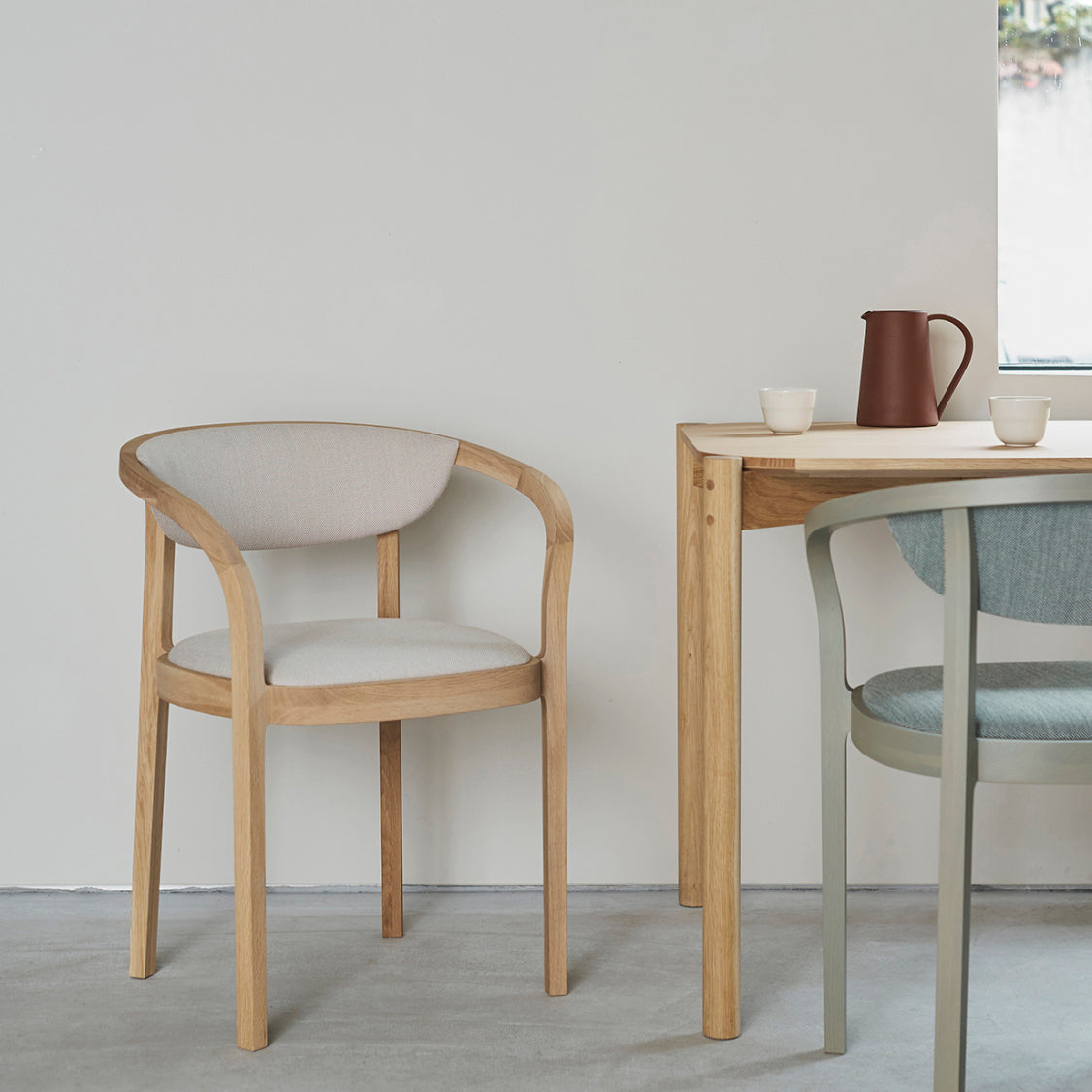 With its padded seat and back clad in Kvadrats Steelcut textile in one of 4 colorways to match its finely crafted solid-oak frame and bent plywood backrest, Chesa underscores the refined air of its calm and elegant design by Jórg Boner. As either a meeting or dining choice, the chair is distinctly characterized by the continuous curvature of the line that follows from the front legs to the backrest, making it a comfortable, cosseted space that also allows for sitting diagonally and facing conversation partners on each side.