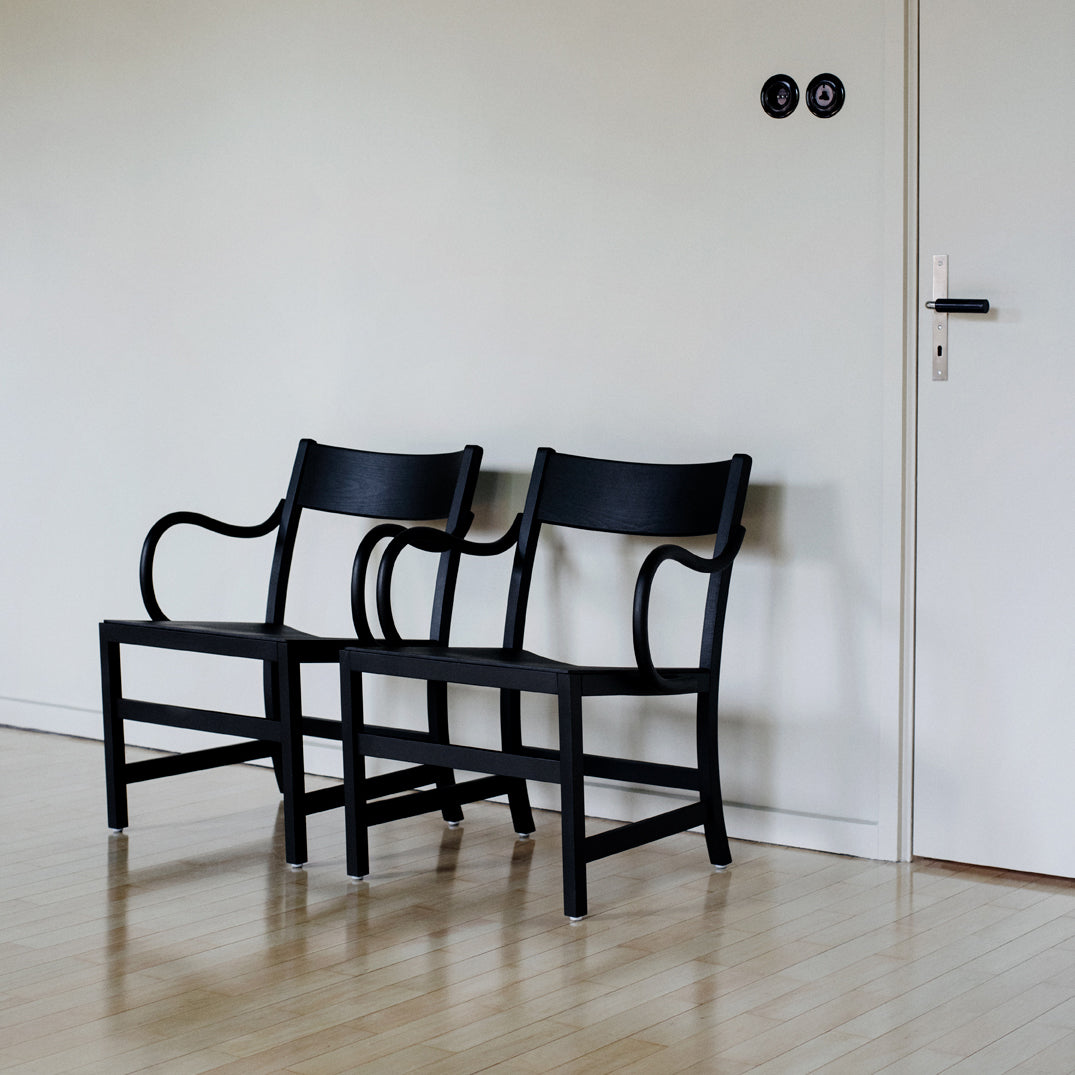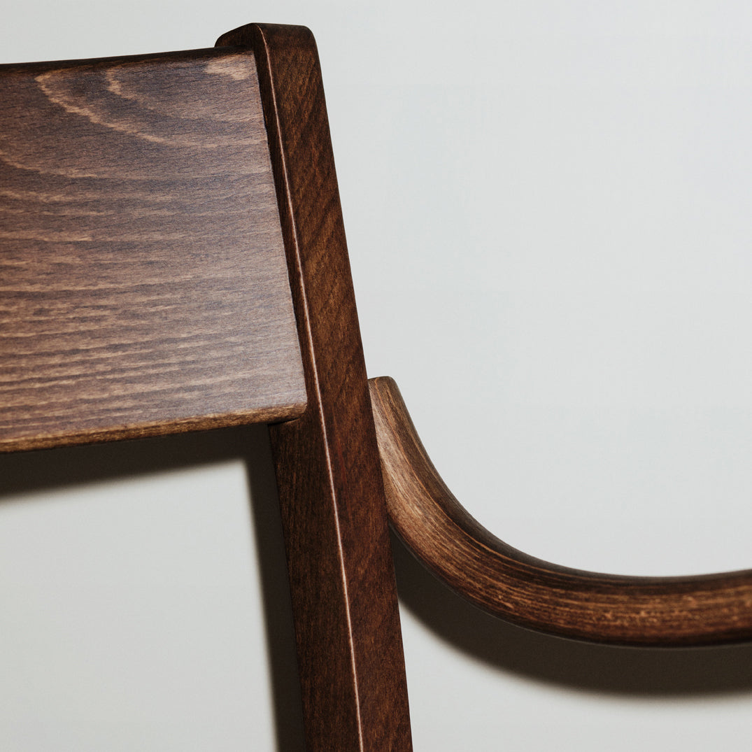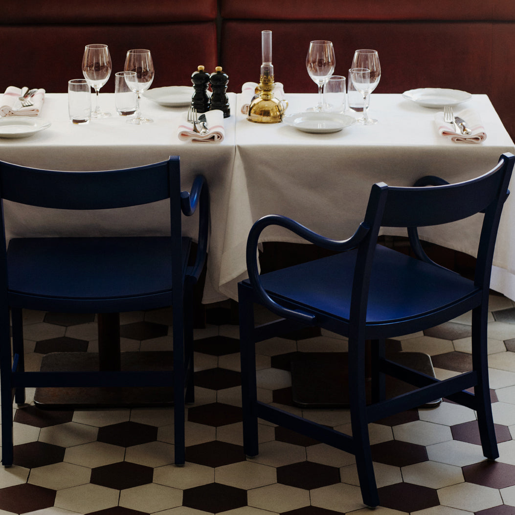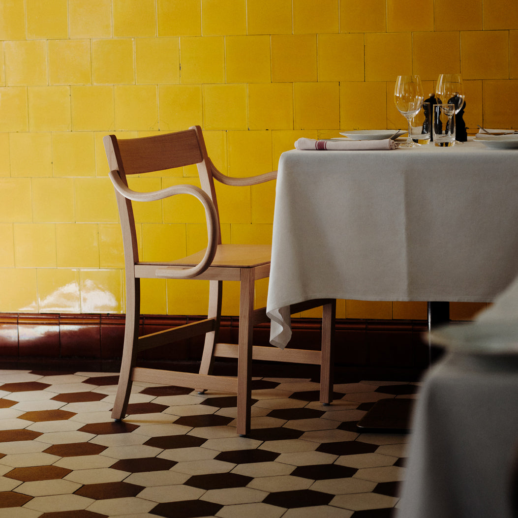 An armchair version of Massproductions' upscaled Waiter XL brings added ease to the dining experience. Named for the servers who inspired it, the Stockholm-based company's signature chair is crafted from FSC-certified, European solid wood. Even the back chair legs are curved inward under the seat to keep passers-by from tripping. At regular chair height but featuring broader seat proportions, this XL definitely encourages lingering at the table.