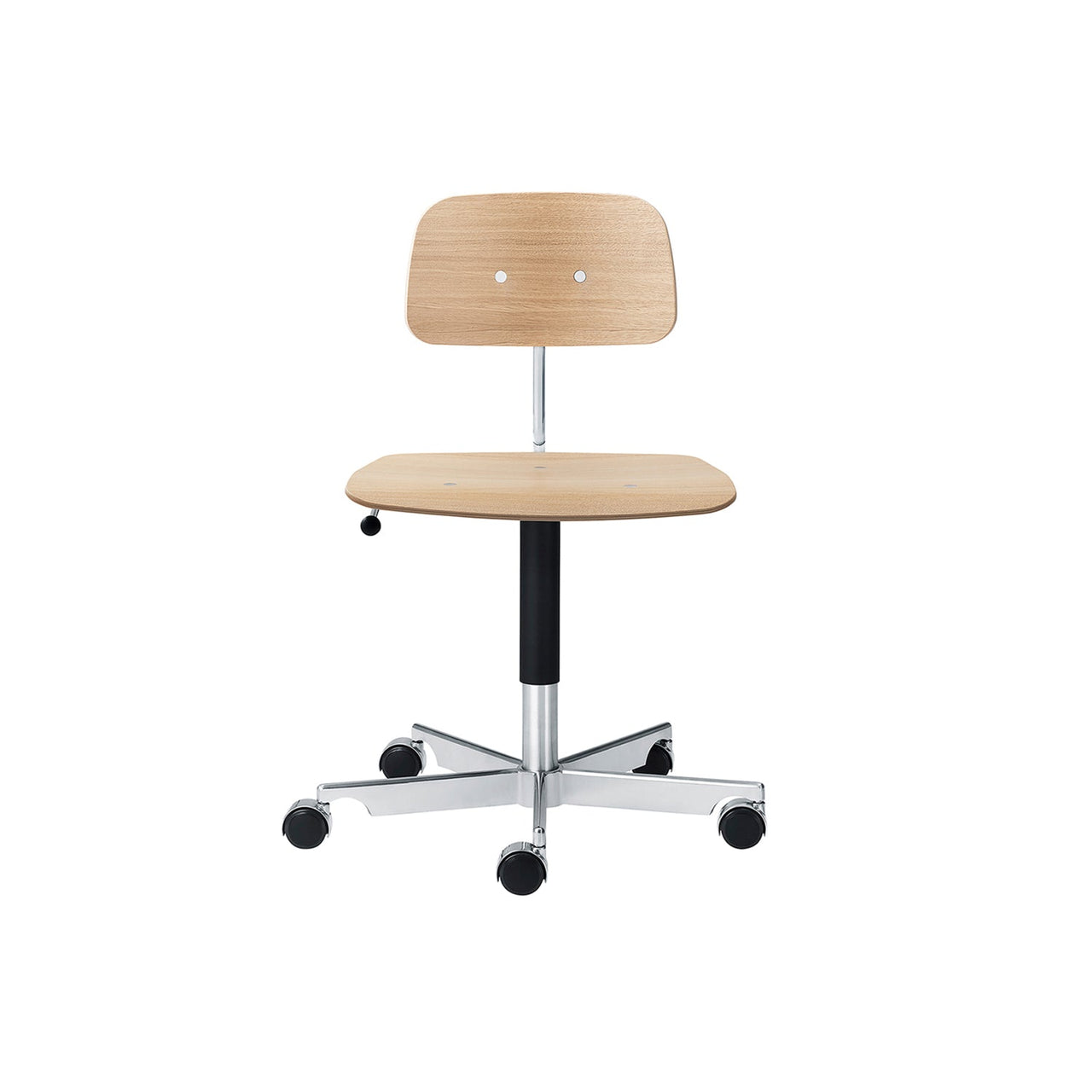 Available in oak veneers or black or white lacquer with optional seat and/or back upholstery in an array of premium textiles or leather. In 4 different seating heights, all with satin-finish aluminum base equipped with automatic adjustment and double-wheel castors, now an industry standard and also first introduced by Jørgen.
