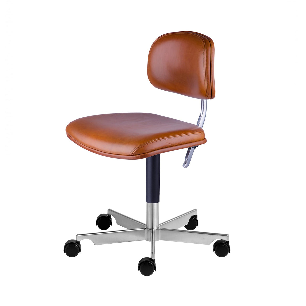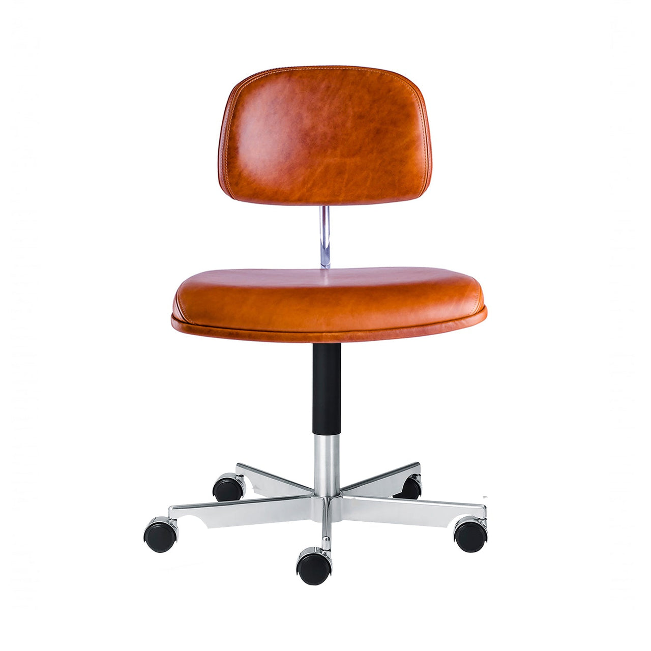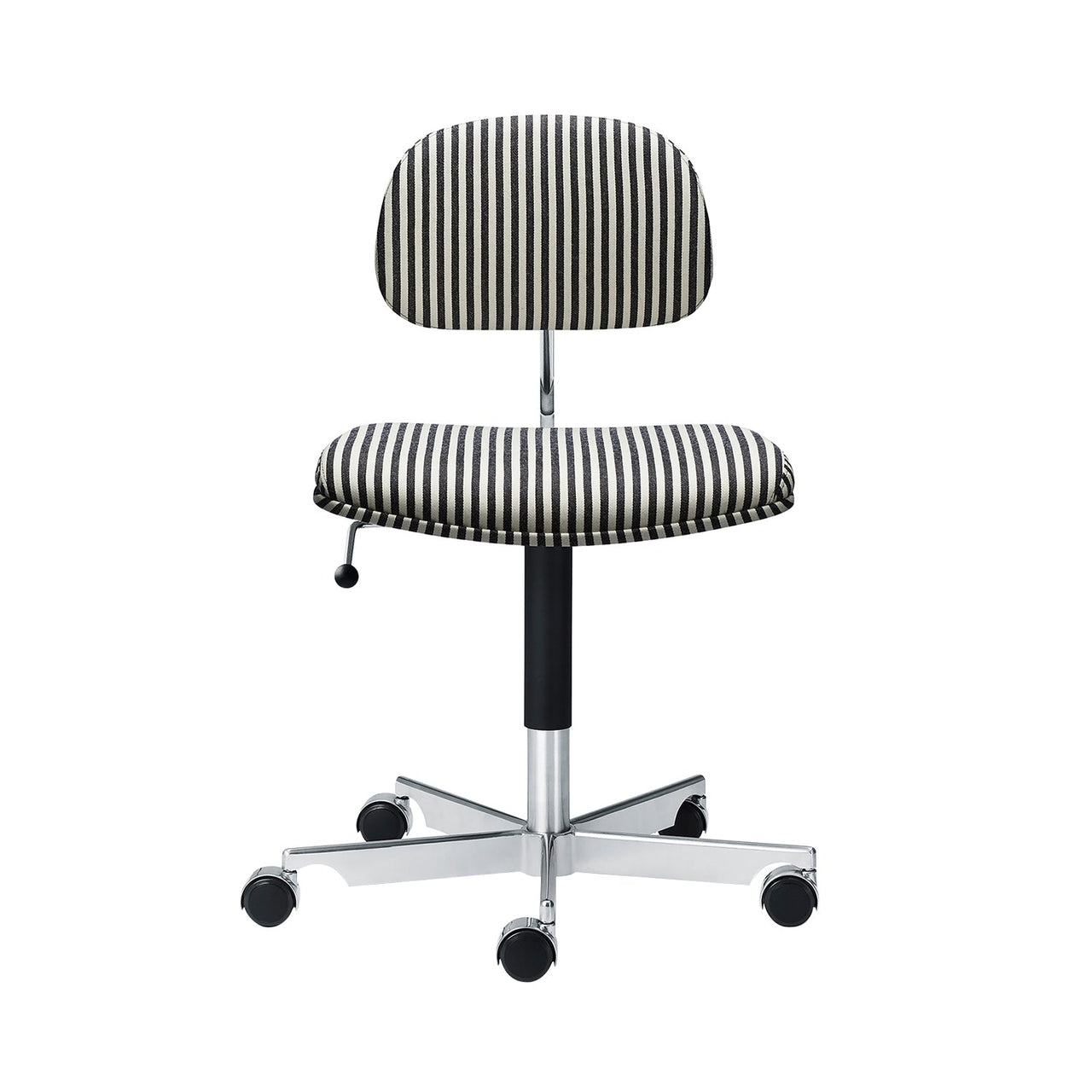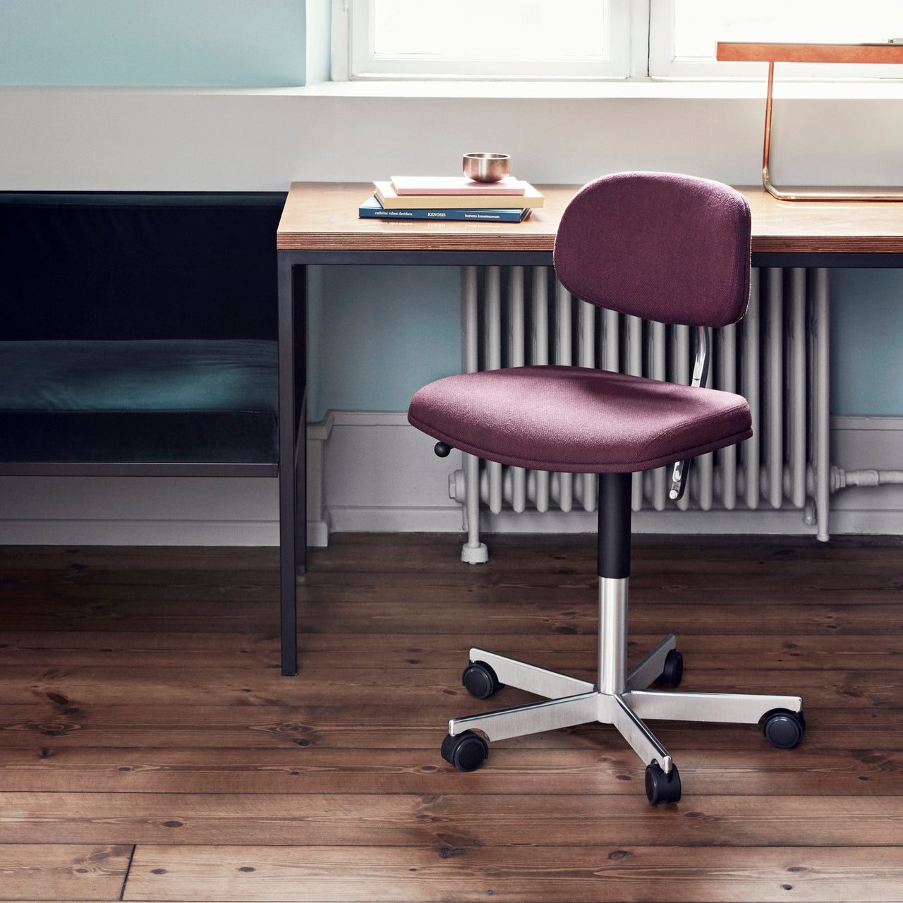 Durable foam-molded seat and thick backrest with upholstery in a selection of fine fabrics or leather. Available in 4 different height options, all with the characteristic aluminum base equipped with automatic height adjustment and the now-ubiquitous double-wheel castor devised by Jørgen for the original Kevi.