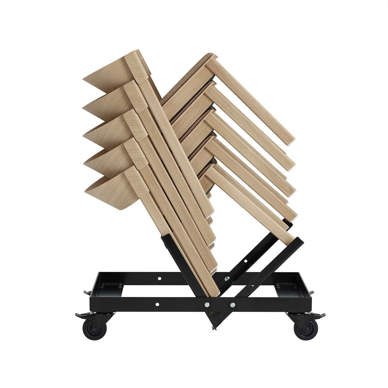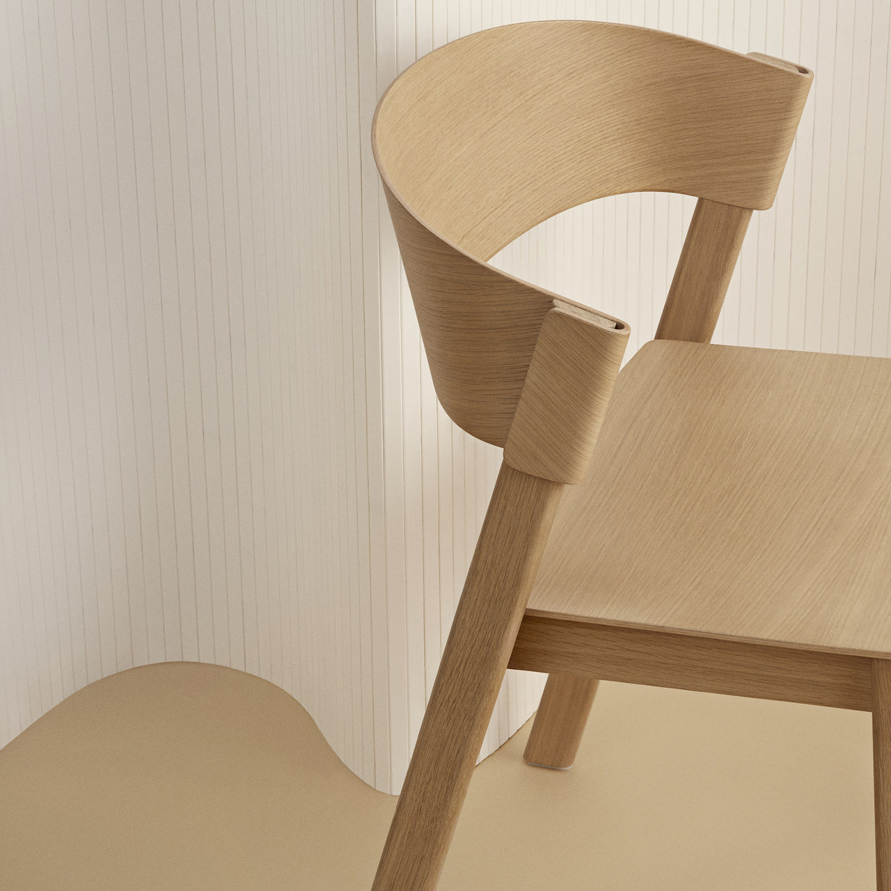 Thomas Bentsen provides an impeccable perspective on the timeless and essential wooden side chair. The designer proposes a curved backrest that folds elegantly around its back legs and ties all the elements together, thus the name Cover. The chair is stackable and features a water-based lacquer in a range of hues, with the curved back and seat in veneer and its base and legs in solid oak.