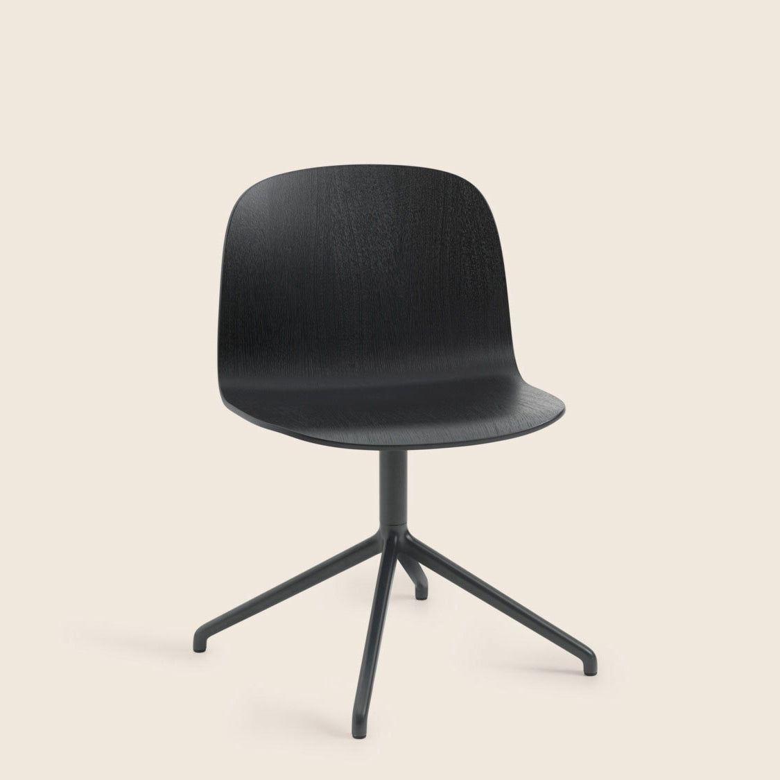 Automatic swivel-seat return brings added ease and functionality to Visu Wide, the slightly larger version of Muuto's handsome molded-wood chair. Scaled at about 4 centimeters wider and deeper than the standard model, its generous proportions and long-wearing comfort are welcome in dining, office or conference environs. Helsinki designer Mika Tolvanen's signature chair combines thoughtful ergonomics and the appeal of natural woodgrain, with a powder-coated aluminum base.