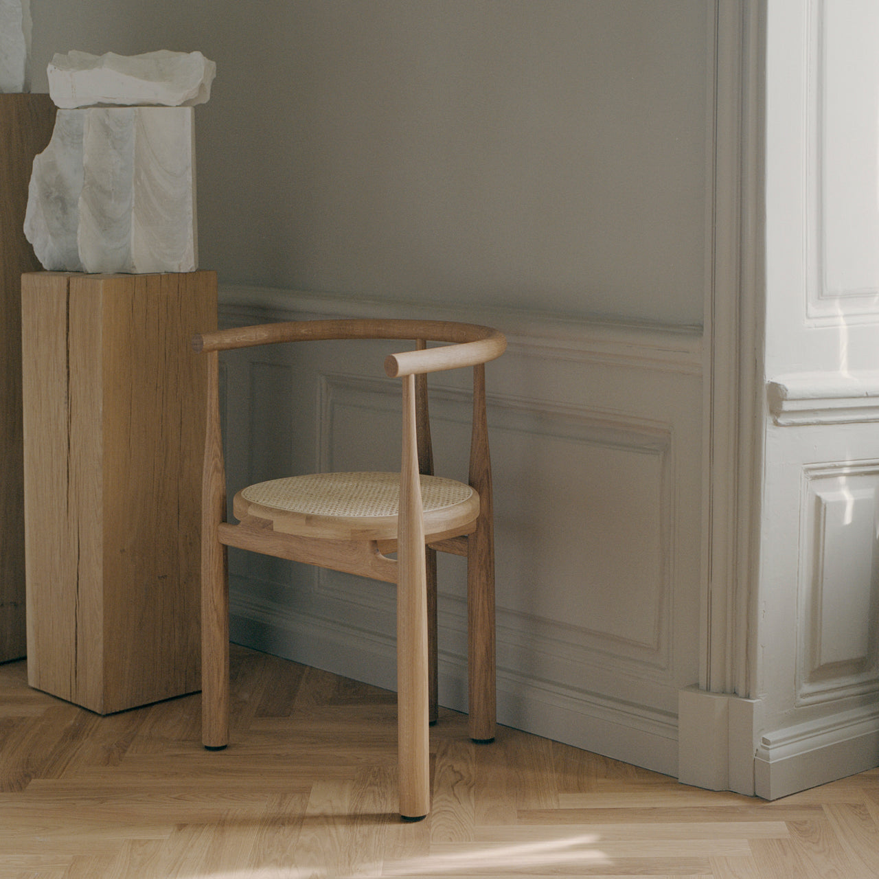The Bukowski Chair, designed by Steven Bukowski, combines mid-century modern influences with contemporary design. This chair features a striking silhouette characterized by a decisive transition between slim and solid forms. The curvaceous legs, bold geometry, and low center of gravity give the chair a strong and monumental feel. Crafted from high-quality materials in finishes such as walnut, white oak, or black lacquer, and available in upholstered seats or French cane, the Bukowski Chair offers great versatility.