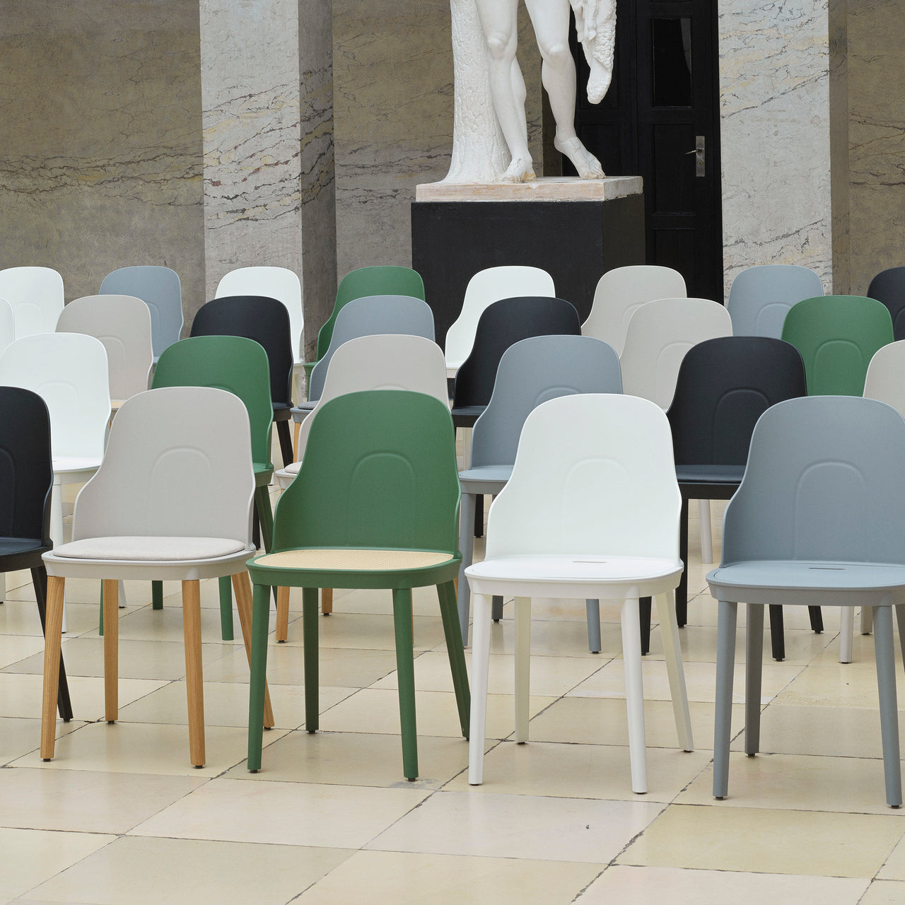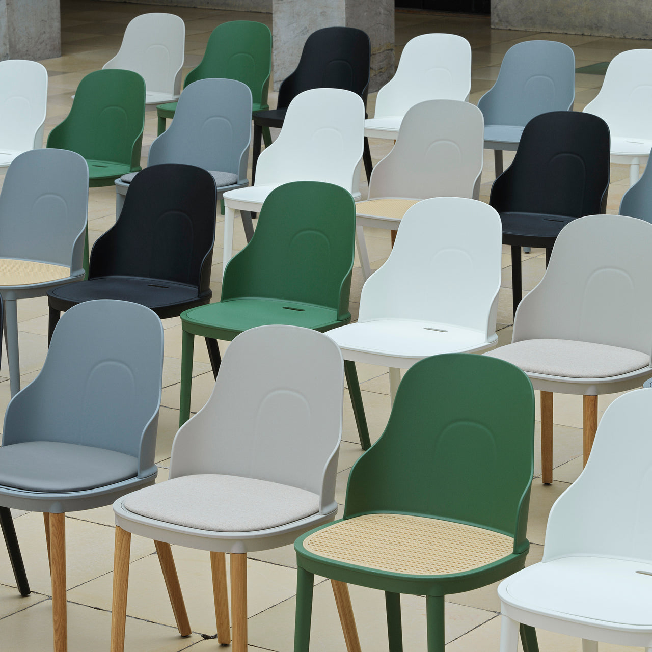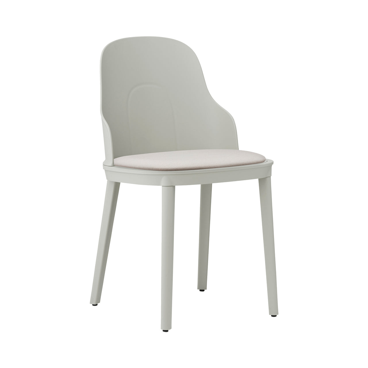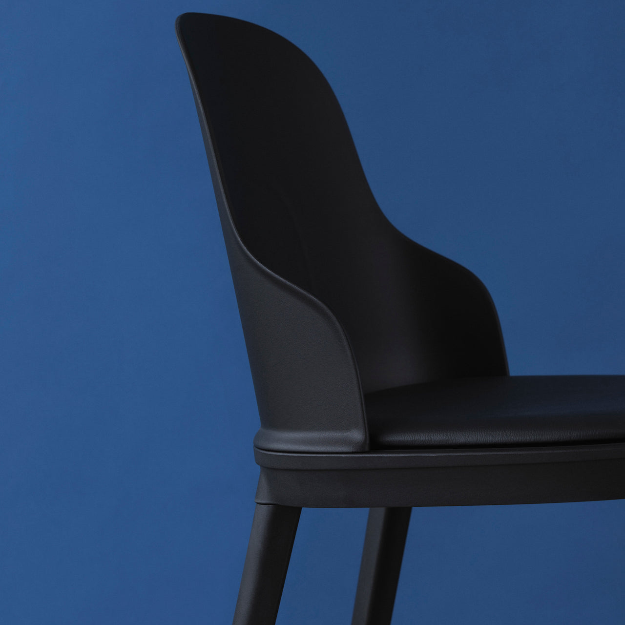 An upholstered seat heightens both the comfort level and the means to personalize Normann Copenhagen's updated café-style chair. Clad in a selection from a choice of fine fabric or leather, the cushioning complements Allez's curved shell with reinforced backrest in Simon Legald's design. The chair comes with a choice of matching plastic legs in a range of Nordic colors or in lacquered oak. Delivered sustainably flat-packed. (Assembly manual included.)