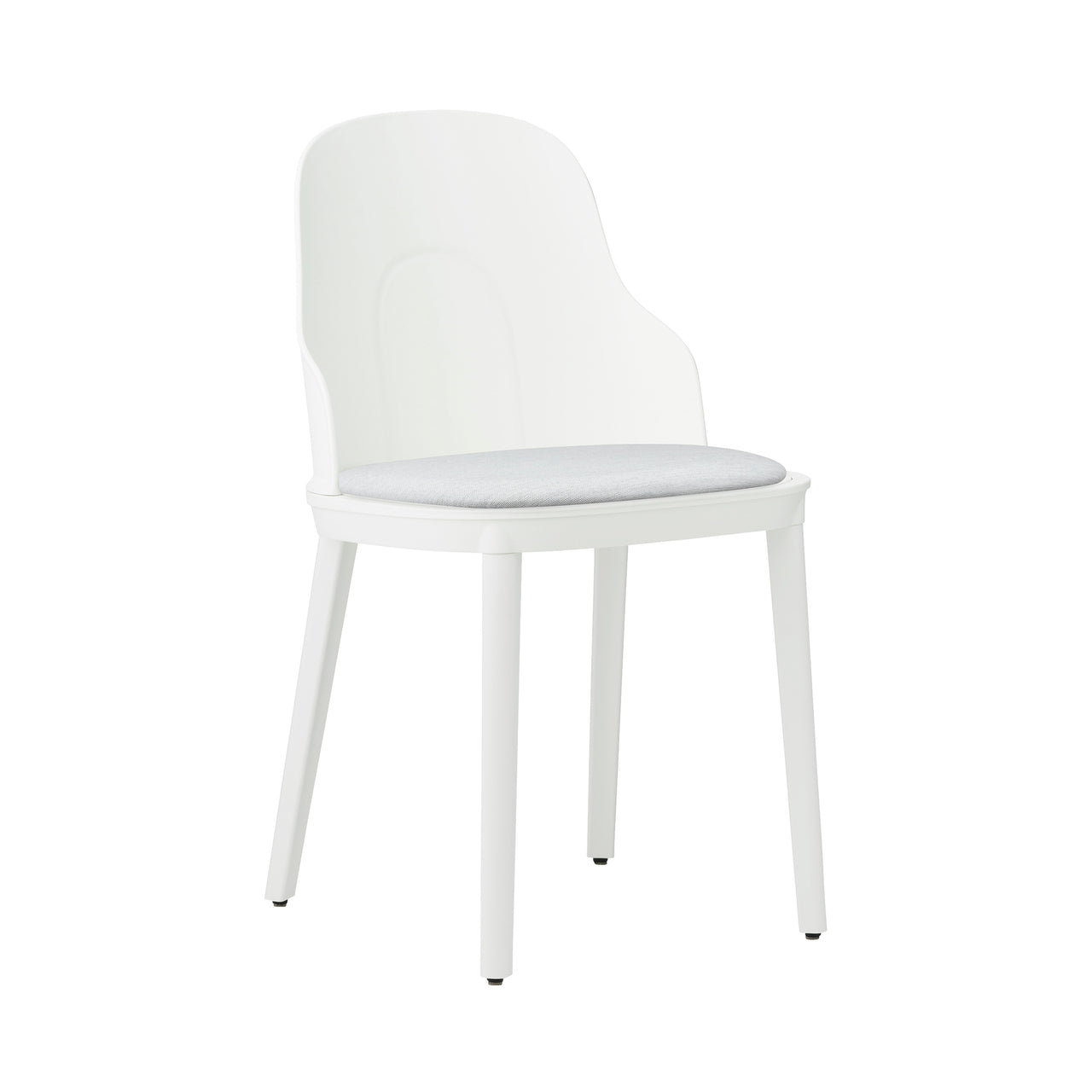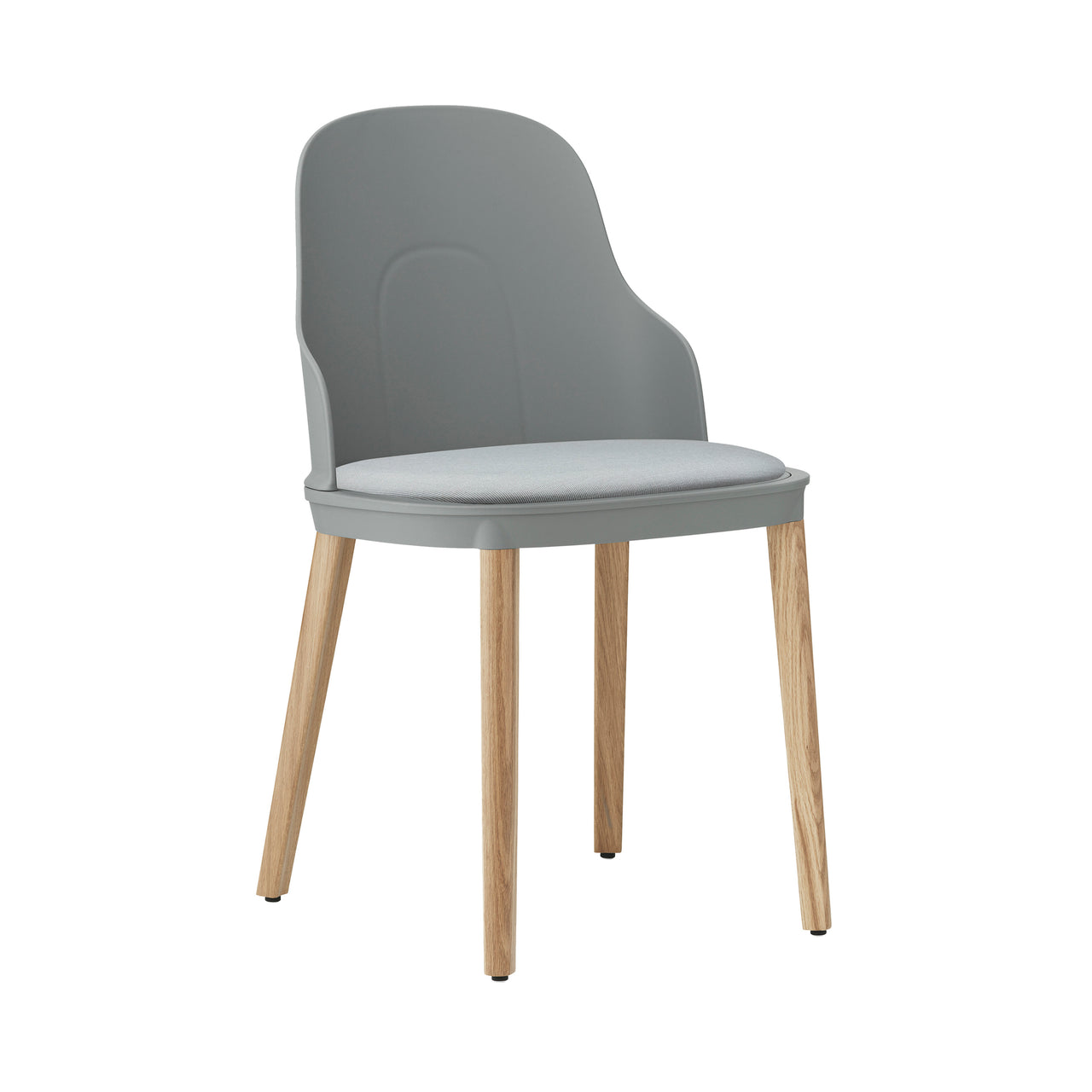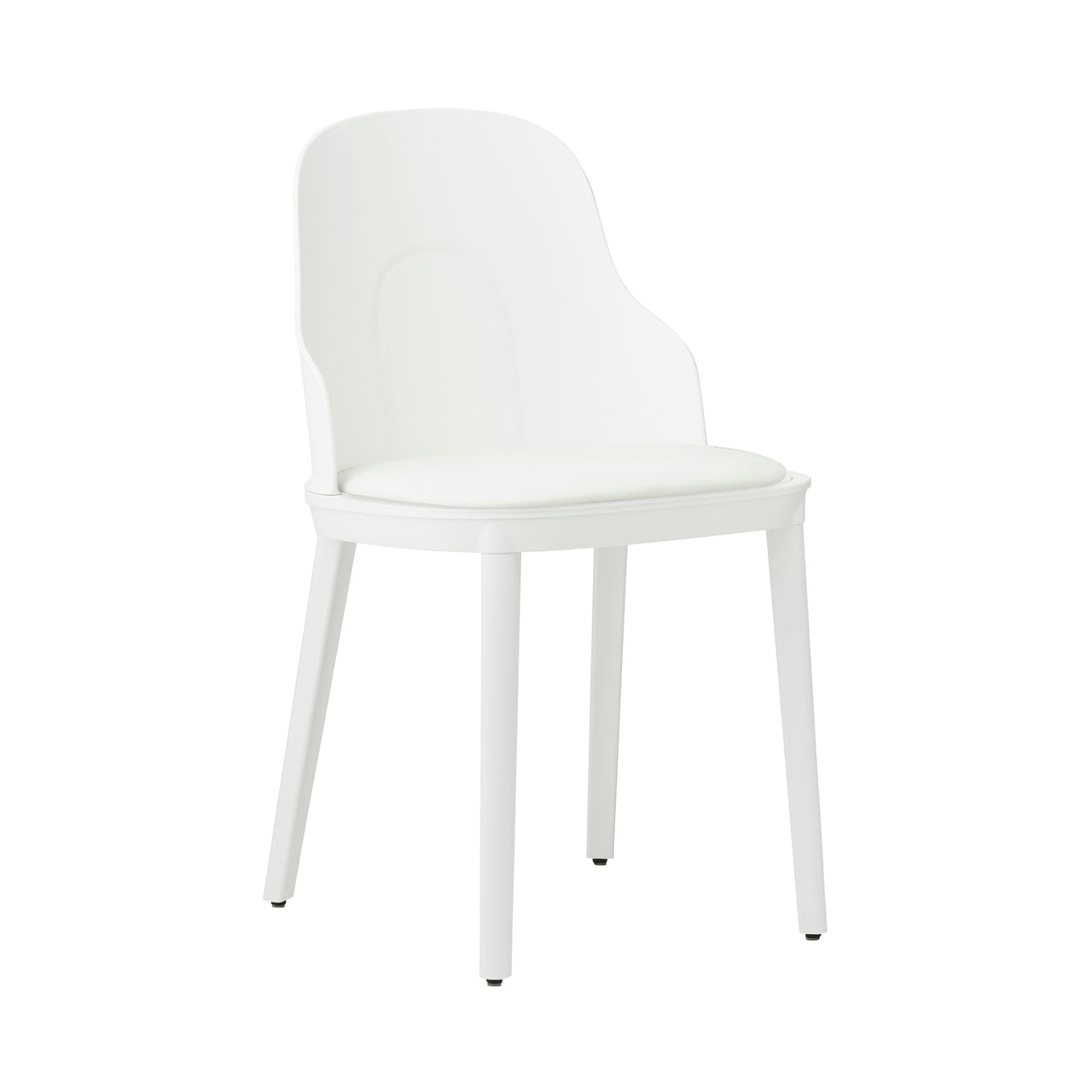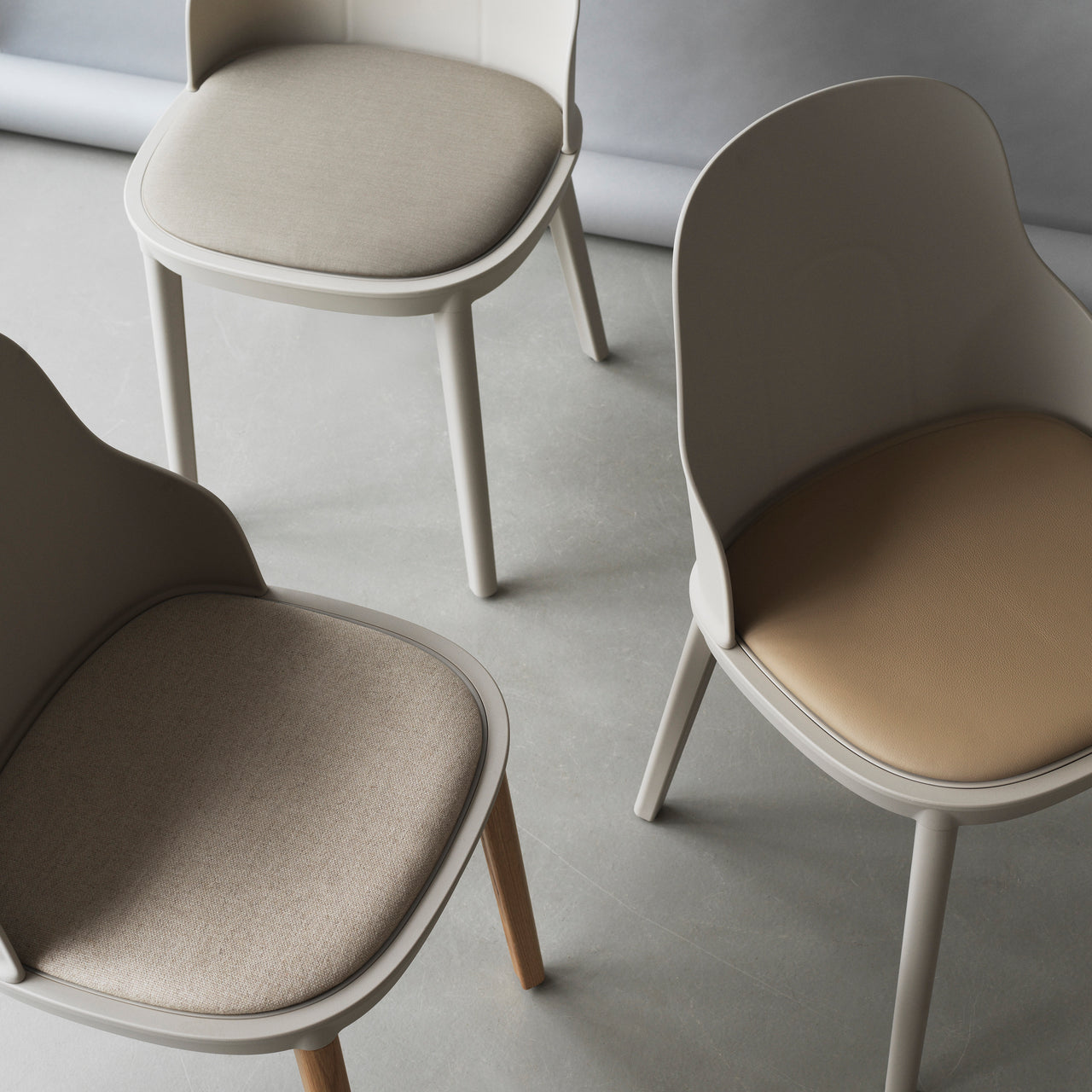 An upholstered seat heightens both the comfort level and the means to personalize Normann Copenhagen's updated café-style chair. Clad in a selection from a choice of fine fabric or leather, the cushioning complements Allez's curved shell with reinforced backrest in Simon Legald's design. The chair comes with a choice of matching plastic legs in a range of Nordic colors or in lacquered oak. Delivered sustainably flat-packed. (Assembly manual included.)