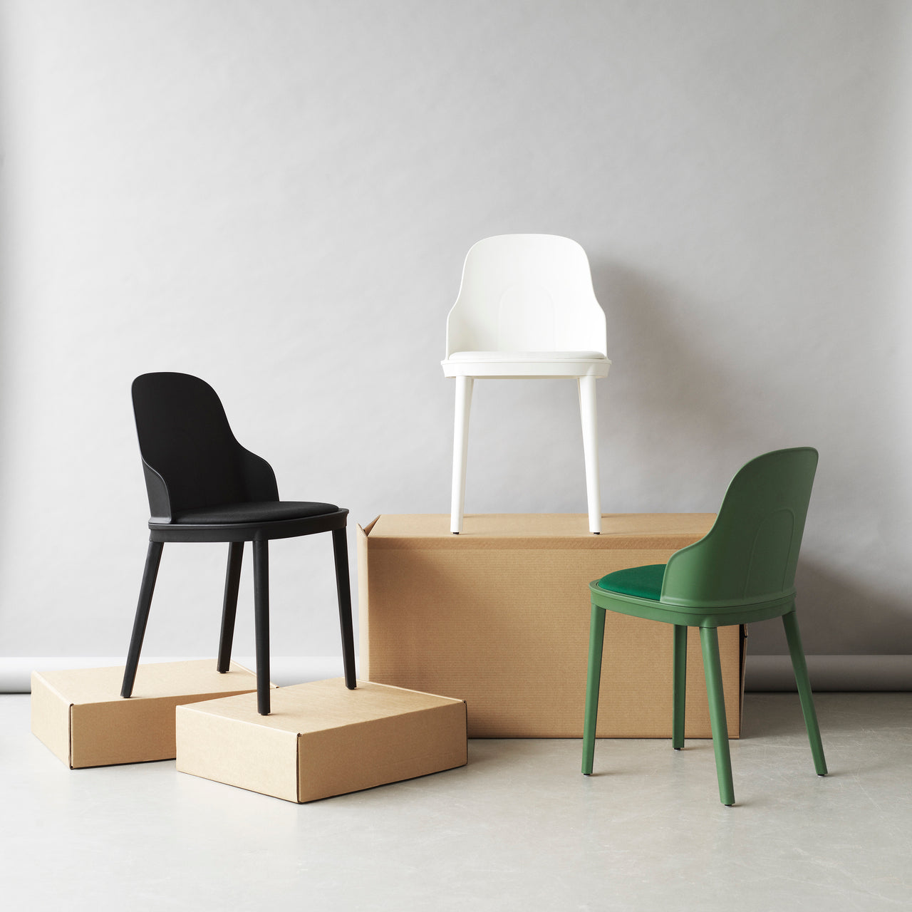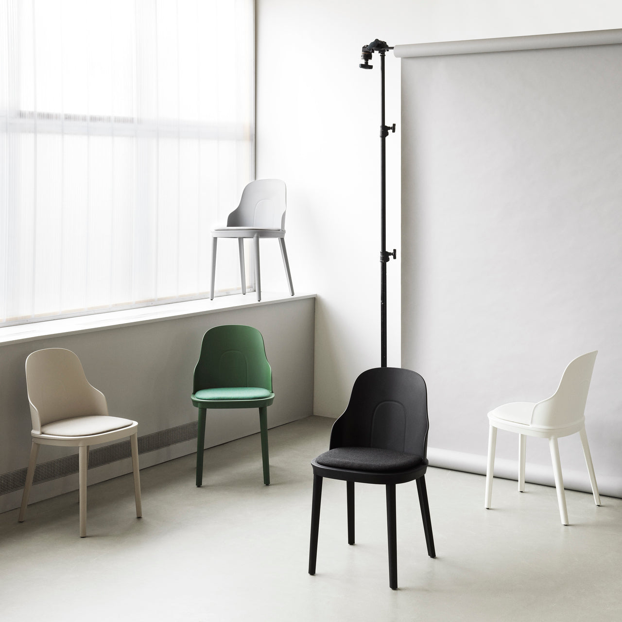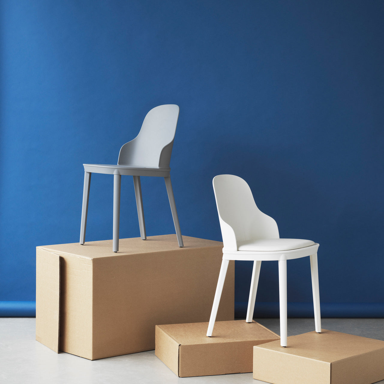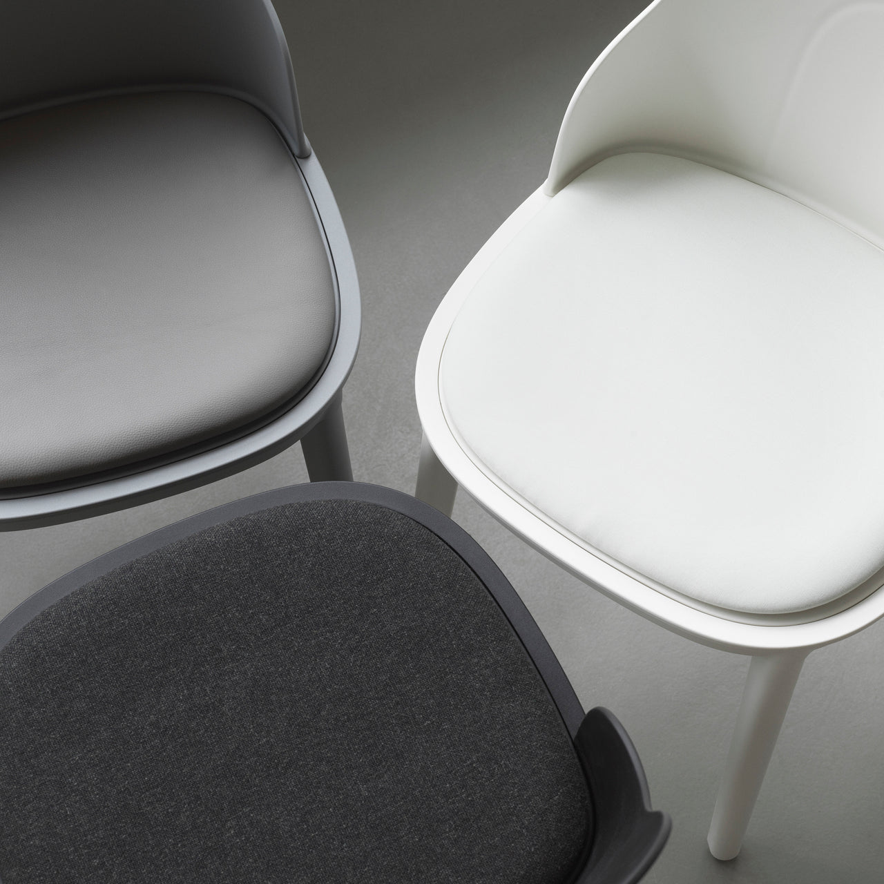 An upholstered seat heightens both the comfort level and the means to personalize Normann Copenhagen's updated café-style chair. Clad in a selection from a choice of fine fabric or leather, the cushioning complements Allez's curved shell with reinforced backrest in Simon Legald's design. The chair comes with a choice of matching plastic legs in a range of Nordic colors or in lacquered oak. Delivered sustainably flat-packed. (Assembly manual included.)