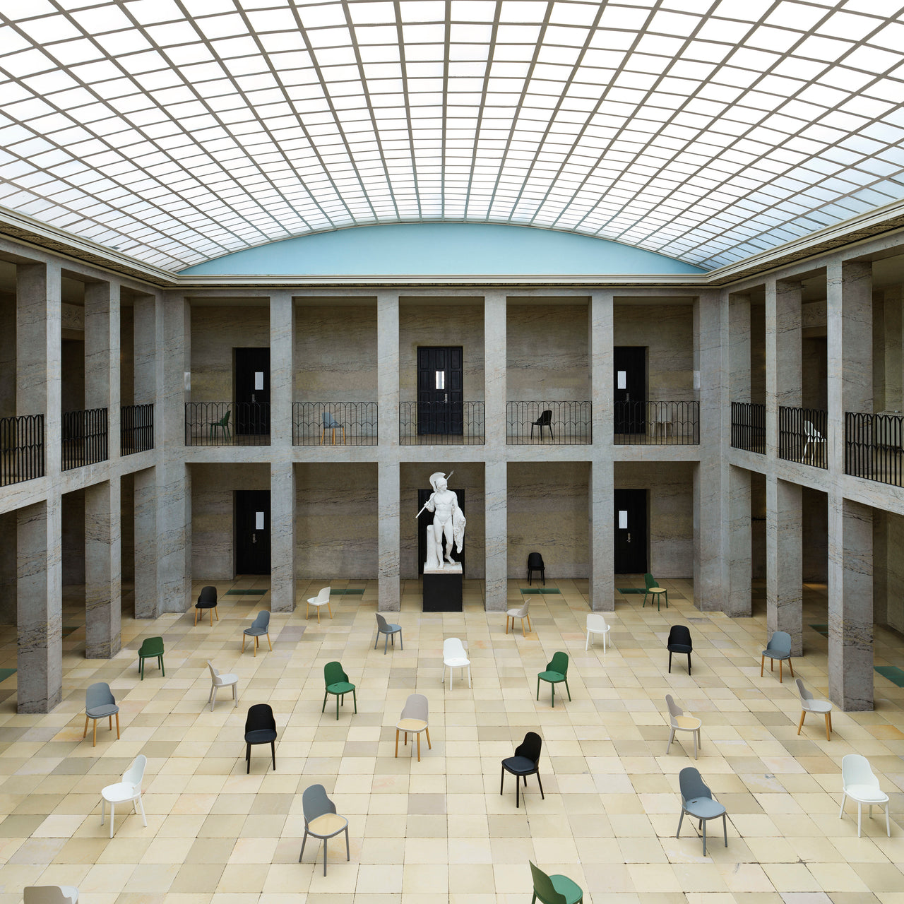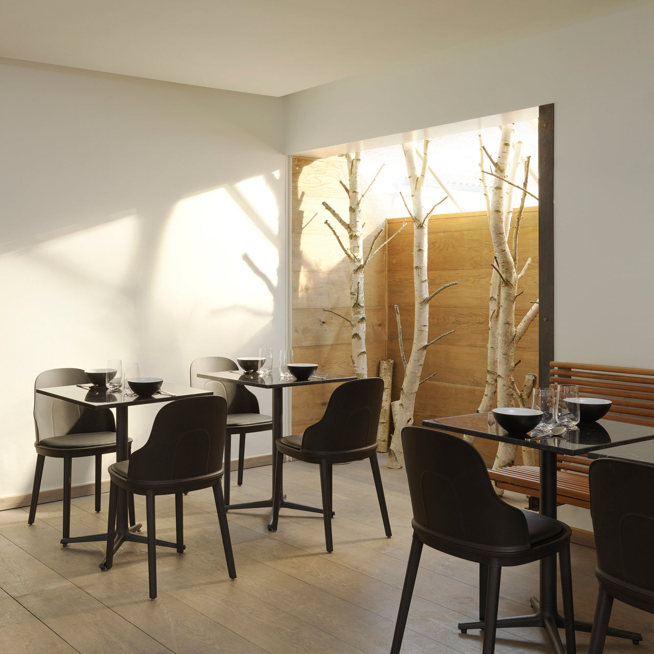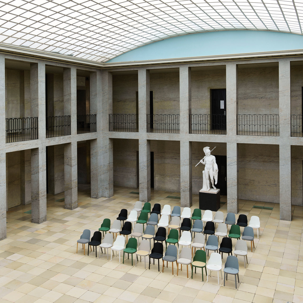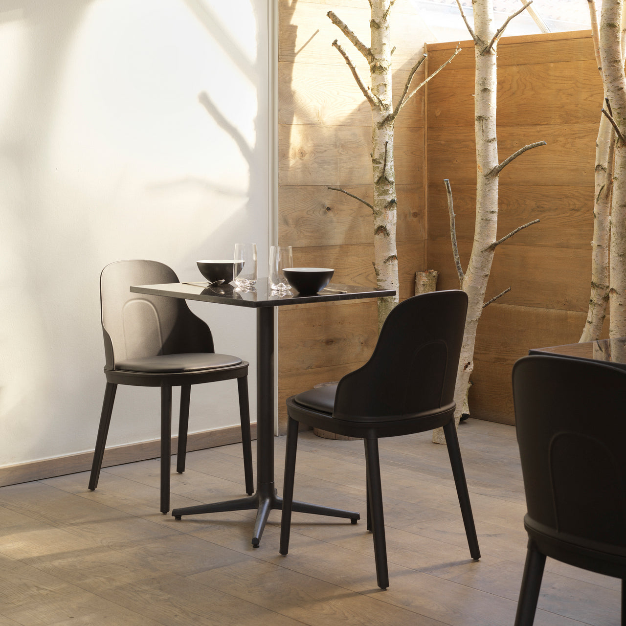 An upholstered seat heightens both the comfort level and the means to personalize Normann Copenhagen's updated café-style chair. Clad in a selection from a choice of fine fabric or leather, the cushioning complements Allez's curved shell with reinforced backrest in Simon Legald's design. The chair comes with a choice of matching plastic legs in a range of Nordic colors or in lacquered oak. Delivered sustainably flat-packed. (Assembly manual included.)