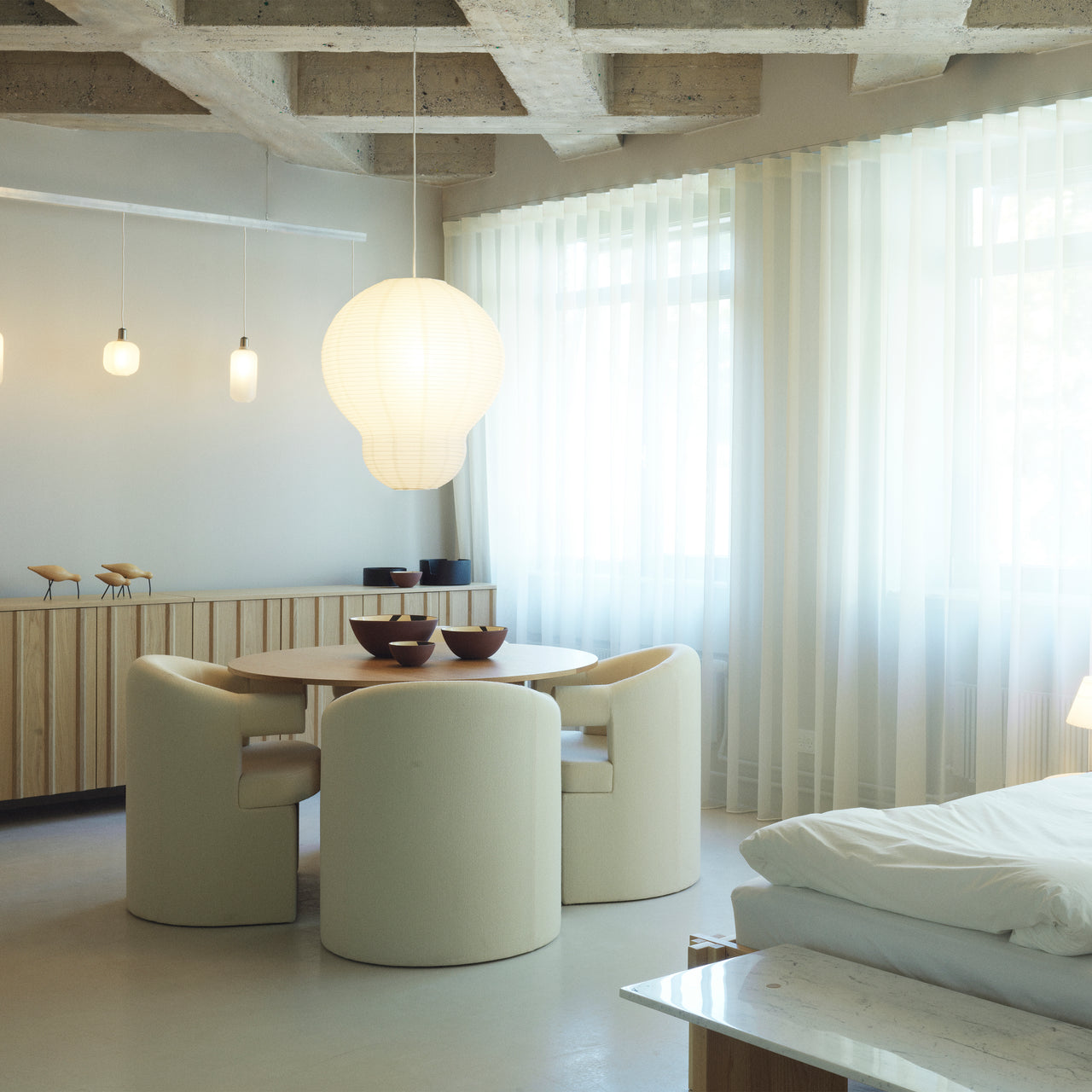 Burra’s fully padded contours imbue the collection’s dining chair with heavenly softness as well as a visually striking character. With a rounded seat and enveloping backrest, the completely upholstered seating is crafted from molded veneer fitted with PU foam for added softness, with the backrest tilted at a slight angle for optimal support and comfort.