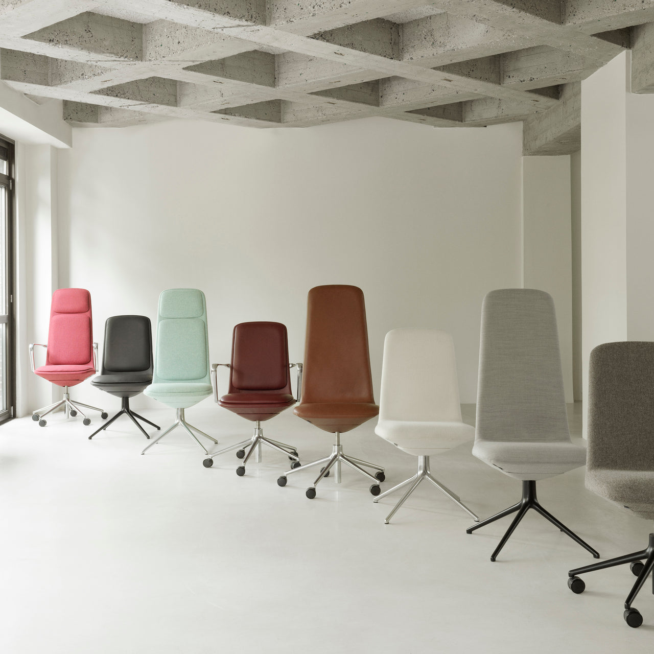 Cushioned seat pads add visual appeal as well as further comfort to Off’s high-back upholstered model equipped with swivel and tilt function and a 5-star wheeled base with gaslift. Ideal ergonomics and meticulous attention to detail underscore this task seating, clad in a custom selection of fabric or leather and PU foam with a steel reinforcement structure in versions with or without arms.