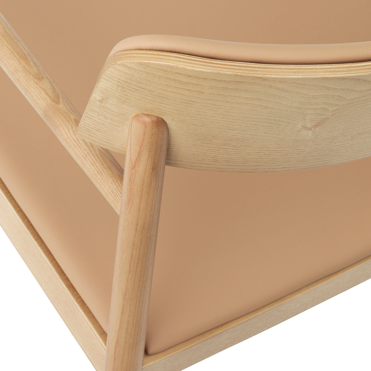 Sleek upholstery and convenient armrests distinguish this version of Normann Copenhagen's quintessential wood chair. Beautifully rendered in sustainably forested solid ash, Timb features a broad seat and armrest crafted in ash veneer with traditional dowel joinery that eliminates the need for any metal screws. Designer Simon Legald's seating comes in either neutral tan or black, clad in matte leather to match for a unified look that melds with many interior styles.