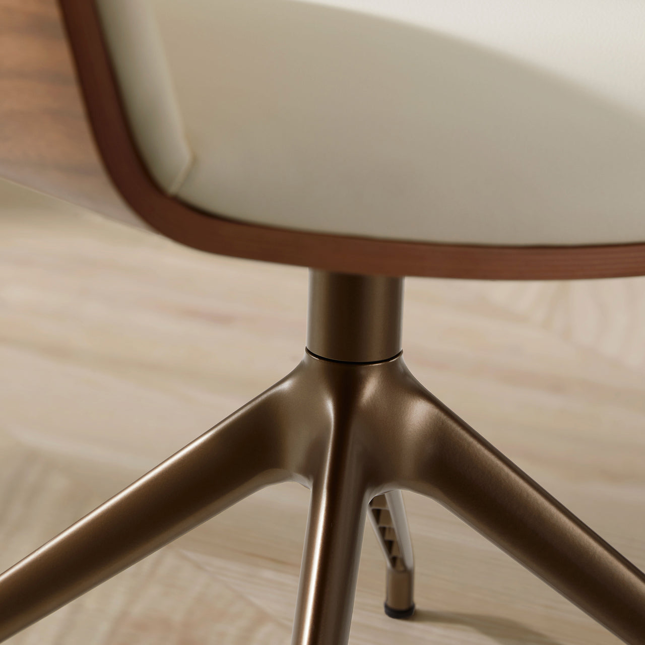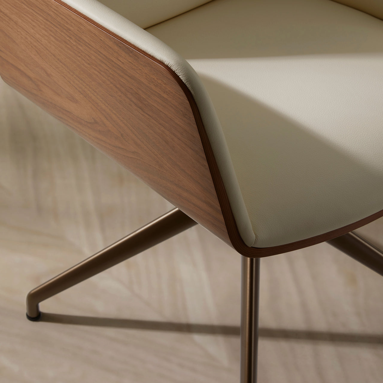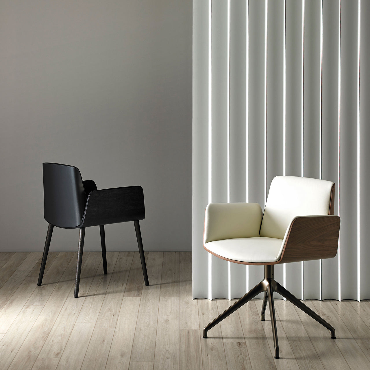High-end wood finishes and gleaming metals paired with luxurious custom interior upholstery bring impressive style to Punt’s swivel-base office mainstay. Estudi Manel Molina’s molded oak or walnut contours are paired with a custom front-facing fabric or leather selection over soft padding. Adding to the sleek look, a 4-point metal base comes in satin-finish lacquered black or bronze.
