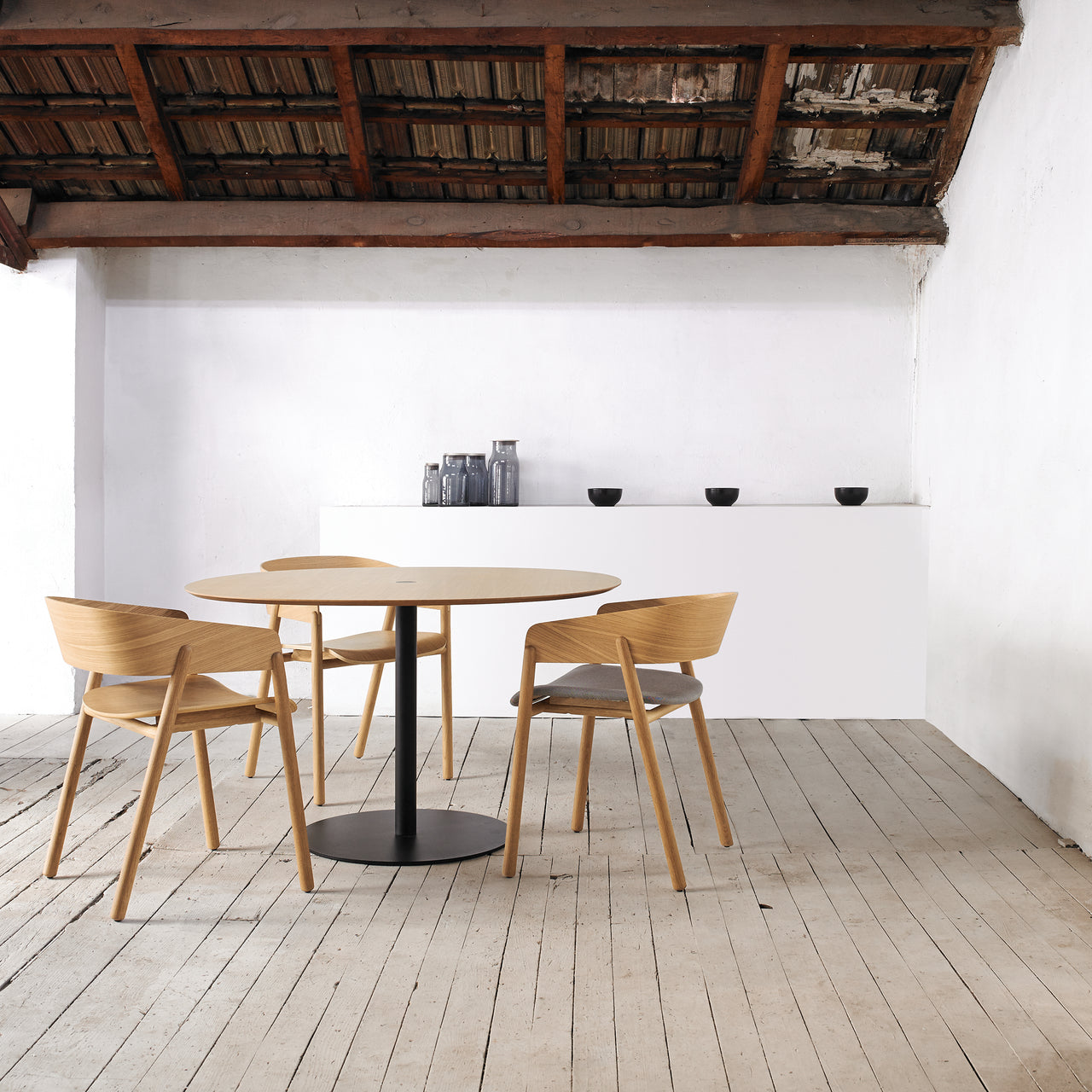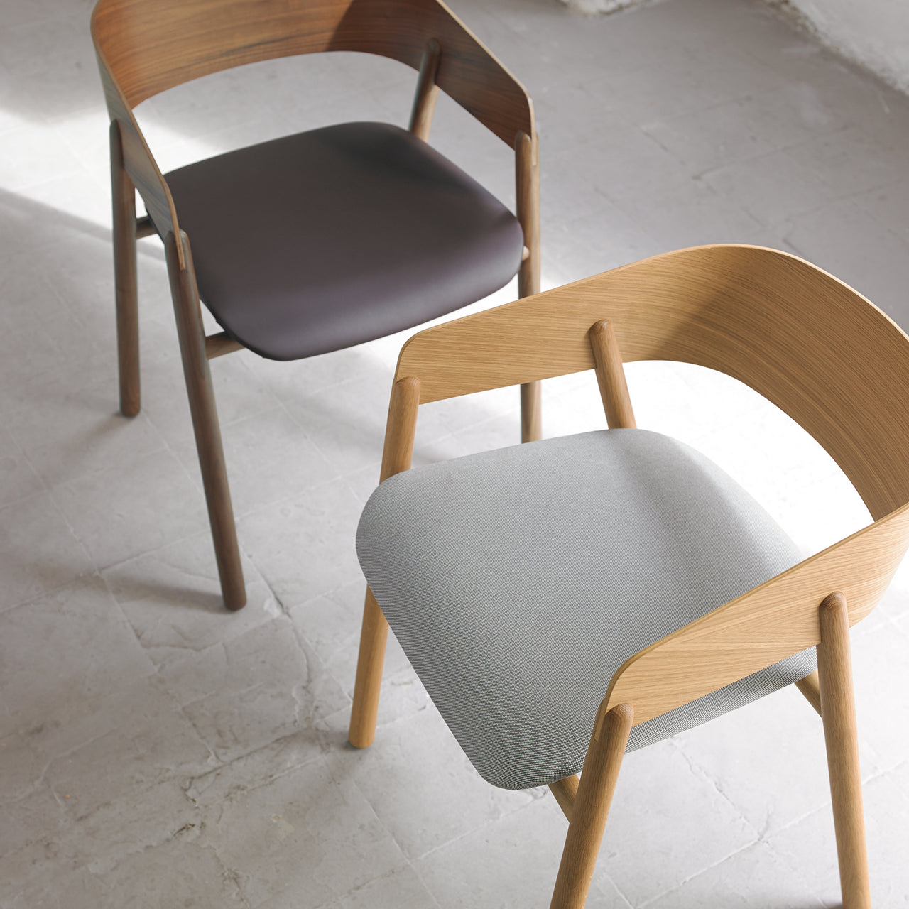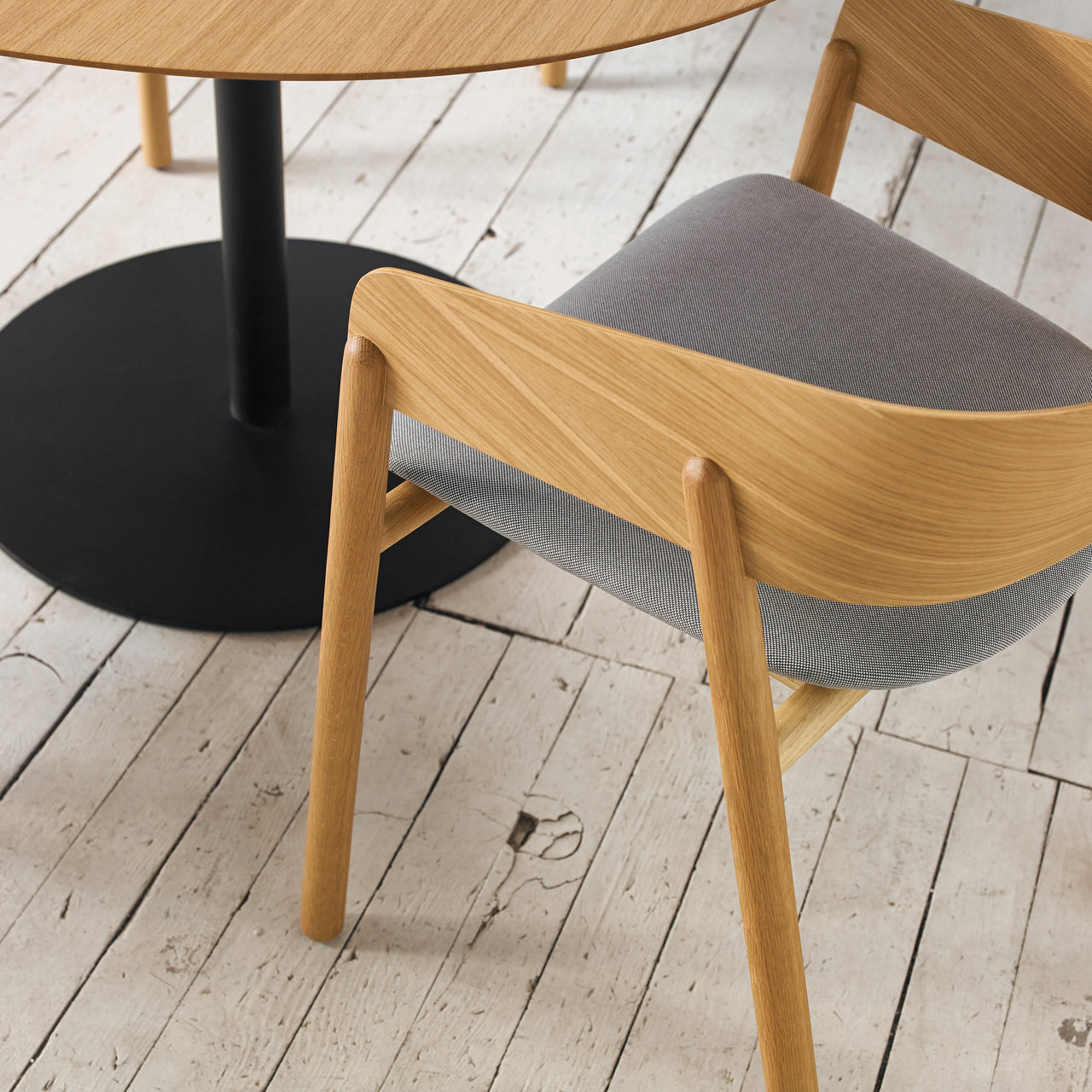 The Mava Armchair features a solid oak frame with a plywood seat and backrest. An upholstered seat enhances comfort. The chair comes fully assembled and includes plastic or felt glides to protect the flooring. Its robust yet lightweight design makes it suitable for both residential and commercial spaces.