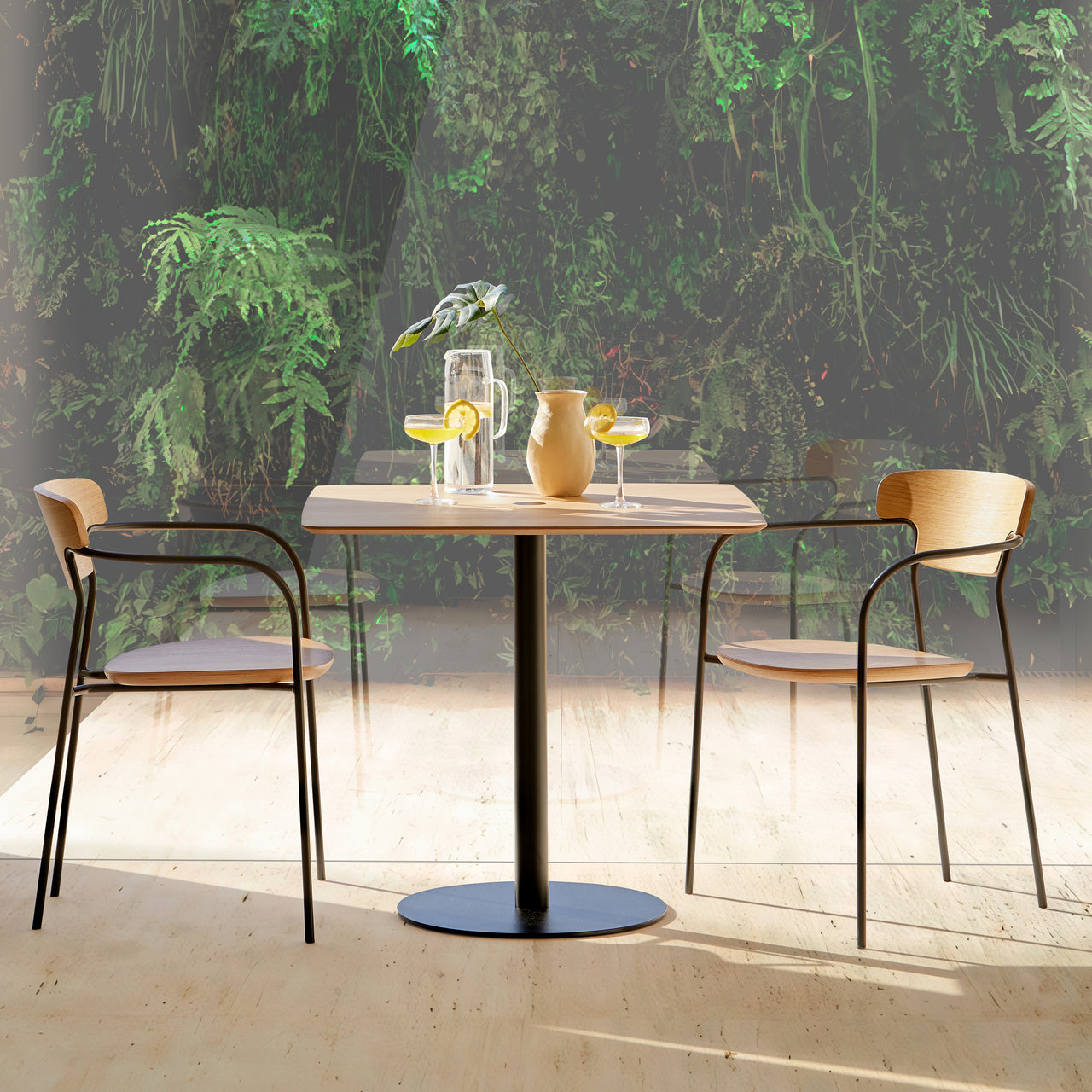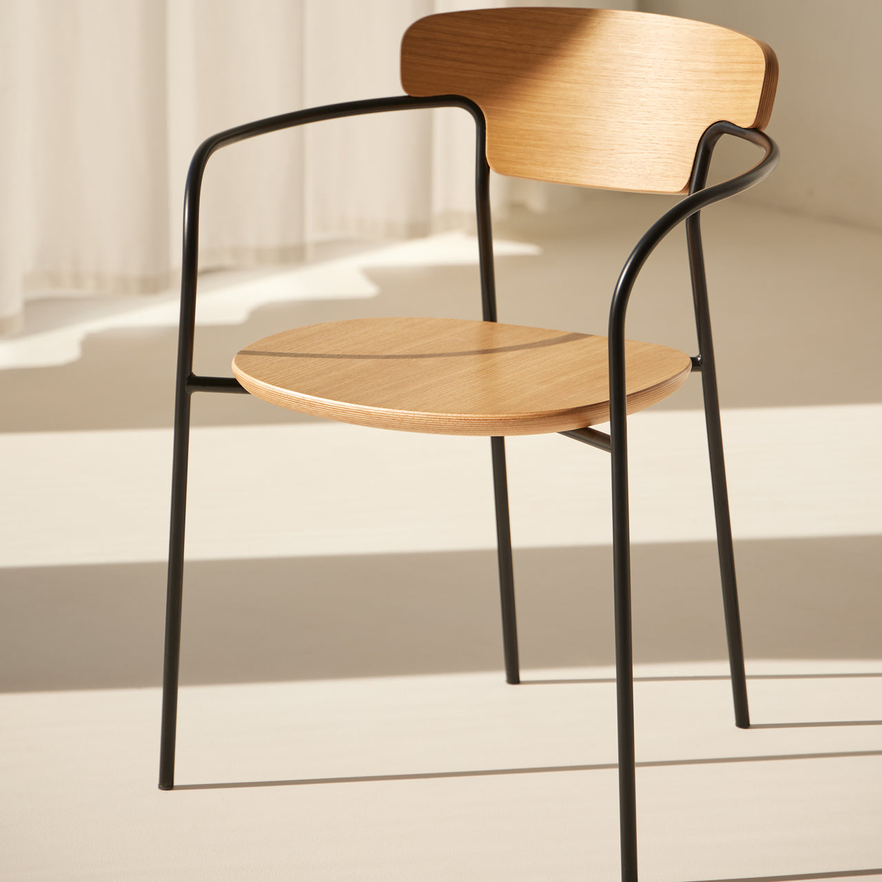 The Pecan Armchair features a slim black epoxy-lacquered steel frame that gracefully encircles the natural oak plywood seat and backrest. Its design draws inspiration from the organic shape of pecan nuts, evident in the rounded backrest. This chair is stackable up to four units, making it suitable for various settings, including living rooms, kitchens, restaurants, and offices. Sebastian Herkner, a German designer, is known for his ability to balance materials and proportions, creating minimalist designs with strong identities.
