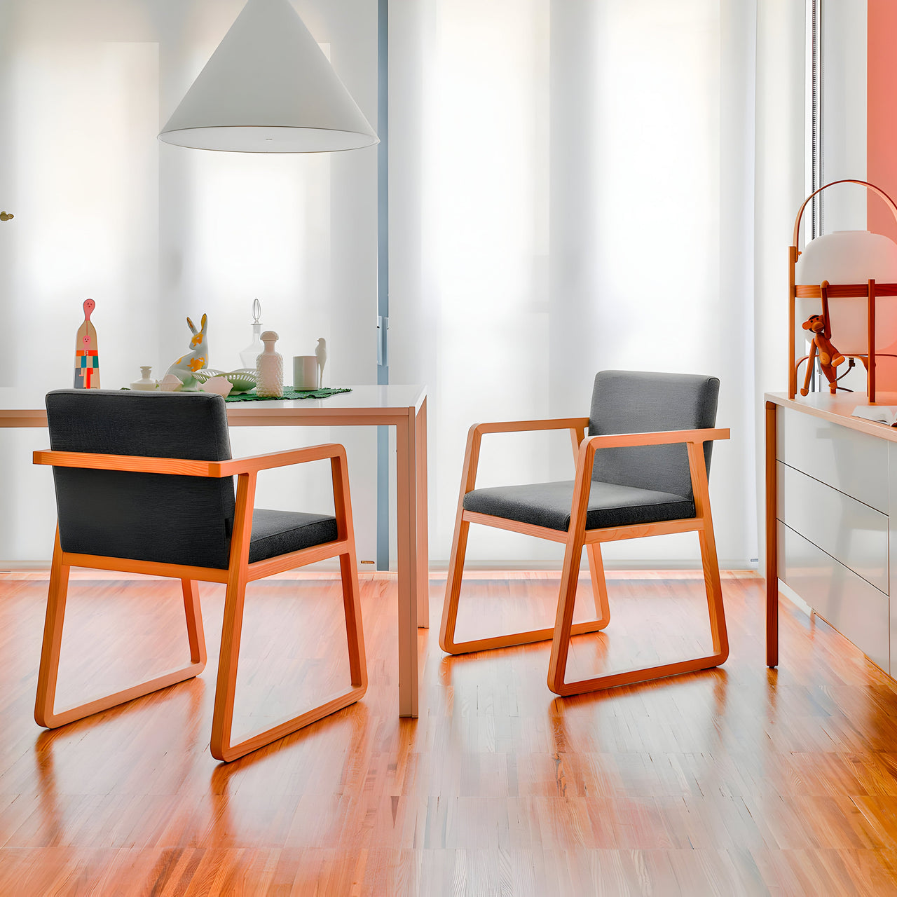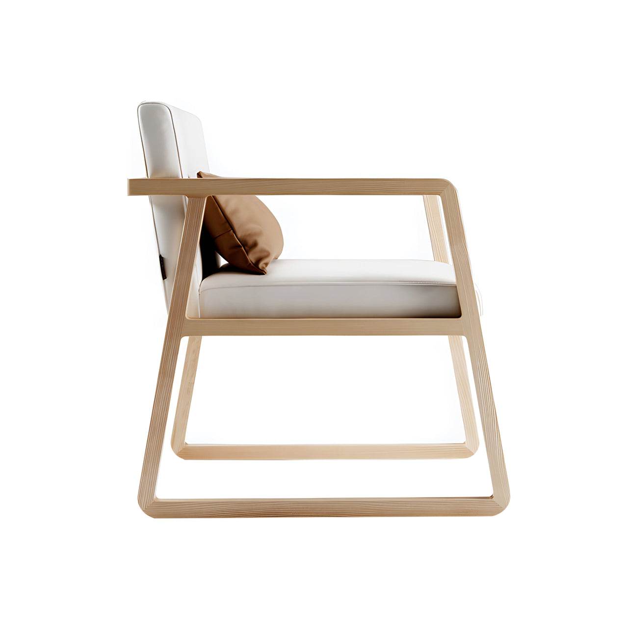 The Midori Small Armchair with Armrests, designed by the Ebualà, draws inspiration from the character Midori in Haruki Murakami's novel "Tokio Blues" (Norwegian Wood). This compact armchair features a solid ash wood frame that highlights the natural grain, available in 3 stain options. The seat and backrest are padded for comfort and can be upholstered in fabric, leather, or synthetic leather. A lumbar cushion enhances coziness.