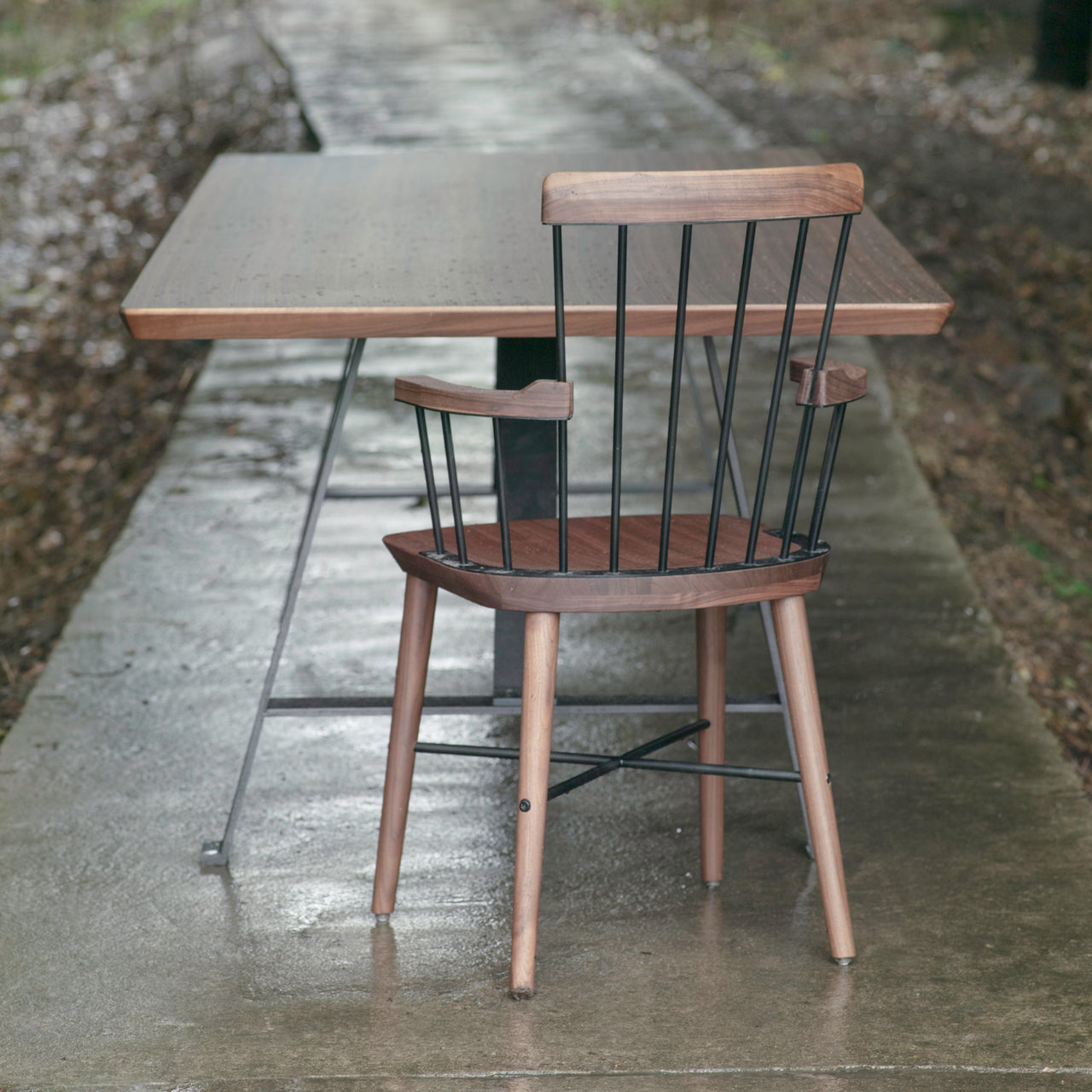 This highback version of designer Jun Aizaki's Exchange dining series further heightens the effect of replacing the traditional wood spindles of a Windsor chair with cutting-edge blackened steel. The Williamsburg-based founder of Brooklyn studio Crème takes a timeless furnishing and positions it firmly in a contemporary design idiom with this model in solid walnut and the steel. And the higher backrest also extends the seating's comfort level for leisurely mealtime conversations.