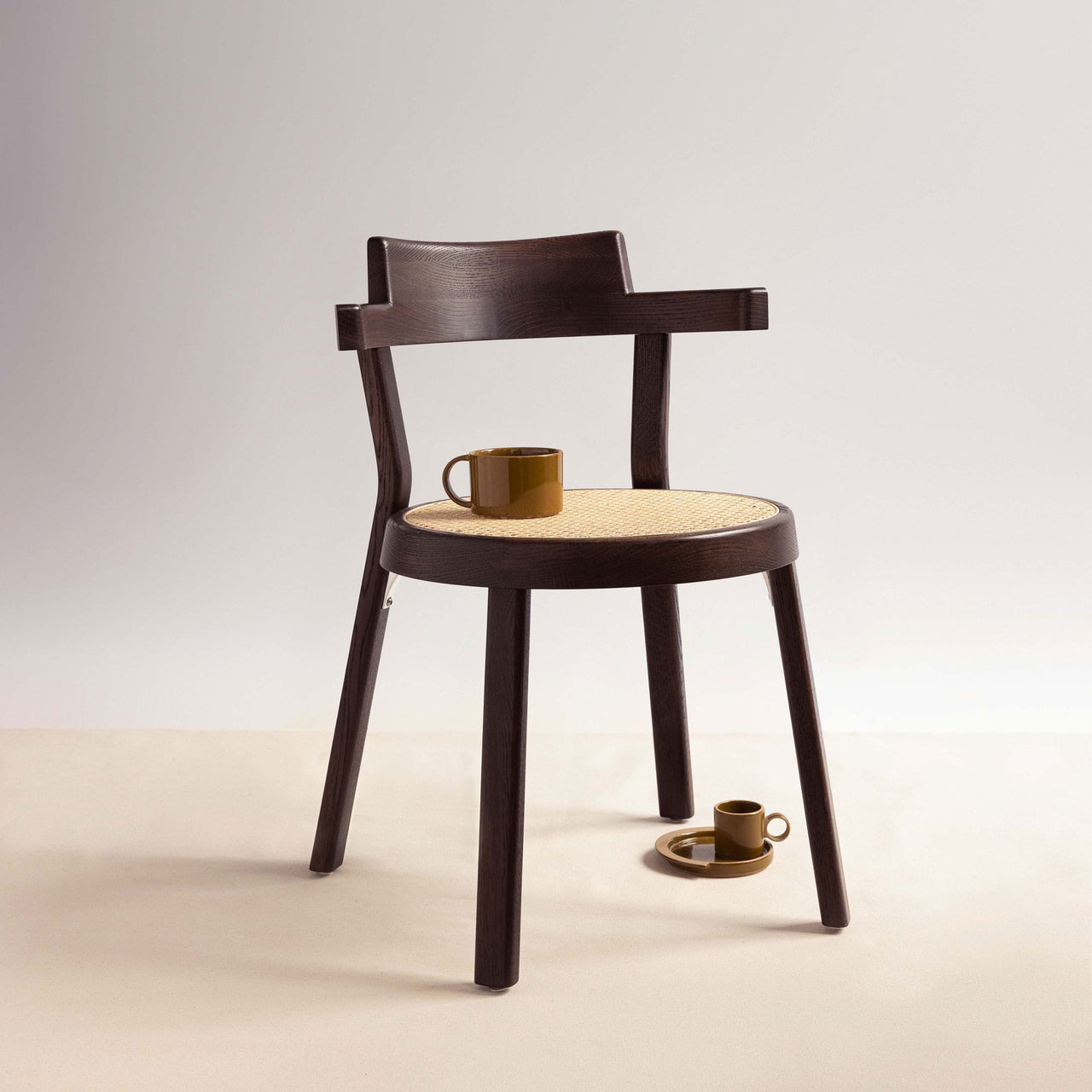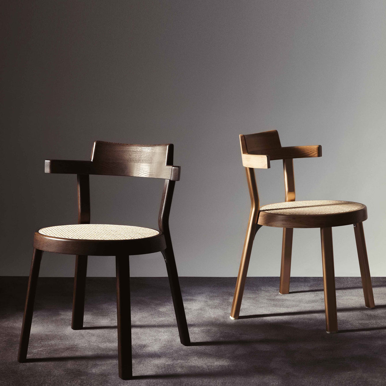 Inspired by classic café chairs of 19th century Vienna, Pagoda also looks to the East in a wood variant that features a round seat in traditional woven cane. BassamFellows base the chair's structure on the suggestion of pagoda gates in the cantilevered arms and back, removing the need for a separate armchair and offering well-supported comfort. Striking finish options for the beautifully crafted seating in solid oak or walnut place it firmly in a modernist vernacular, apropos to a wide range of interiors.