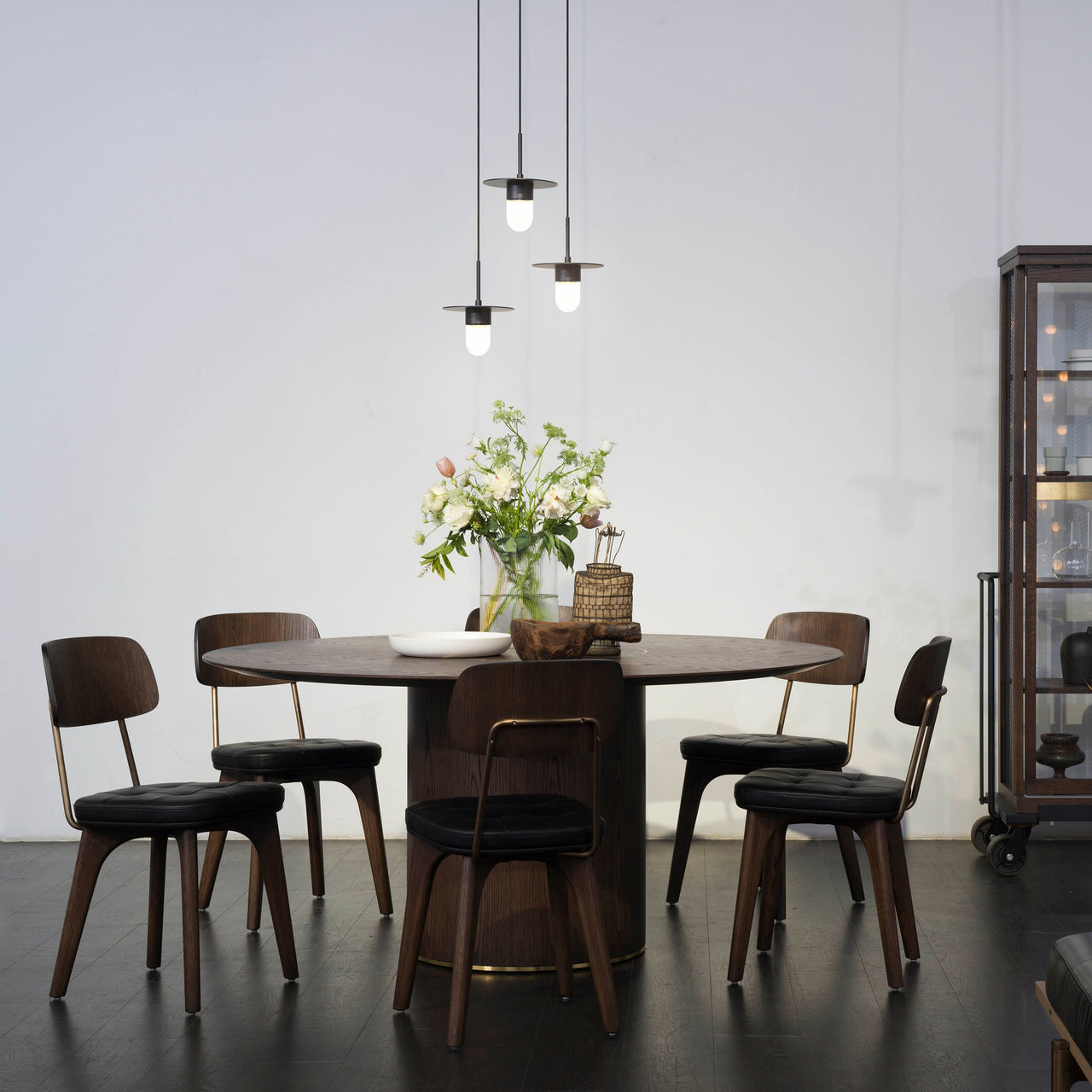 An amalgam of East and West motifs with a decidedly industrial sensibility—that mindset characterizes the uniquely minimalist Utility series from creative directors Lyndon Neri and Rossana Hu of Stellar Works. In Chair V, a curved solid wood backrest harmonizes with the similarly shaped wood legs while the upholstered seat ups the comfort level. The brass-finished stainless framework is an aptly luxe counterpart to the available upholstery choices in a selection of fine textiles or rich leather.